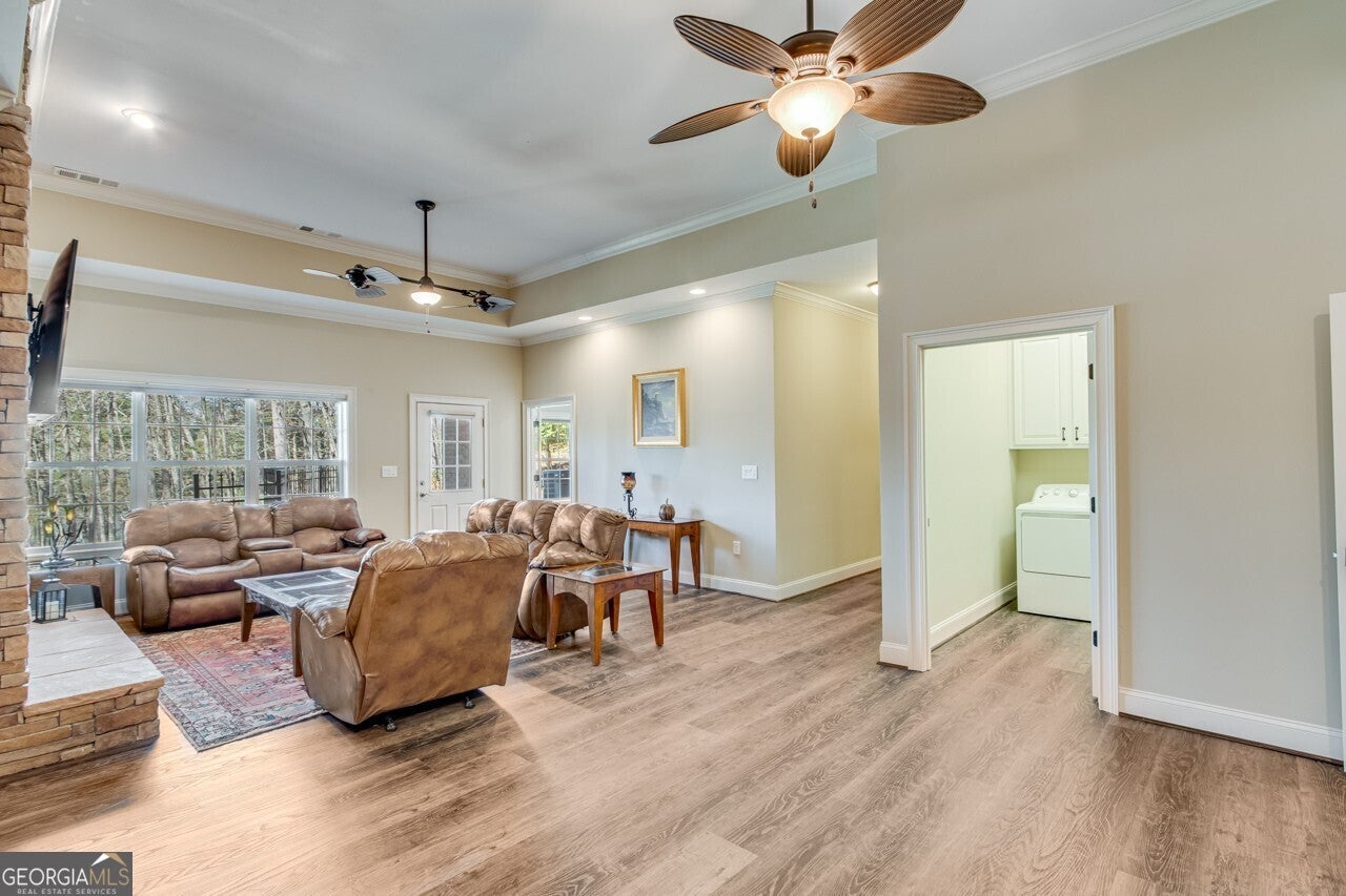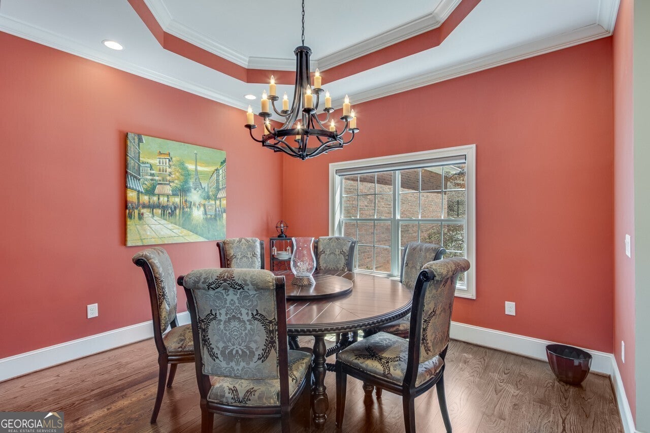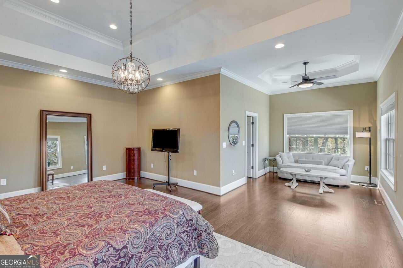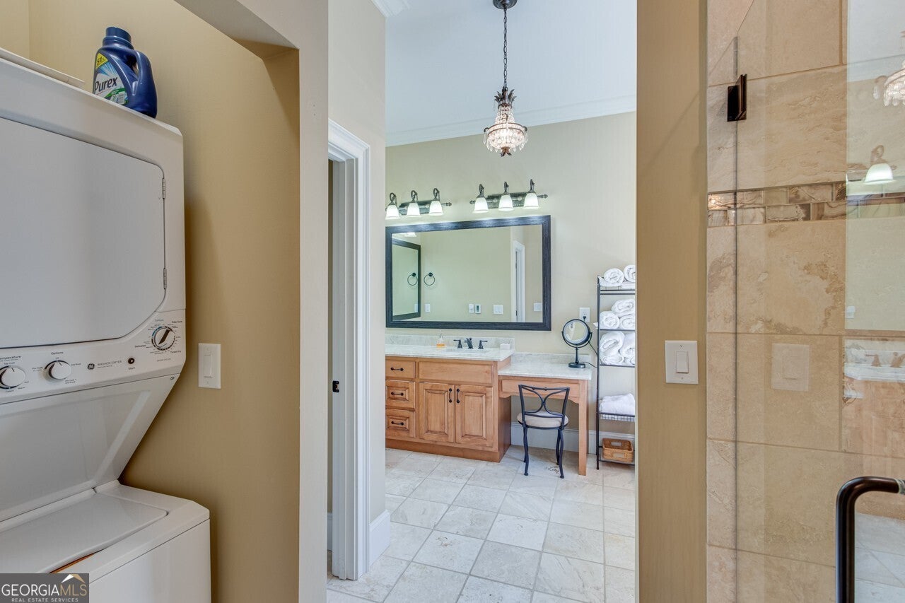 This elegant, traditional Lake Lanier home has everything you need for fine lake living! Conveniently located just 10 minutes from downtown Gainesville, The Rowing Venue, the hospital district, shopping, and restaurants, this home is designed for the ultimate lakefront lifestyle. With stunning lake views from most rooms, it also features a paved path leading to a single-slip party dock in deep, calm, no-wake waters-perfect for lounging and swimming. Situated on a double lot with a low CORPS line, the property offers a circular driveway and abundant parking, along with a drive-around access to the lower-level double garage-ideal for a golf cart, boat toys, a workshop, and extra storage. Inside, the main floor boasts an open layout with all hardwood floors. The great room, featuring a striking stone wood-burning fireplace, flows seamlessly into the kitchen, which includes granite countertops, a double gas range, and high-end Thermador appliances. A dining room and a study/office complete this space. The oversized primary suite is a true retreat, featuring a sitting area, double custom closets (one with a double-stack washer/dryer), heated travertine tile floors, a jacuzzi tub, a spacious shower, and double granite vanities. Additionally, the main level includes a second ensuite bedroom, a powder room, and a large laundry room. Upstairs, you'll find a guest bedroom, a full bath, and a large bonus room over the garage. The beautifully finished terrace level, completed in 2015, offers luxury vinyl flooring, a family room with a second stone wood-burning fireplace, a full kitchen with all appliances, a dining area, a large game room, a full guest bath, and an ensuite with its own private bath-perfect for entertaining or multi-generational living. Every bathroom is equipped with heated travertine tile floors, and the home features only hardwood and luxury vinyl flooring-no carpet. This exceptional Lake Lanier property combines elegance, functionality, and the best in lakeside living!