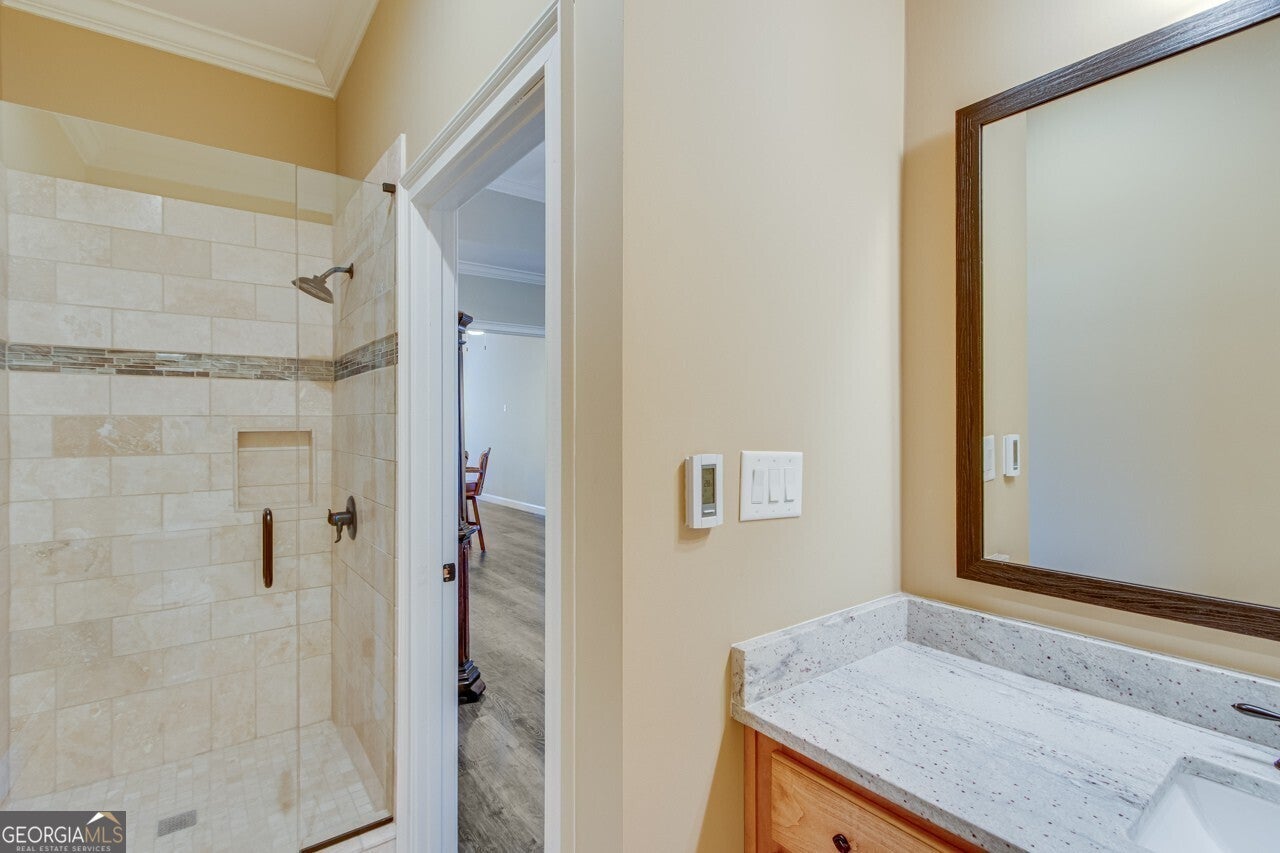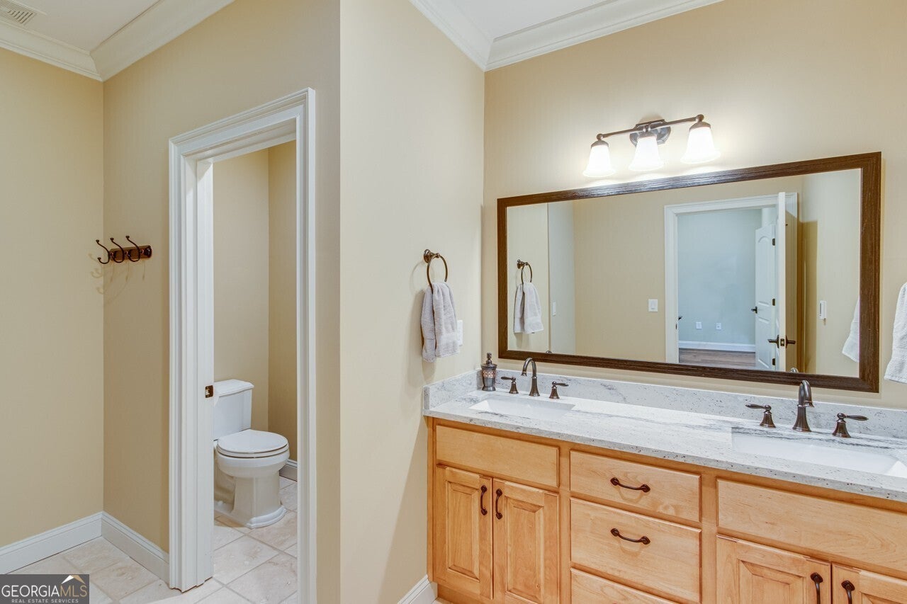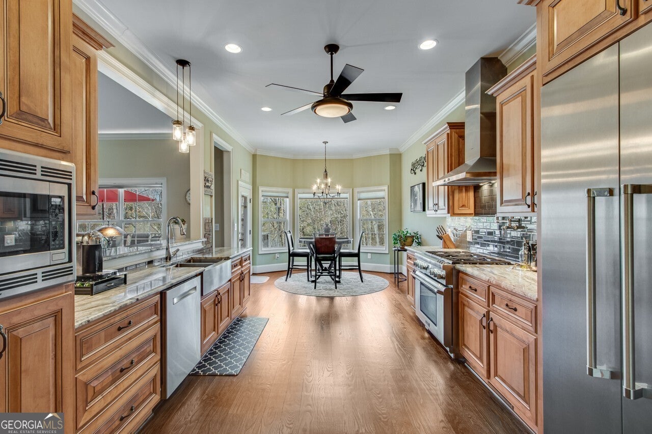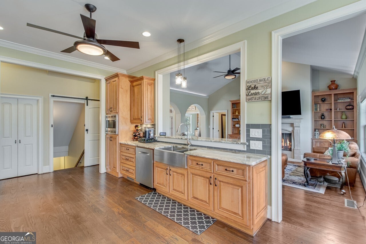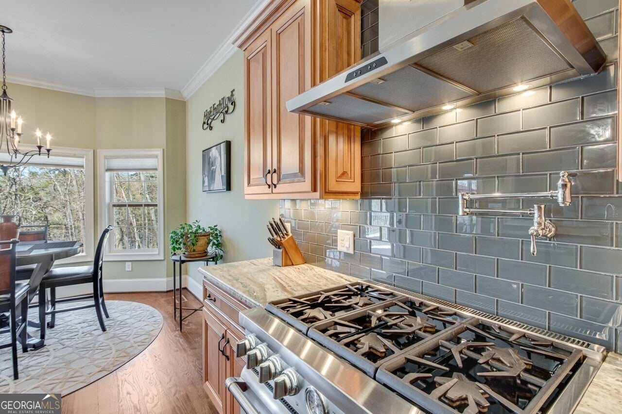 This elegant, traditional Lake Lanier home has everything you need for fine lake living! Conveniently located just 10 minutes from downtown Gainesville, The Rowing Venue, the hospital district, shopping, and restaurants, this home is designed for the ultimate lakefront lifestyle. With stunning lake views from most rooms, it also features a paved path leading to a single-slip party dock in deep, calm, no-wake waters-perfect for lounging and swimming. Situated on a double lot with a low CORPS line, the property offers a circular driveway and abundant parking, along with a drive-around access to the lower-level double garage-ideal for a golf cart, boat toys, a workshop, and extra storage. Inside, the main floor boasts an open layout with all hardwood floors. The great room, featuring a striking stone wood-burning fireplace, flows seamlessly into the kitchen, which includes granite countertops, a double gas range, and high-end Thermador appliances. A dining room and a study/office complete this space. The oversized primary suite is a true retreat, featuring a sitting area, double custom closets (one with a double-stack washer/dryer), heated travertine tile floors, a jacuzzi tub, a spacious shower, and double granite vanities. Additionally, the main level includes a second ensuite bedroom, a powder room, and a large laundry room. Upstairs, you'll find a guest bedroom, a full bath, and a large bonus room over the garage. The beautifully finished terrace level, completed in 2015, offers luxury vinyl flooring, a family room with a second stone wood-burning fireplace, a full kitchen with all appliances, a dining area, a large game room, a full guest bath, and an ensuite with its own private bath-perfect for entertaining or multi-generational living. Every bathroom is equipped with heated travertine tile floors, and the home features only hardwood and luxury vinyl flooring-no carpet. This exceptional Lake Lanier property combines elegance, functionality, and the best in lakeside living!