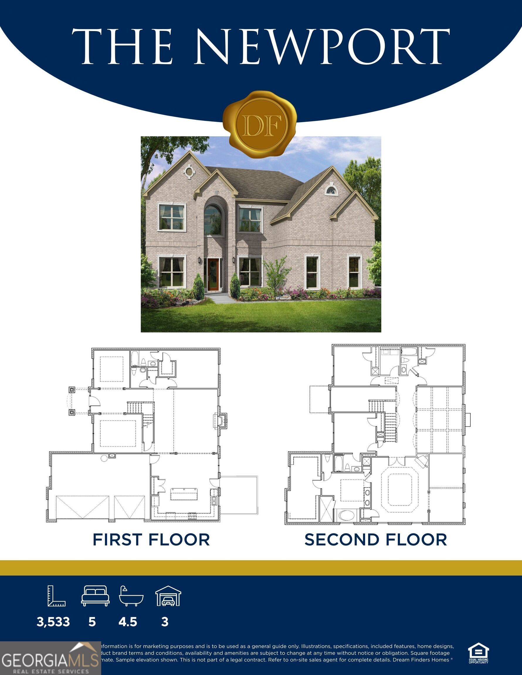 The Newport Plan features 5 bedrooms/ 4.5 baths, a three-car garage, and 4 sides brick. On the main level are a formal living room, dining room, 2-story family room w/ coffered ceilings, kitchen cabinets w/ granite countertops, tile backsplash, large kitchen island, pantry, gourmet stainless appliances, hardwood floors, a half bath, and a bedroom with full bath. Stairs w/ oak handrails with wrought iron spindles lead upstairs. 2nd floor features an enormous primary suite w/ a sitting room, two secondary bedrooms, and two full baths. This home also has an unfinished basement.