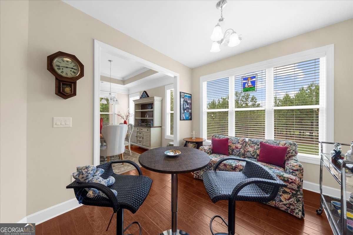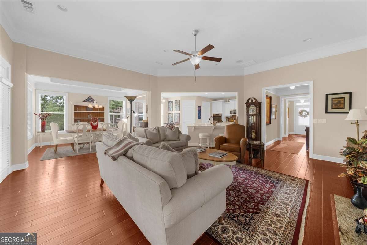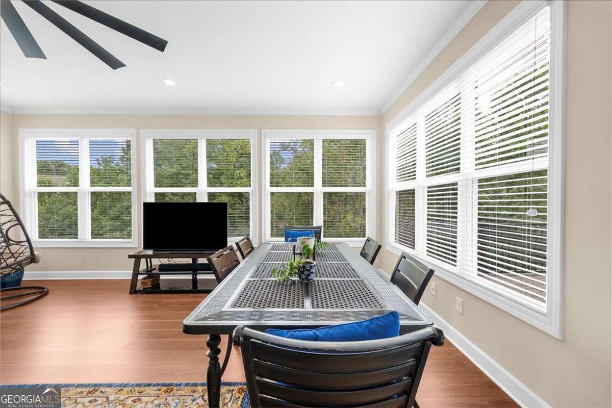 Welcome to the award-winning 55+ community of Cresswind at Lake Lanier. Located on a private cul-de-sac premium lot, the "Maple" model shows pride of ownership throughout. Featuring 3 bedrooms, 2.5 baths, 2,674 sq ft of main floor living space, and an additional 2,314 sq ft of unfinished terrace level space. Notable interior details include hardwood floors, upgraded crown molding, and upgraded baseboards. The crown jewel of the home is the enclosed 360 sq ft sunroom which is surrounded by windows overlooking the trees, equipped with a built-in speaker system, and is heated and cooled with a split system for year-round enjoyment. Adjacent to the sunroom is a Trex deck suitable for grilling and outdoor activities. The great room offers open concept living with a gas fireplace, built-in speaker system, and spacious dining area with custom window placement to accommodate placement for a buffet or cabinet. The kitchen includes white cabinets, beadboard accents, granite countertops, Advantium halogen microwave, built-in oven, breakfast area, prep island, and walk-in pantry. The primary bedroom suite offers views of the trees, built-in speaker system, walk-in closet, jet tub, frameless shower enclosure, and vanity with dual sinks. The second and third bedrooms share a Jack and Jill bathroom with a tub/shower combination; the third bedroom has custom window placement, built-in speaker system and was used as an office. The unfinished terrace level is stubbed for a bath and may be finished for additional living space or used for storage. There is access to a back patio and backyard which is maintained by the HOA. Additional upgrades include concrete resurfacing of the front walkway and porch, extended driveway, security system with exterior cameras, Rachio "smart" irrigation system, new HVAC (June 2023), and new dehumidifier (July 2025). The award-winning Cresswind at Lake Lanier boasts a 43,000 sq ft, 3-story clubhouse with indoor and outdoor pools, kayaking, fishing, courtesy boat docks, over 120 clubs, arts & crafts room, pickleball, tennis, indoor & outdoor pools, gym, dance & fitness classes, poker, games, billiards, plays, chorus, concerts, dances and more! An on-site activities director, property manager and maintenance crew keep everything running smoothly. The residents are welcoming, friendly and anxious to include new neighbors in all the activities! I have lived at Cresswind at Lake Lanier for 12 years and I know you will enjoy the Cresswind lifestyle!