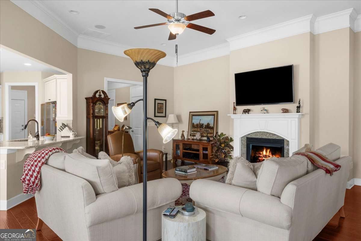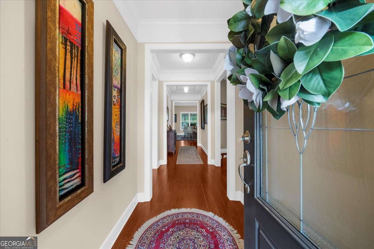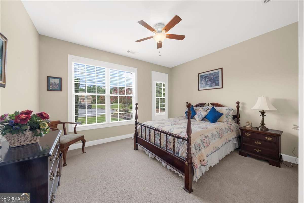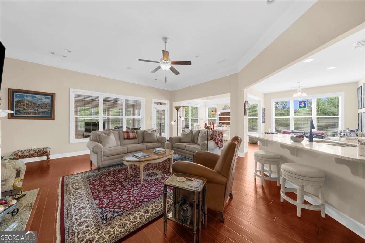Welcome to the award-winning 55+ community of Cresswind at Lake Lanier. Located on a private cul-de-sac premium lot, the "Maple" model shows pride of ownership throughout. Featuring 3 bedrooms, 2.5 baths, 2,674 sq ft of main floor living space, and an additional 2,314 sq ft of unfinished terrace level space. Notable interior details include hardwood floors, upgraded crown molding, and upgraded baseboards. The crown jewel of the home is the enclosed 360 sq ft sunroom which is surrounded by windows overlooking the trees, equipped with a built-in speaker system, and is heated and cooled with a split system for year-round enjoyment. Adjacent to the sunroom is a Trex deck suitable for grilling and outdoor activities. The great room offers open concept living with a gas fireplace, built-in speaker system, and spacious dining area with custom window placement to accommodate placement for a buffet or cabinet. The kitchen includes white cabinets, beadboard accents, granite countertops, Advantium halogen microwave, built-in oven, breakfast area, prep island, and walk-in pantry. The primary bedroom suite offers views of the trees, built-in speaker system, walk-in closet, jet tub, frameless shower enclosure, and vanity with dual sinks. The second and third bedrooms share a Jack and Jill bathroom with a tub/shower combination; the third bedroom has custom window placement, built-in speaker system and was used as an office. The unfinished terrace level is stubbed for a bath and may be finished for additional living space or used for storage. There is access to a back patio and backyard which is maintained by the HOA. Additional upgrades include concrete resurfacing of the front walkway and porch, extended driveway, security system with exterior cameras, Rachio "smart" irrigation system, new HVAC (June 2023), and new dehumidifier (July 2025). The award-winning Cresswind at Lake Lanier boasts a 43,000 sq ft, 3-story clubhouse with indoor and outdoor pools, kayaking, fishing, courtesy boat docks, over 120 clubs, arts & crafts room, pickleball, tennis, indoor & outdoor pools, gym, dance & fitness classes, poker, games, billiards, plays, chorus, concerts, dances and more! An on-site activities director, property manager and maintenance crew keep everything running smoothly. The residents are welcoming, friendly and anxious to include new neighbors in all the activities! I have lived at Cresswind at Lake Lanier for 12 years and I know you will enjoy the Cresswind lifestyle!