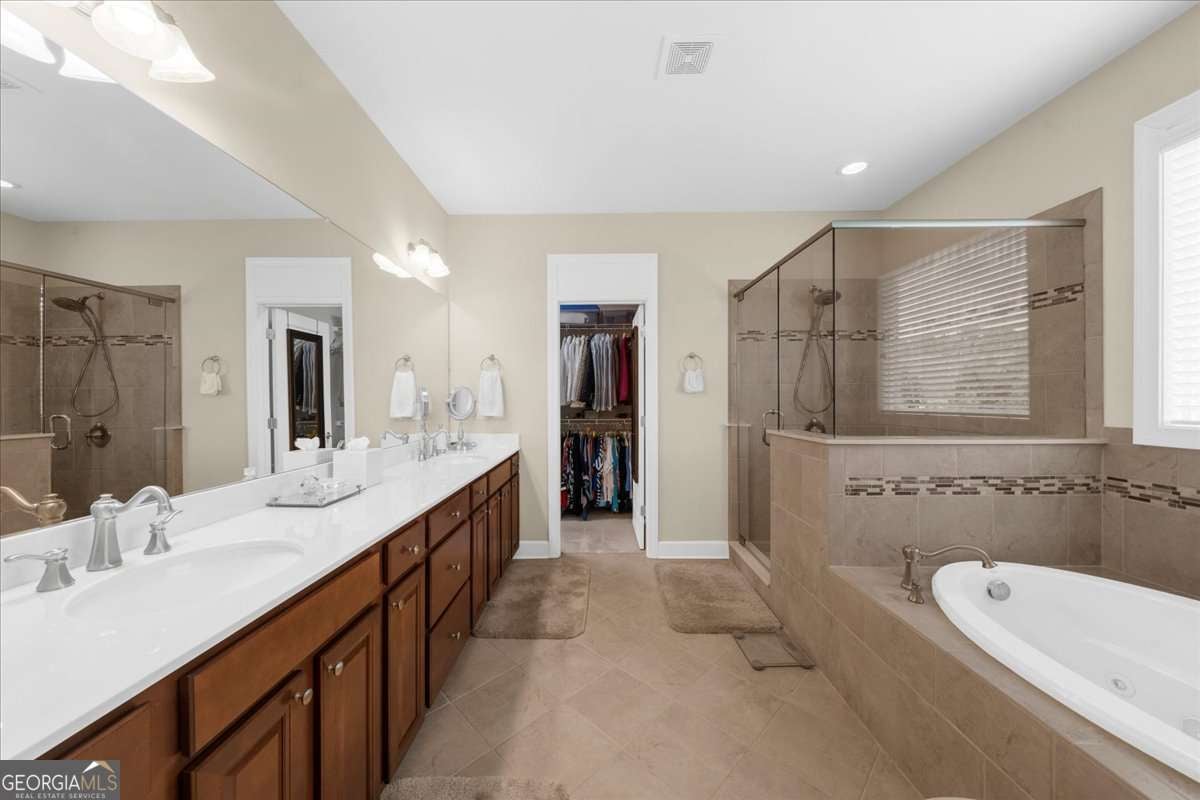 - Interior FeaturesDouble Vanity, High Ceilings, Master On Main Level, Separate Shower, Soaking Tub, Split Bedroom Plan, Tile Bath, Tray Ceiling(s), Walk-In Closet(s)
