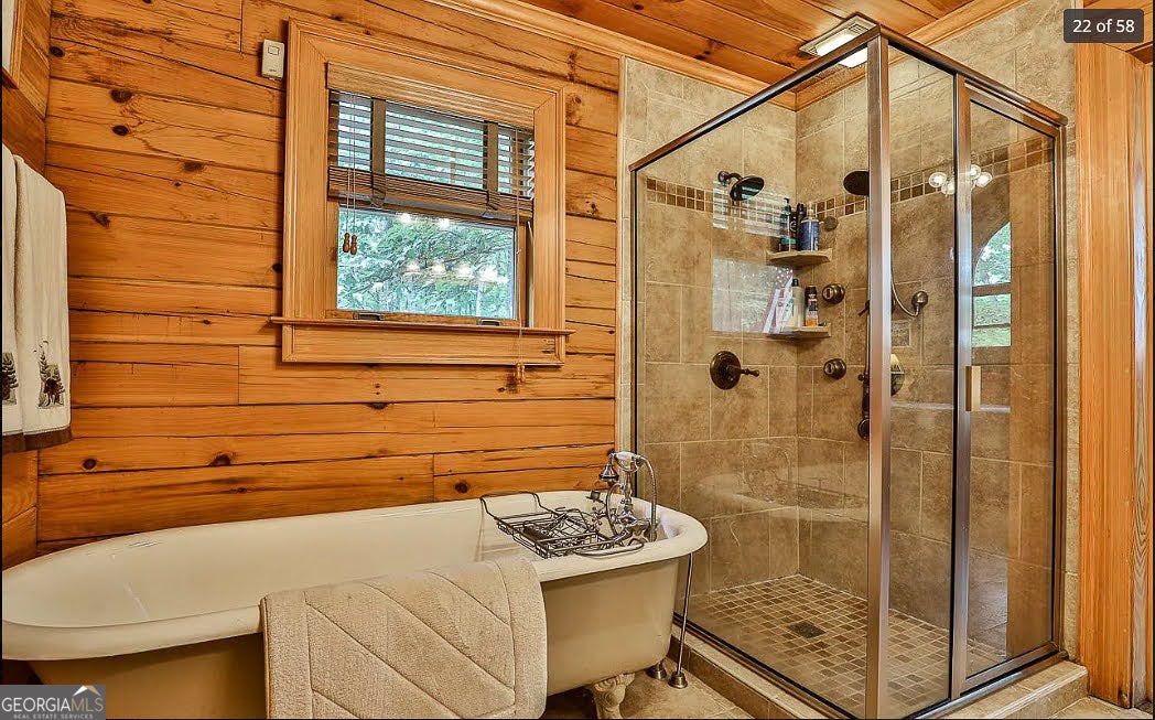 - Interior FeaturesHigh Ceilings, Master On Main Level, Separate Shower, Vaulted Ceiling(s), Beamed Ceilings, Two Story Foyer, Soaking Tub, Rear Stairs, Tile Bath