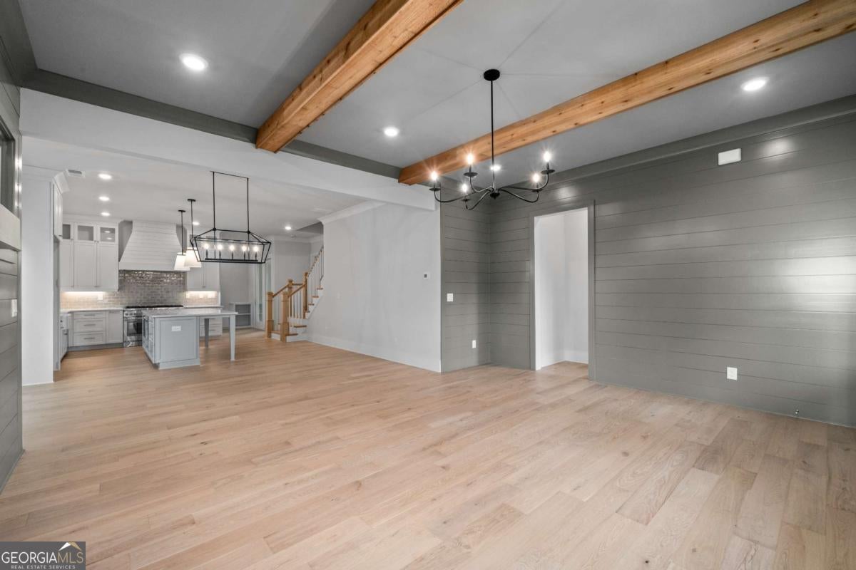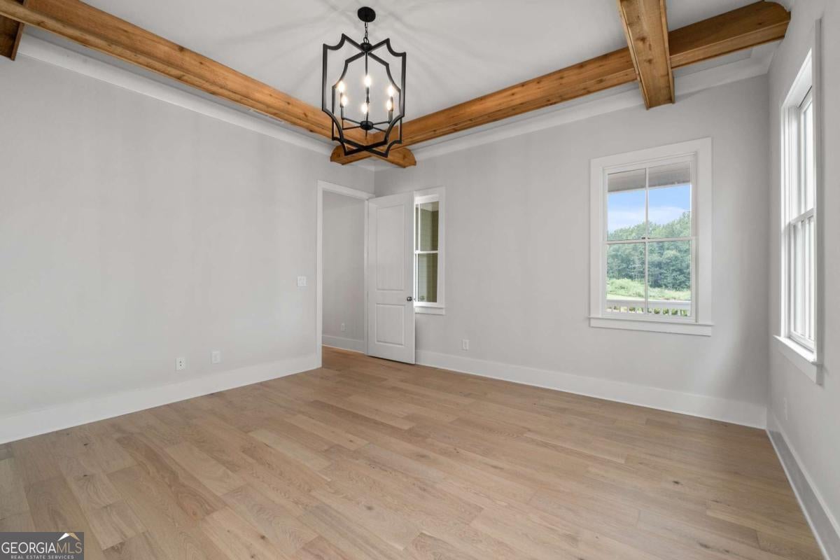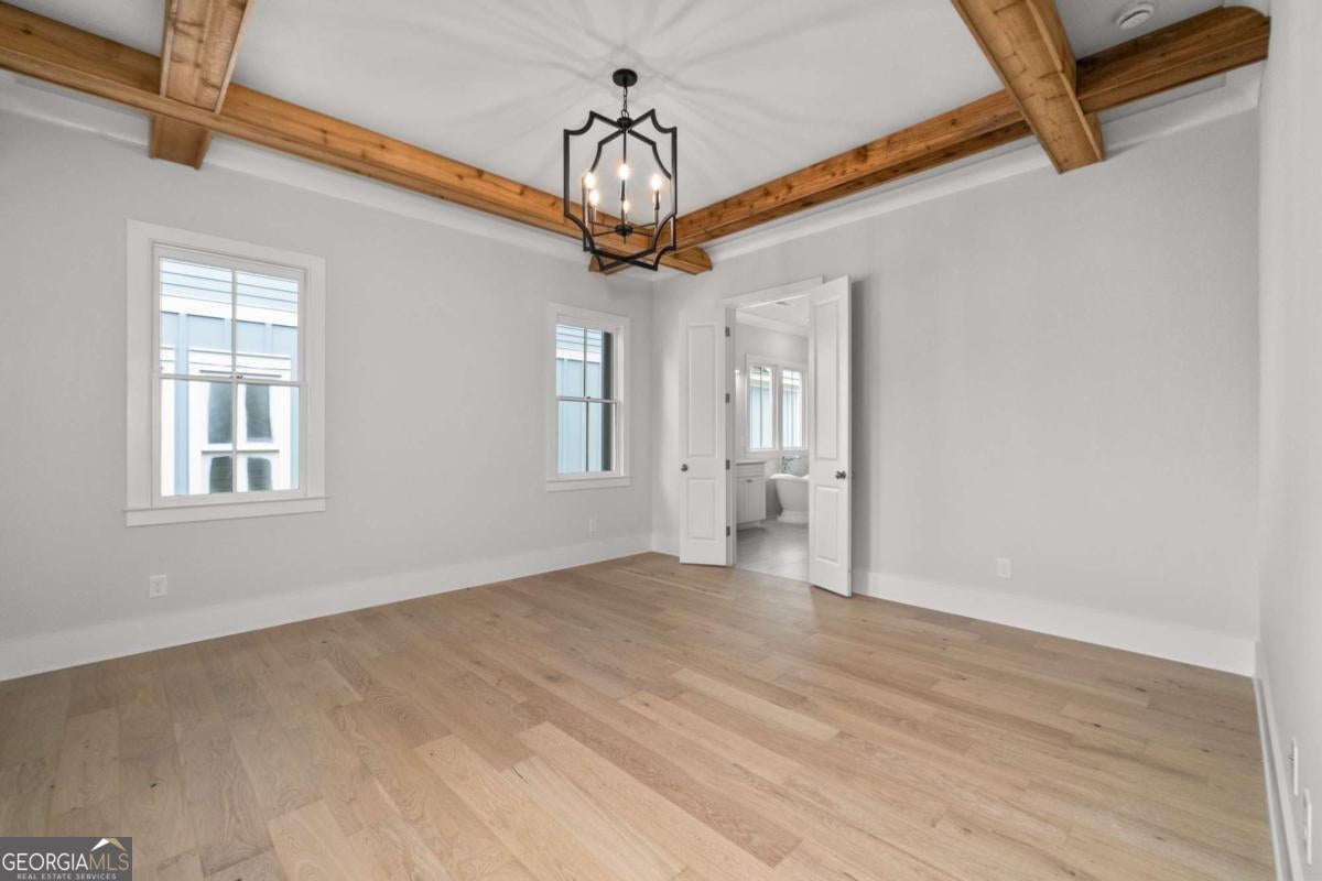 - Interior FeaturesBeamed Ceilings, Double Vanity, High Ceilings, Master On Main Level, Walk-In Closet(s), Pulldown Attic Stairs, Soaking Tub, Tile Bath