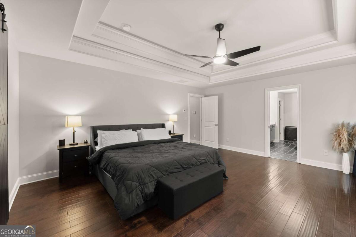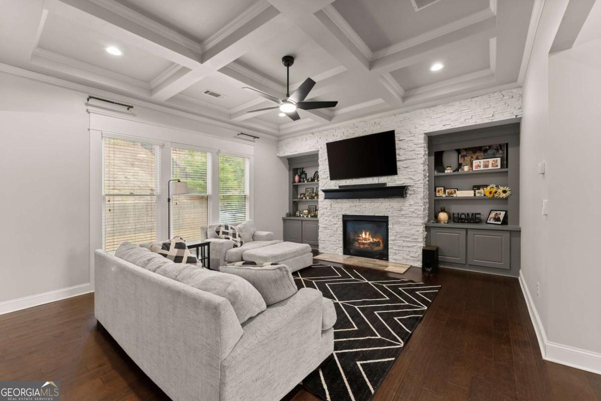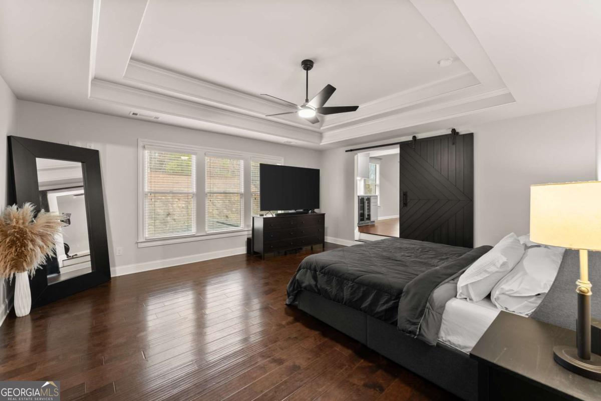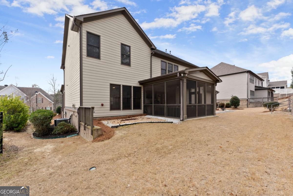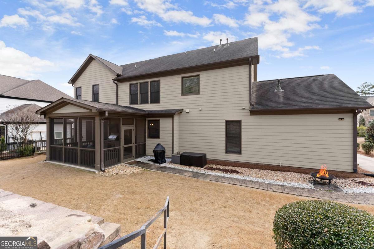 This stunning home is situated in the highly sought-after Sterling on the Lake neighborhood! Upon entry, you'll be welcomed into an open floor plan featuring gleaming hardwood floors throughout. French doors open into a bright study or office space, while across the hall, a spacious dining room accommodates up to 12 guests. Down the hallway, you'll discover a custom mudroom, along with a full bedroom and bath-ideal for guests. The chef-inspired kitchen boasts a large central island and premium upgrades, seamlessly connecting to the inviting living room, making it perfect for entertaining. The living room features elegant coffered ceilings, a cozy fireplace, and built-in bookshelves. Upstairs, the oversized master suite offers tray ceilings, a spacious double vanity, a makeup area, and a luxurious soaking tub. The master bath also includes a large open shower with dual showerhead's', and the home's tankless water heater ensures an endless supply of hot water. Adjacent to the master bedroom, a private living area complete with a wet bar, wine fridge, and drink cooler offers the perfect retreat. The upper level also includes three additional bedrooms, each with walk-in closets, and two full baths. Step outside to enjoy a screened-in porch and a staircase leading to a charming fire pit area, perfect for cozy evenings. you will also be able to enjoy plenty of parking with a 3 car garage, parking pad and large driveway. This home is located in a neighborhood brimming with amenities, including a clubhouse with a lodge, a theater, 24-hour gym, four pools, tennis and pickleball courts, walking and nature trails, playgrounds, a lake with a fishing dock, and a full-time activities director to ensure there's always something to enjoy throughout the year! Owner is a licensed real estate agent.