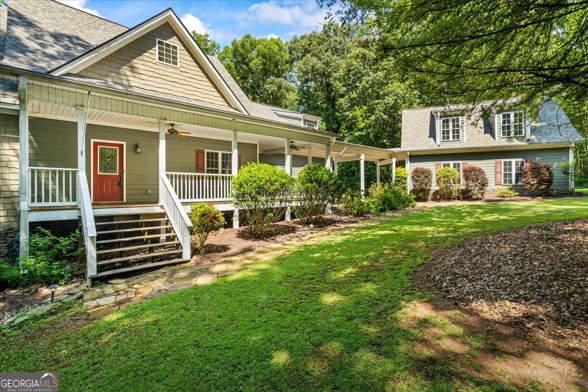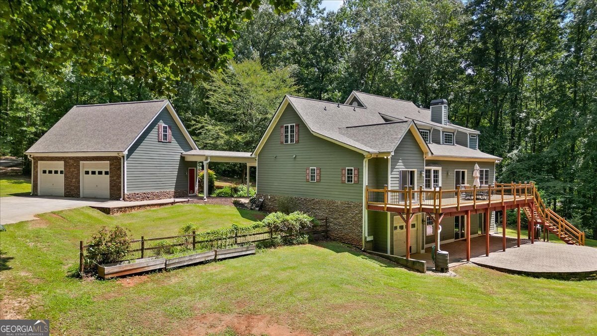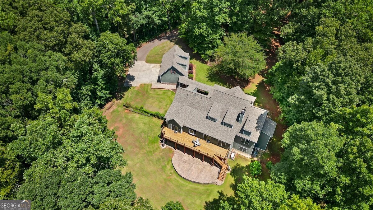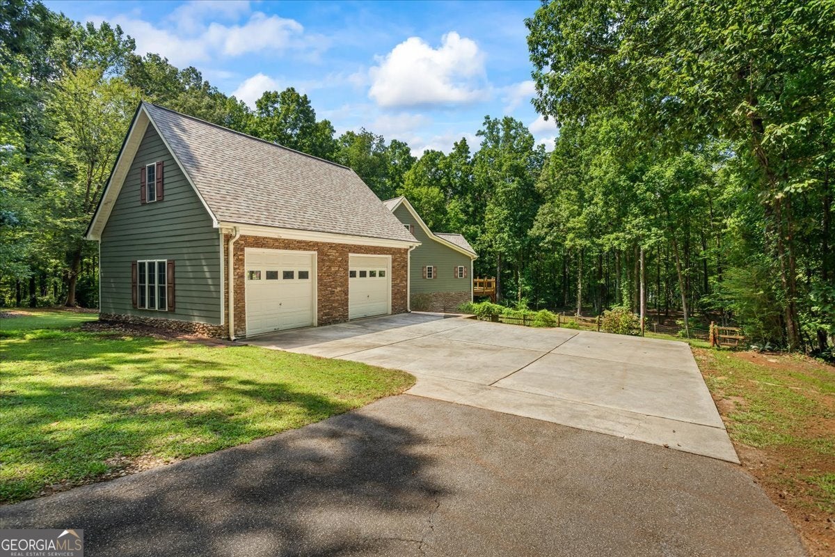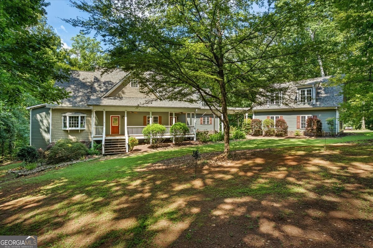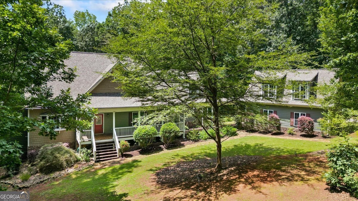 This retreat is waiting for you to call it home! Nestled on 6.15 private acres on Lake Horton, this property offers the perfect balance of peaceful seclusion and everyday convenience. From the gated driveway to walking path that leads you to the lake, every detail has been designed for comfort, function, and relaxation. Enter the home from the covered front porch, which welcomes you into the foyer or directly into the kitchen. The main level features a formal dining room, a spacious great room with a stone-front fireplace and custom built-in bookshelves, and a sunroom that brings in beautiful natural light. The kitchen includes a breakfast area and connects to a well-equipped laundry room with pantry shelving, cabinets, and a wash sink. The primary suite is also located on the main floor and offers access to the back deck. The primary suite bathroom includes a double vanity, separate soaking tub, walk-in shower, and walk-in closet. Also on the main level is an office/study, a guest bedroom, and a full bathroom. Upstairs, you'll find a loft area that overlooks the main level, along with two spare bedrooms and two full bathrooms-perfect for guests. That's right, each bedroom has its own bathroom! The full, finished basement provides even more living space with a large recreation room, a bonus room with a full bathroom, a utility room, and unfinished space ideal for a workshop. There is also a separate garage/storage space for additional flexibility. Outside, enjoy the expansive back deck overlooking the private backyard, along with a covered and uncovered patio below-perfect for entertaining, grilling, or simply relaxing. A cleared area further into the backyard with a firepit near the walking path that leads directly to the lake with 450 feet of lake frontage. Additional features include: two-car detached garage and covered walkway to the home - concrete siding on both the house and detached garage - propane-powered automatic back-up power generator - no HOA - quiet, tucked-away setting yet close to many conveniences. This Lake Horton retreat offers unmatched space, privacy, and charm-whether you're seeking a full-time residence or a private getaway. Schedule your tour today and experience all that this property has to offer!