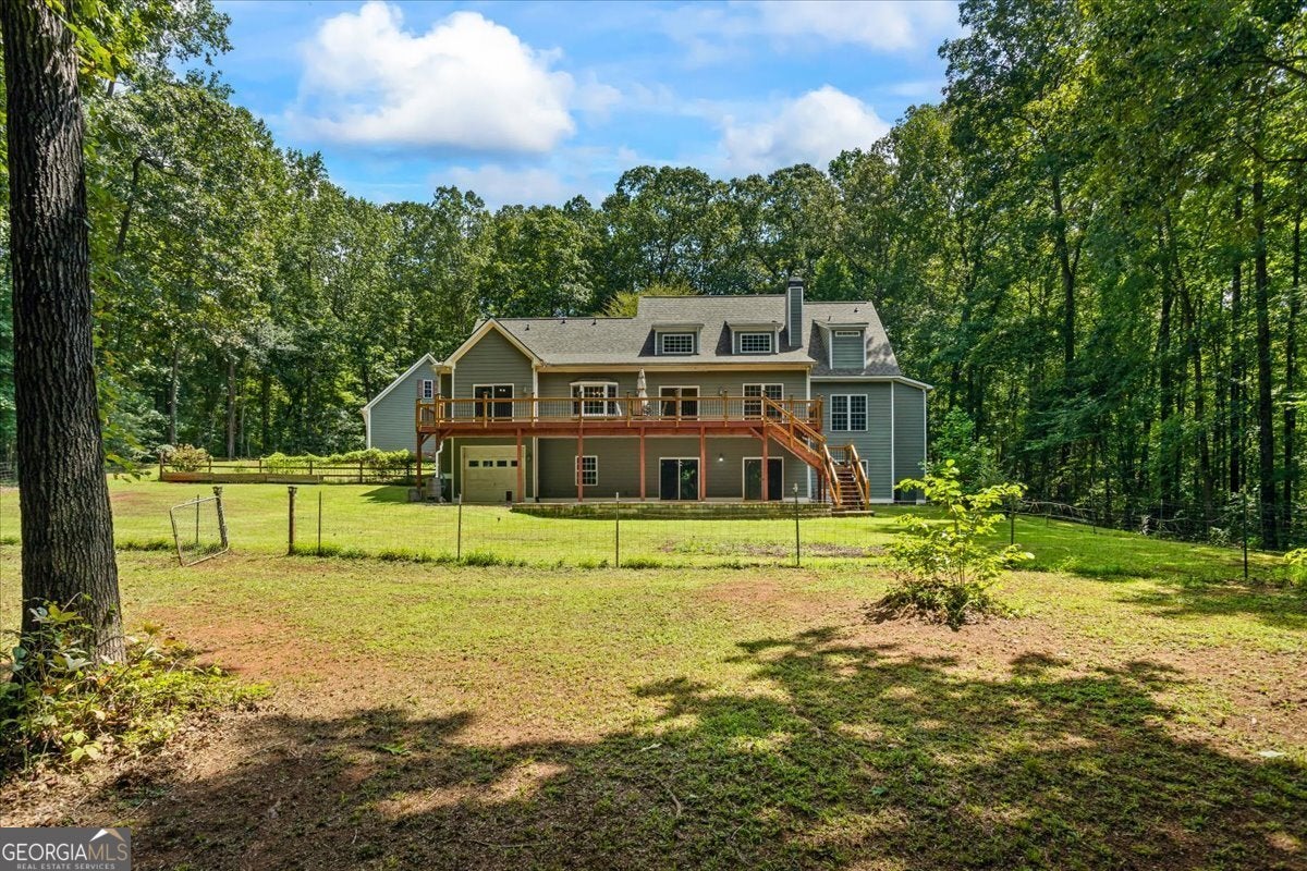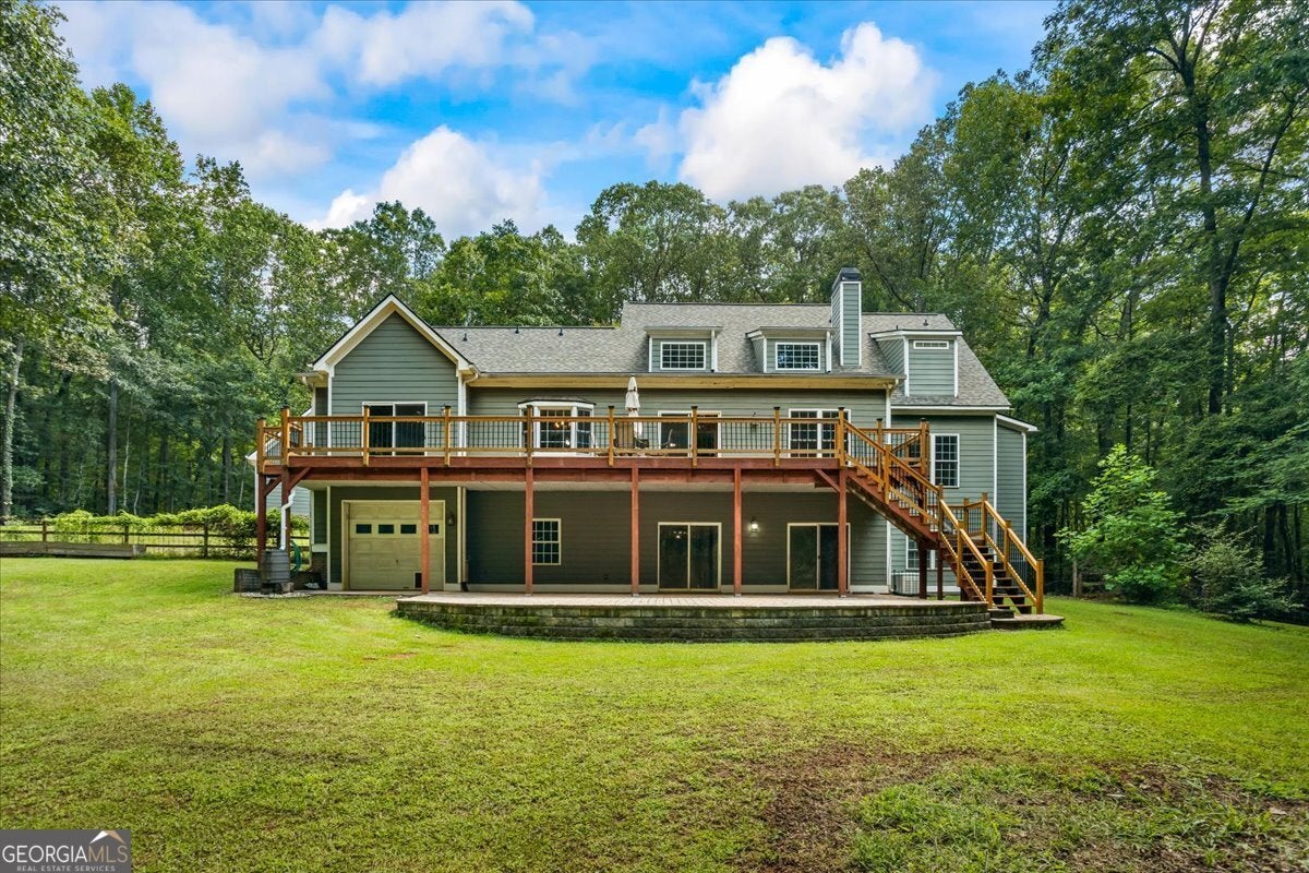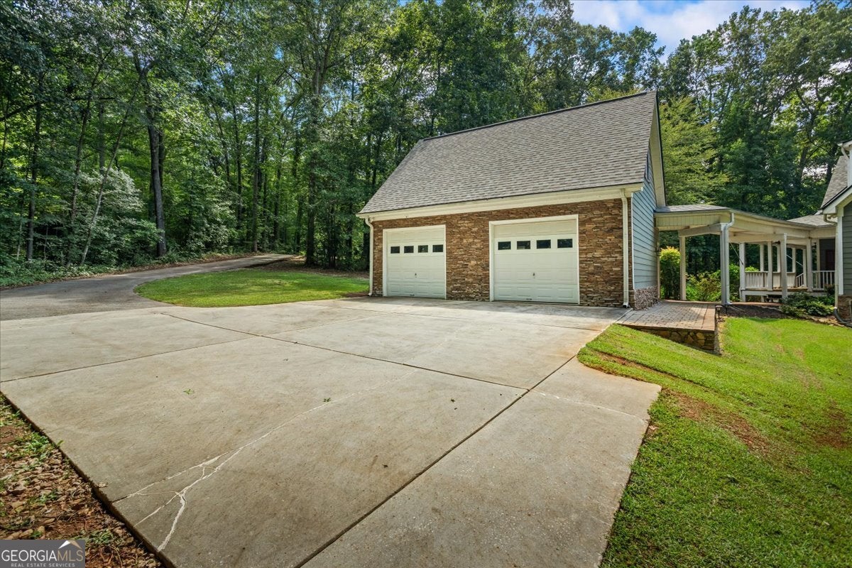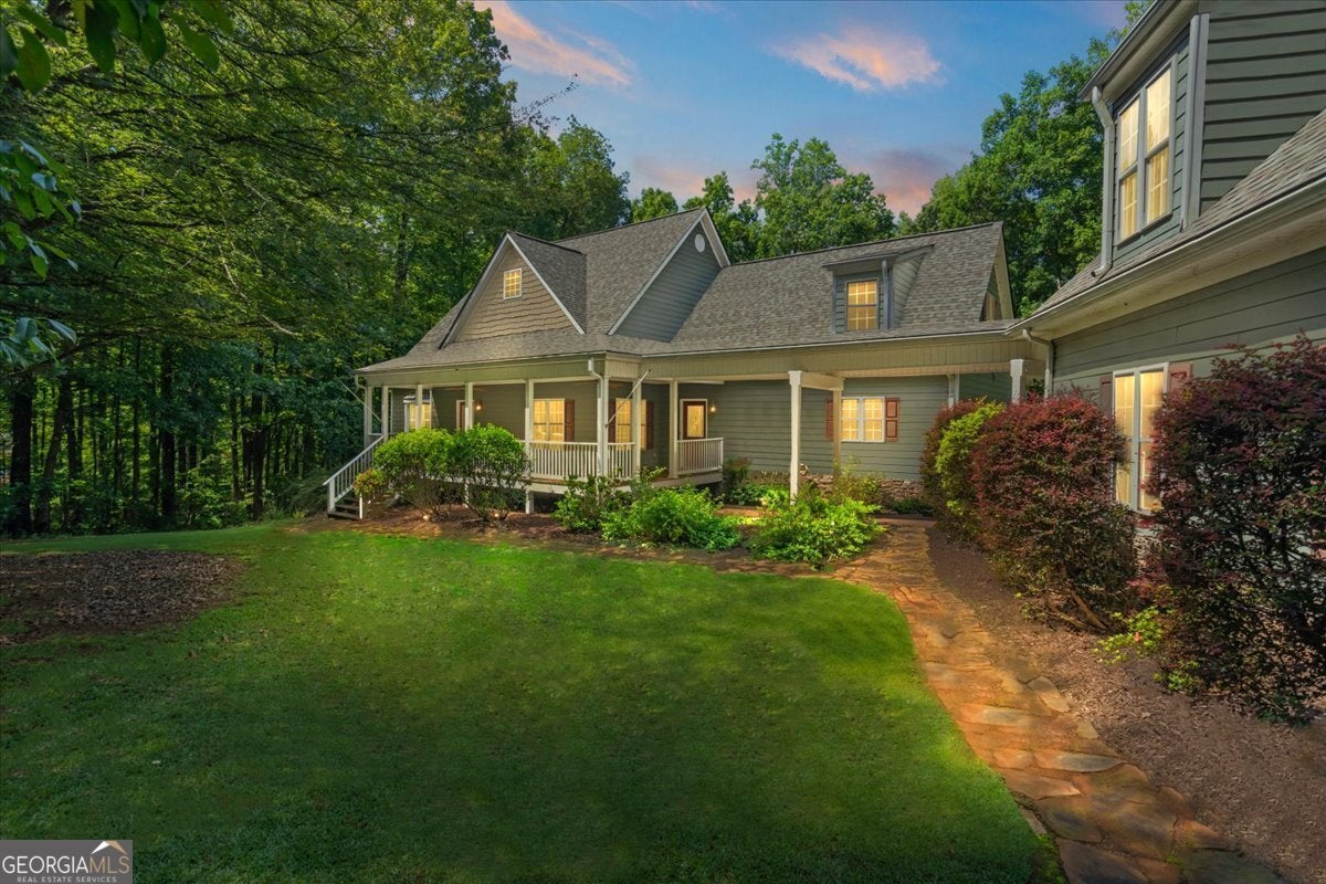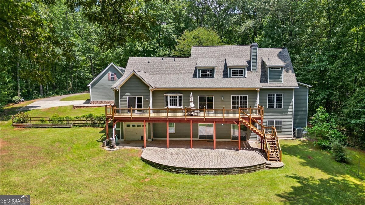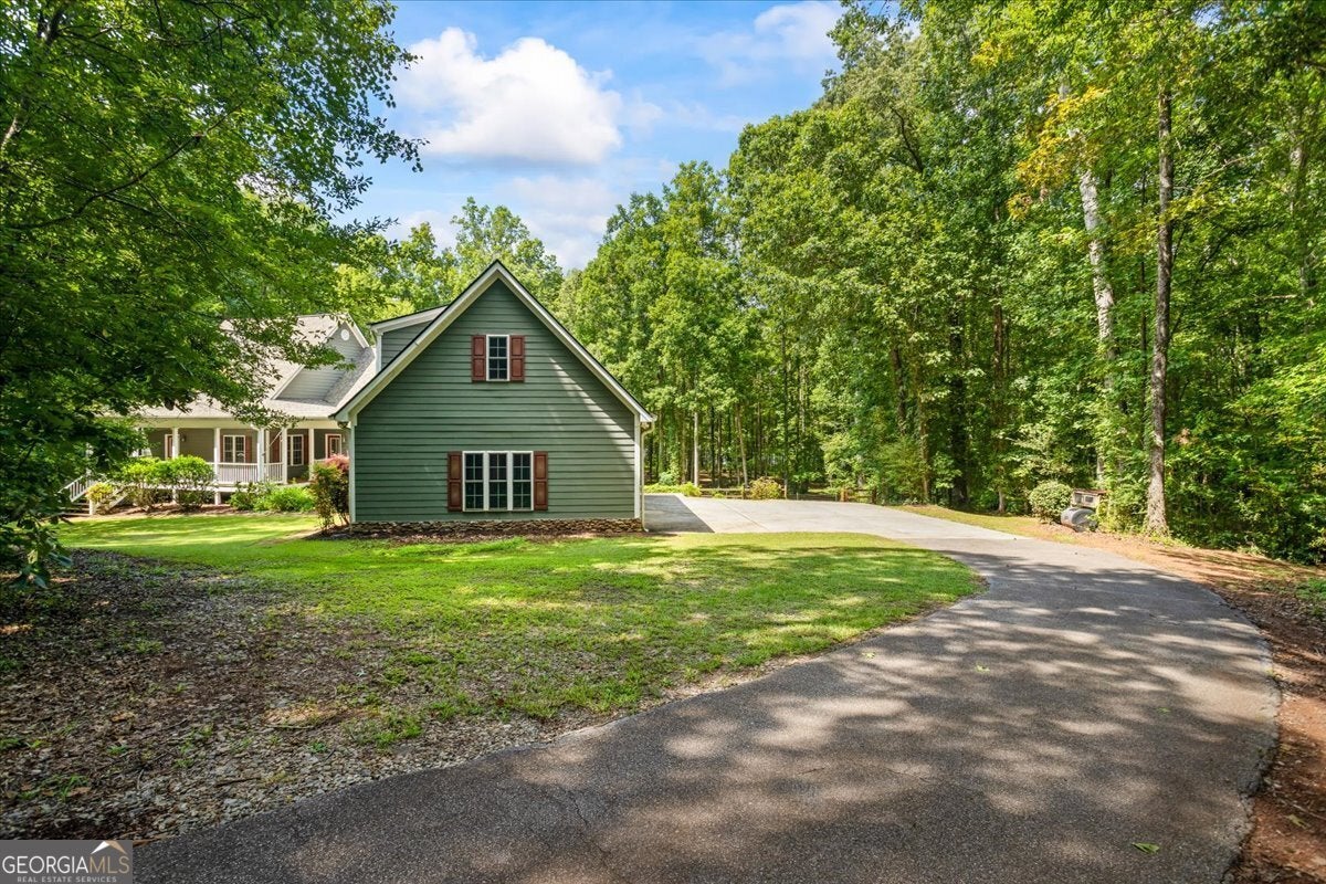 This retreat is waiting for you to call it home! Nestled on 6.15 private acres on Lake Horton, this property offers the perfect balance of peaceful seclusion and everyday convenience. From the gated driveway to walking path that leads you to the lake, every detail has been designed for comfort, function, and relaxation. Enter the home from the covered front porch, which welcomes you into the foyer or directly into the kitchen. The main level features a formal dining room, a spacious great room with a stone-front fireplace and custom built-in bookshelves, and a sunroom that brings in beautiful natural light. The kitchen includes a breakfast area and connects to a well-equipped laundry room with pantry shelving, cabinets, and a wash sink. The primary suite is also located on the main floor and offers access to the back deck. The primary suite bathroom includes a double vanity, separate soaking tub, walk-in shower, and walk-in closet. Also on the main level is an office/study, a guest bedroom, and a full bathroom. Upstairs, you'll find a loft area that overlooks the main level, along with two spare bedrooms and two full bathrooms-perfect for guests. That's right, each bedroom has its own bathroom! The full, finished basement provides even more living space with a large recreation room, a bonus room with a full bathroom, a utility room, and unfinished space ideal for a workshop. There is also a separate garage/storage space for additional flexibility. Outside, enjoy the expansive back deck overlooking the private backyard, along with a covered and uncovered patio below-perfect for entertaining, grilling, or simply relaxing. A cleared area further into the backyard with a firepit near the walking path that leads directly to the lake with 450 feet of lake frontage. Additional features include: two-car detached garage and covered walkway to the home - concrete siding on both the house and detached garage - propane-powered automatic back-up power generator - no HOA - quiet, tucked-away setting yet close to many conveniences. This Lake Horton retreat offers unmatched space, privacy, and charm-whether you're seeking a full-time residence or a private getaway. Schedule your tour today and experience all that this property has to offer!