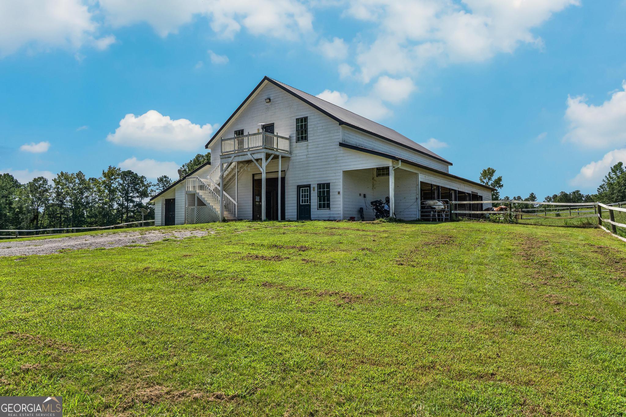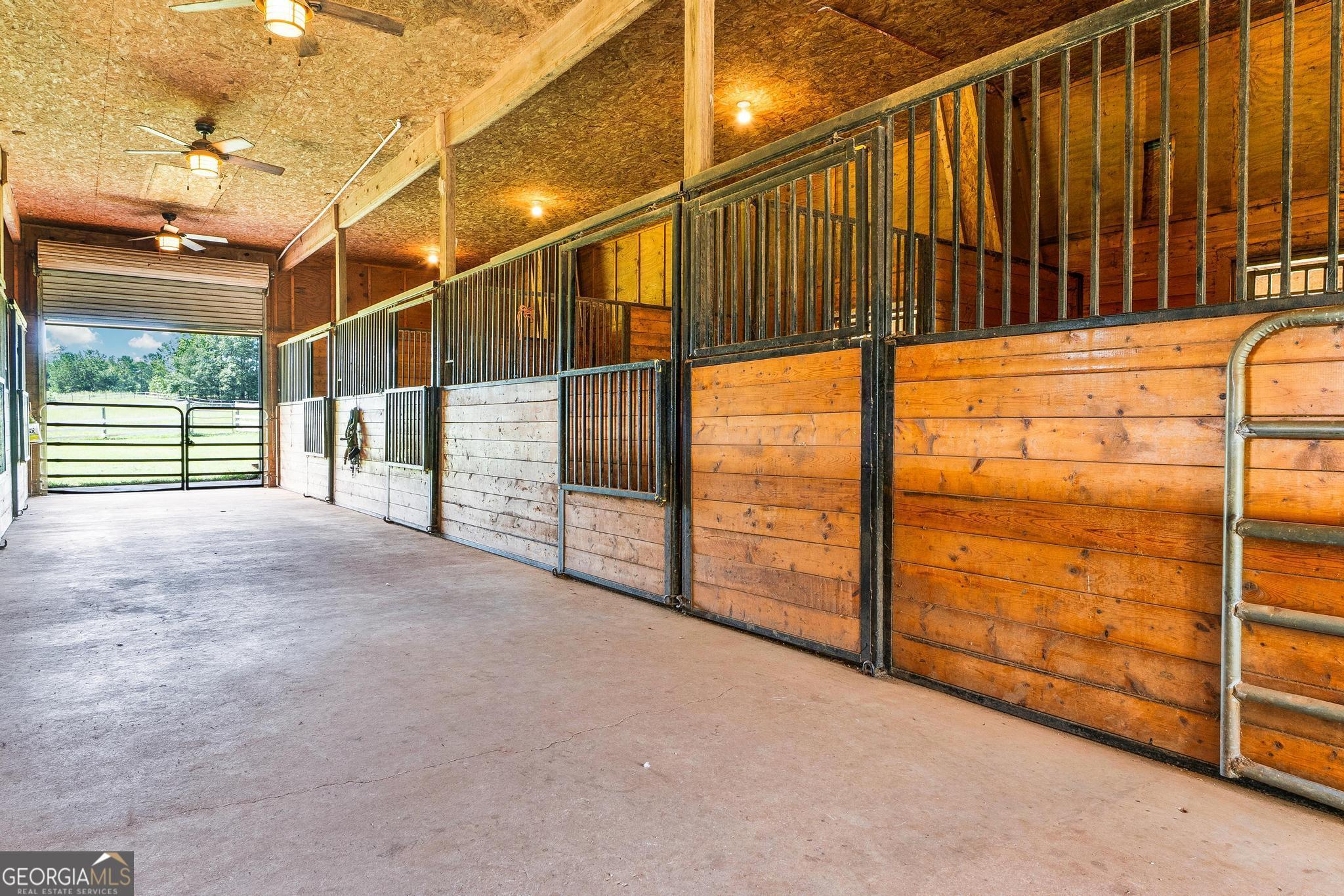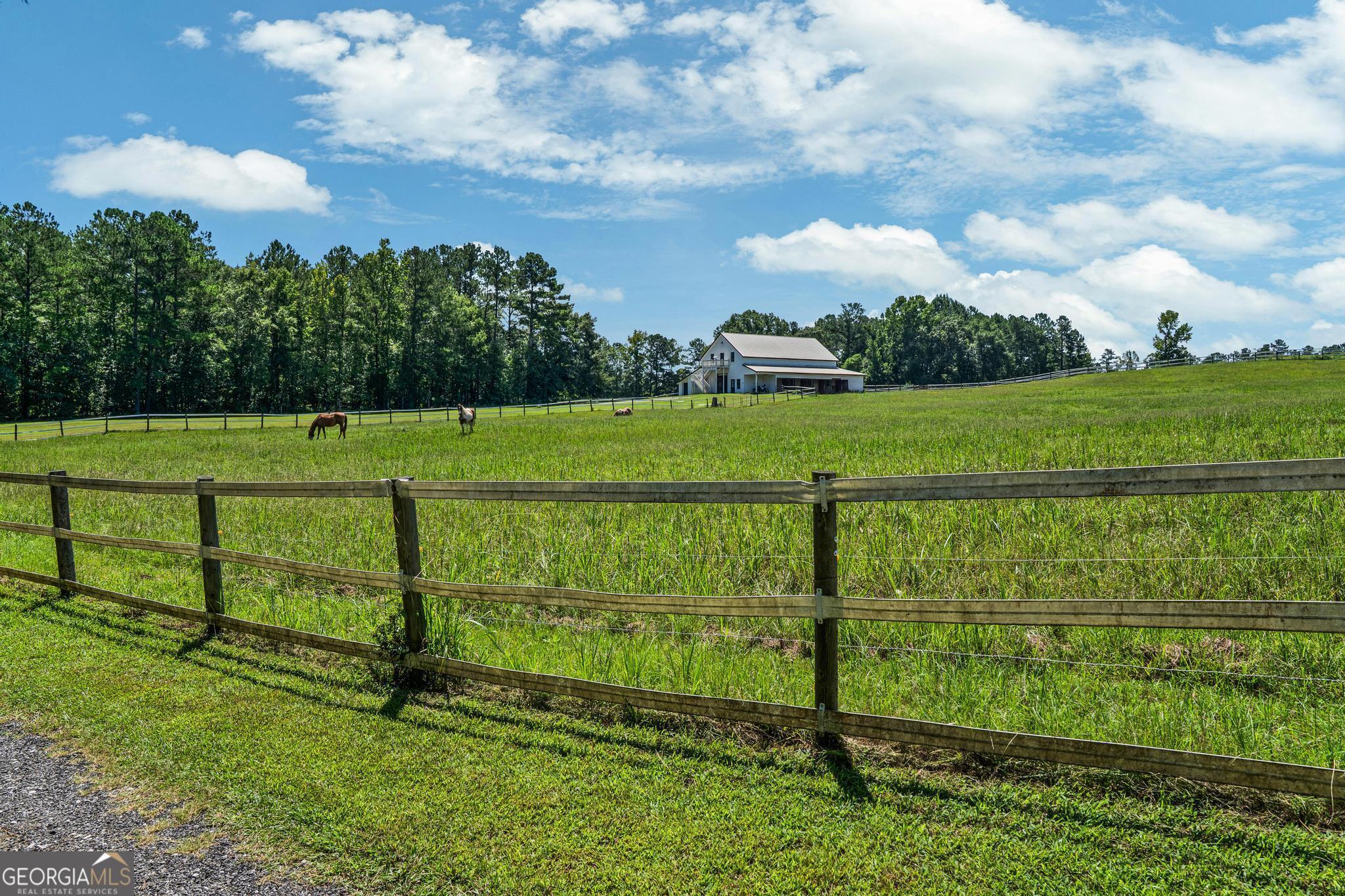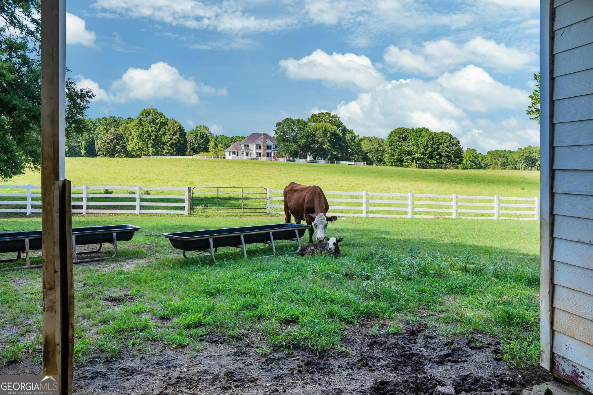 The Riesen Ranch is a remarkable 191+ acre cattle and equestrian estate, perfectly situated just one hour from downtown Atlanta. It boasts exceptional beauty while also serving as an income-producing livestock ranch and event venue. The custom-built main house was designed for family and entertaining. This 6-bedroom, 4.5-bath home offers 9,247 square feet of living space, including a fully finished 2,264-square-foot basement with a mother-in-law suite. The home showcases the finest craftsmanship and detail. A large front porch overlooks the pond and pasture. Inside, the grand foyer features a double bridal staircase with beautiful flooring, ceiling accents, and custom woodwork. It leads to a spacious living room with a fireplace and stunning views of the heated pool and pastures. The breakfast room, also with a fireplace, connects to a newly renovated kitchen. A large mudroom, ideal for farm life, leads to a large laundry room. At the front of the house, the formal dining room and office boast breathtaking pond and pasture views. The master suite includes a private study with a gas fireplace. The expansive master bath offers a glass shower, jacuzzi tub, and his-and-hers toilets. Upstairs, there are four bedrooms-two on each side of the home-joined by Jack-and-Jill bathrooms and a balcony overlooking the pond and property. The fully finished basement features a private mother-in-law suite with a kitchenette and separate entrance leading to a tea garden. Additional highlights include a home theater with custom sound, lighting, seating, and soundproof walls, as well as a secure gun room with keypad access, storage rooms, and ample closets. The home is equipped with a whole-house central vacuum system and a Generac emergency generator. Outside, there are two two-car garages. One is connected by a breezeway that leads to a large deck and heated pool overlooking the pasture. A 3,500-square-foot shop includes a finished office on one side and a music recording studio with a sound room on the other. The concrete-floored shop houses the family's gym and rock wall, with plenty of space for equipment and toys. It also features a tool room with a workbench, loft storage on both sides, and additional outdoor bays for storage. The property includes two horse barns. One with seven custom pine stalls, a feed room, tack room, storage closets, a hay loft with chute, fans, lighting, and an attached paddock for easy turnouts that lead to a large pasture. The second barn offers eight stalls with feed and tack rooms. Above it is a newly renovated 2-bedroom, 1-bath apartment with a full kitchen and large living area-perfect for hosting and entertaining. A riding arena and round pen provide space for equine training and exercise. The ranch also features a 10,000-square-foot elegant event space adorned with imported crystal chandeliers. It includes a commercial prep kitchen with stainless steel preparation station, refrigerator, and sink; three restrooms; a live-edge bar; and seating for up to 200 guests. Outdoor amenities include a stage and seating area, ideal for weddings, educational gatherings, and corporate events. The Riesen Ranch offers a gated entrance, a well-maintained road system, and trails throughout the property. Two 4,000-square-foot red iron open barns provide equipment storage. The property is fully fenced and cross-fenced, with multiple paddocks and pastures. Currently raising the family's Wagyu cattle and horses, the ranch offers tremendous opportunities for expansion into farm-to-table agritourism, given its close proximity to Atlanta. It has also been used as an equestrian boarding facility. It's ready for your cows and horses! The Riesen Ranch is located in Senoia, Georgia just 44 miles (47 minutes) from Hartsfield-Jackson International Airport and 54 miles from Atlanta.