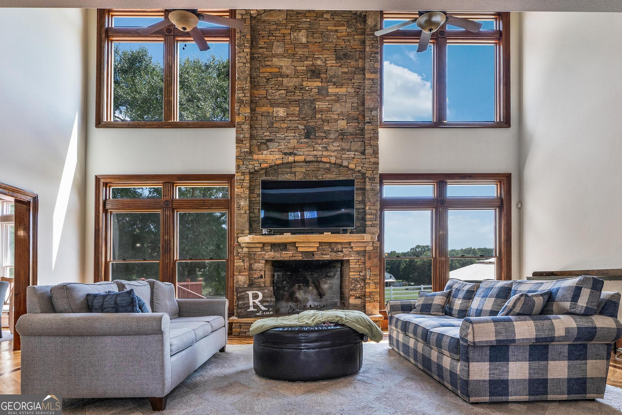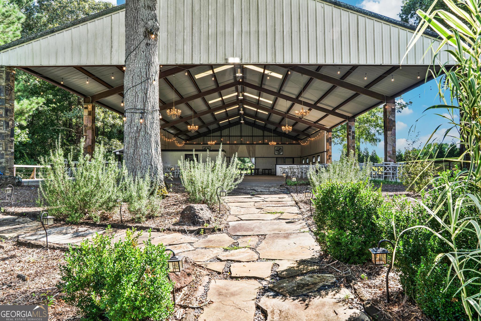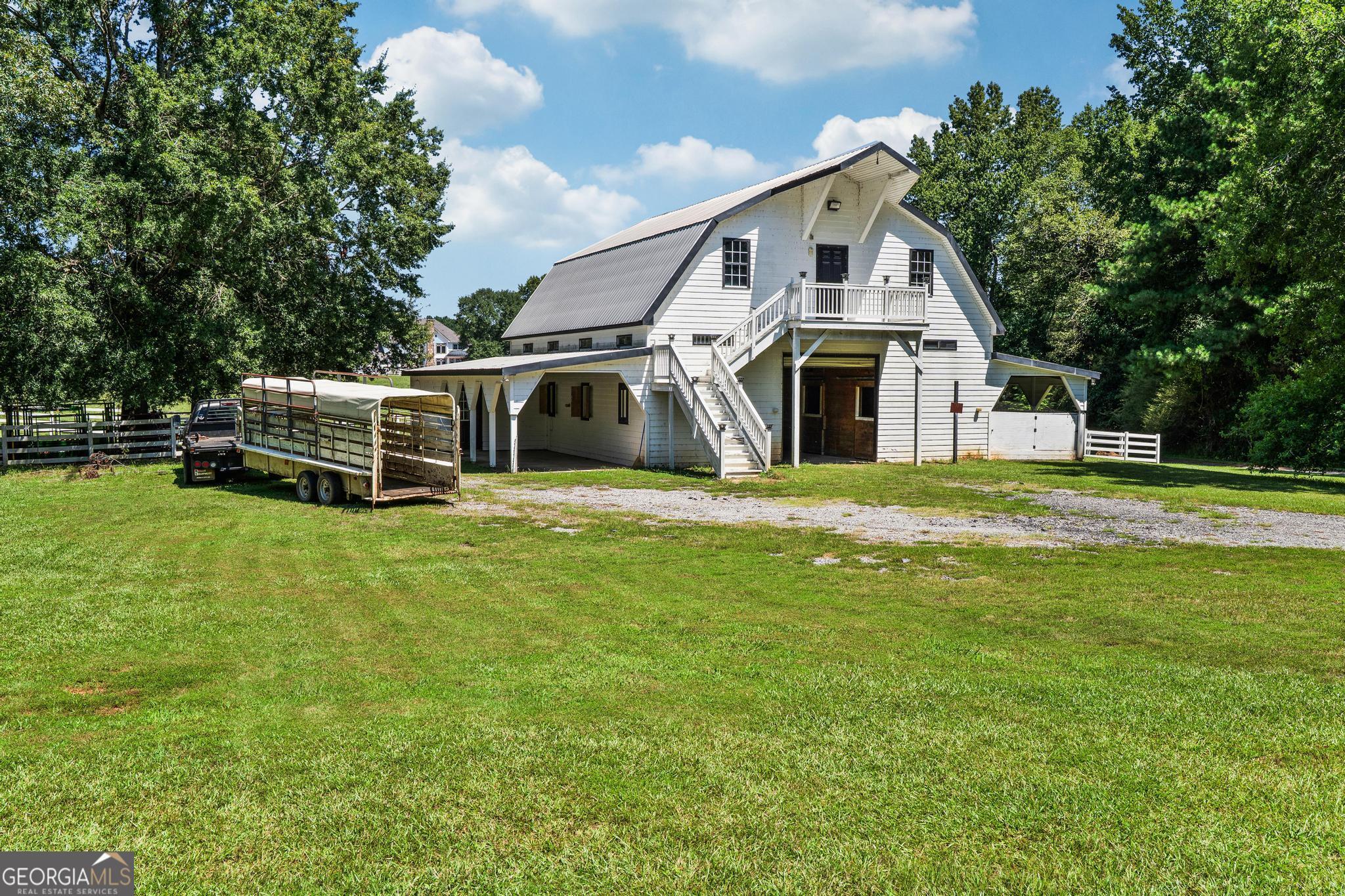 The Riesen Ranch is a remarkable 191+ acre cattle and equestrian estate, perfectly situated just one hour from downtown Atlanta. It boasts exceptional beauty while also serving as an income-producing livestock ranch and event venue. The custom-built main house was designed for family and entertaining. This 6-bedroom, 4.5-bath home offers 9,247 square feet of living space, including a fully finished 2,264-square-foot basement with a mother-in-law suite. The home showcases the finest craftsmanship and detail. A large front porch overlooks the pond and pasture. Inside, the grand foyer features a double bridal staircase with beautiful flooring, ceiling accents, and custom woodwork. It leads to a spacious living room with a fireplace and stunning views of the heated pool and pastures. The breakfast room, also with a fireplace, connects to a newly renovated kitchen. A large mudroom, ideal for farm life, leads to a large laundry room. At the front of the house, the formal dining room and office boast breathtaking pond and pasture views. The master suite includes a private study with a gas fireplace. The expansive master bath offers a glass shower, jacuzzi tub, and his-and-hers toilets. Upstairs, there are four bedrooms-two on each side of the home-joined by Jack-and-Jill bathrooms and a balcony overlooking the pond and property. The fully finished basement features a private mother-in-law suite with a kitchenette and separate entrance leading to a tea garden. Additional highlights include a home theater with custom sound, lighting, seating, and soundproof walls, as well as a secure gun room with keypad access, storage rooms, and ample closets. The home is equipped with a whole-house central vacuum system and a Generac emergency generator. Outside, there are two two-car garages. One is connected by a breezeway that leads to a large deck and heated pool overlooking the pasture. A 3,500-square-foot shop includes a finished office on one side and a music recording studio with a sound room on the other. The concrete-floored shop houses the family's gym and rock wall, with plenty of space for equipment and toys. It also features a tool room with a workbench, loft storage on both sides, and additional outdoor bays for storage. The property includes two horse barns. One with seven custom pine stalls, a feed room, tack room, storage closets, a hay loft with chute, fans, lighting, and an attached paddock for easy turnouts that lead to a large pasture. The second barn offers eight stalls with feed and tack rooms. Above it is a newly renovated 2-bedroom, 1-bath apartment with a full kitchen and large living area-perfect for hosting and entertaining. A riding arena and round pen provide space for equine training and exercise. The ranch also features a 10,000-square-foot elegant event space adorned with imported crystal chandeliers. It includes a commercial prep kitchen with stainless steel preparation station, refrigerator, and sink; three restrooms; a live-edge bar; and seating for up to 200 guests. Outdoor amenities include a stage and seating area, ideal for weddings, educational gatherings, and corporate events. The Riesen Ranch offers a gated entrance, a well-maintained road system, and trails throughout the property. Two 4,000-square-foot red iron open barns provide equipment storage. The property is fully fenced and cross-fenced, with multiple paddocks and pastures. Currently raising the family's Wagyu cattle and horses, the ranch offers tremendous opportunities for expansion into farm-to-table agritourism, given its close proximity to Atlanta. It has also been used as an equestrian boarding facility. It's ready for your cows and horses! The Riesen Ranch is located in Senoia, Georgia just 44 miles (47 minutes) from Hartsfield-Jackson International Airport and 54 miles from Atlanta.