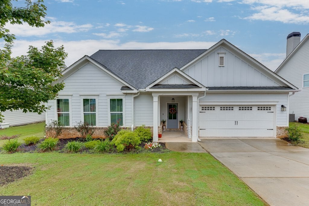 JAYDEN RANCH FLOOR PLAN - New Construction in MUST SEE RANCH in Traditions of Braselton! This stunning Craftsman-style 4BR/3BA ranch offers open-concept living with granite countertops, tile backsplash, and 42" shaker-style cabinets. LVP hardwoods flow through the main areas, complemented by a gorgeous judges panel dining room and cozy wood-burning fireplace in the family room. Enjoy outdoor living on the covered patio. Located in a premier golf/tennis community, residents have access to a clubhouse, gym, pool, nature trails, pickleball, and more-RESORT STYLE LIVING at its best!