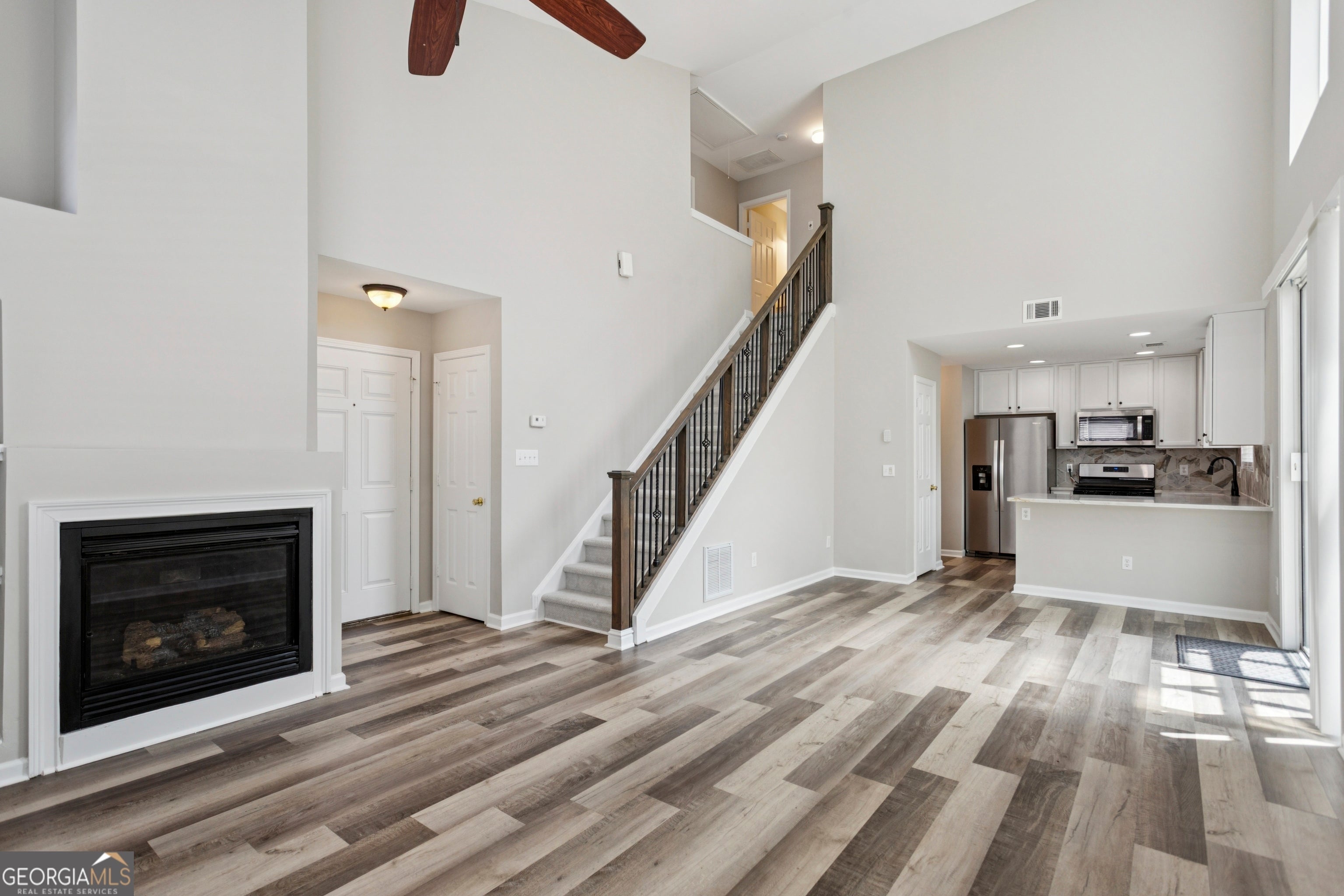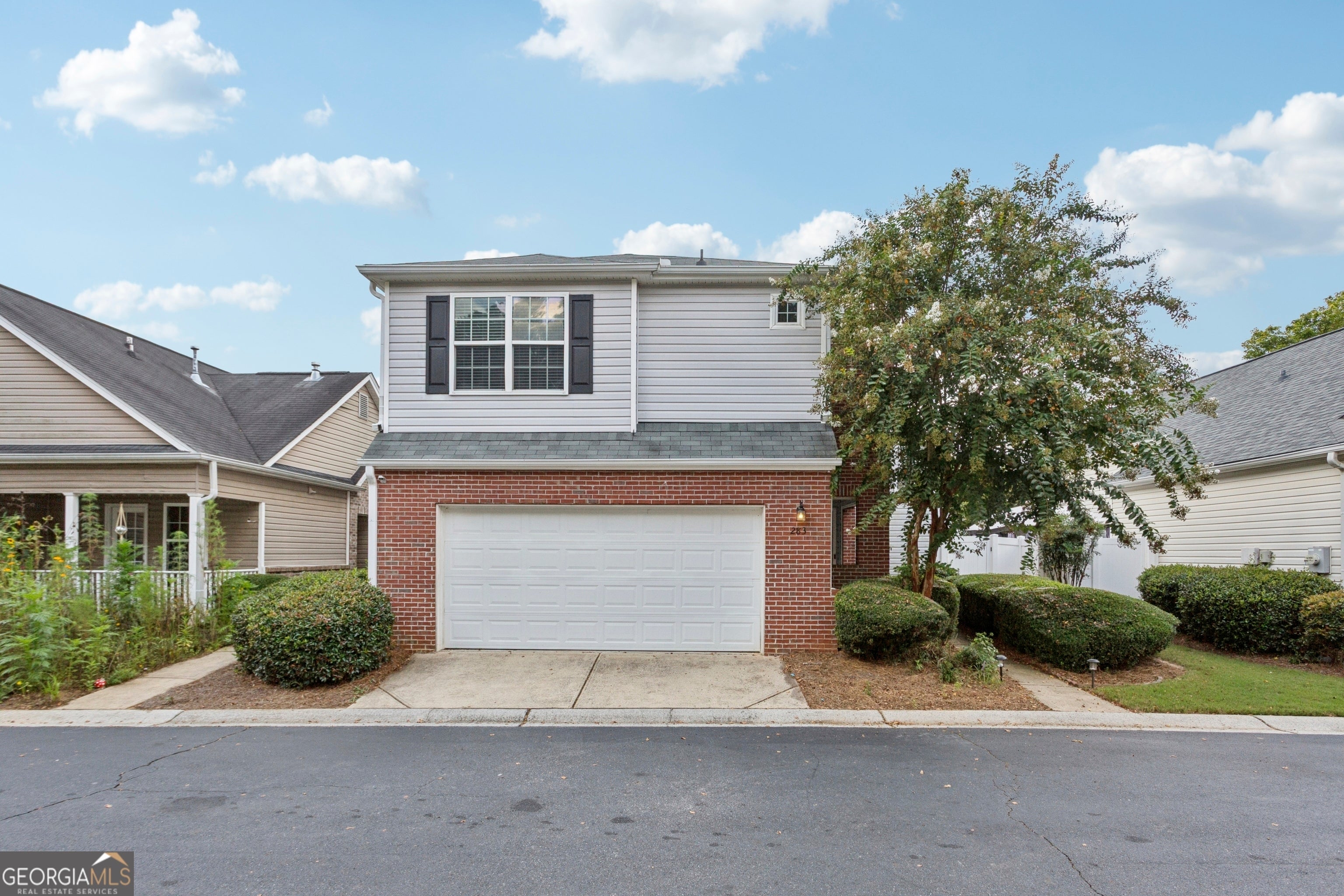 This charming home has been beautifully updated, and offers comfort, convenience, and style throughout. As you step inside, you'll notice the living room that boasts soaring two-story ceilings, an abundance of natural light, a cozy gas fireplace, and built-in bookshelves, creating a warm and inviting space. The open floor plan flows from the living room into the kitchen, which is fully equipped with brand-new stainless-steel appliances, granite countertops, white cabinetry, a breakfast bar, and a pantry-perfect for everyday living and entertaining. Upstairs, the spacious primary bedroom includes his-and-hers closets and an en-suite bath with ample vanity space, a soaking tub, and a recently updated, spacious shower. The two additional bedrooms share a full bathroom that is conveniently located in between them. Enjoy the outdoors in the fully fenced, private backyard, which features a beautiful pergola covered patio. Additional features of this home include a two-car garage, a covered front entry that offers both keyed and keyless access for ease and security, a laundry equipped with a washer and dryer, a freshly painted interior and exterior, brand-new flooring throughout, double-paned windows, attic storage with disappearing stairs, an installed security system, and a front yard that is HOA-maintained for your convenience. Pet friendly-restrictions apply. The highly sought after River Park community offers a swimming pool, clubhouse, playground, tennis courts, picnic area, and a seating area with a fire pit. It has easy access to I-575, and is located conveniently to downtown Woodstock, the Woodstock Outlet Mall, Costco, Kroger, Olde Rope Mill Park, JJ Biello Park, and tons of additional shopping, restaurants, and entertainment.