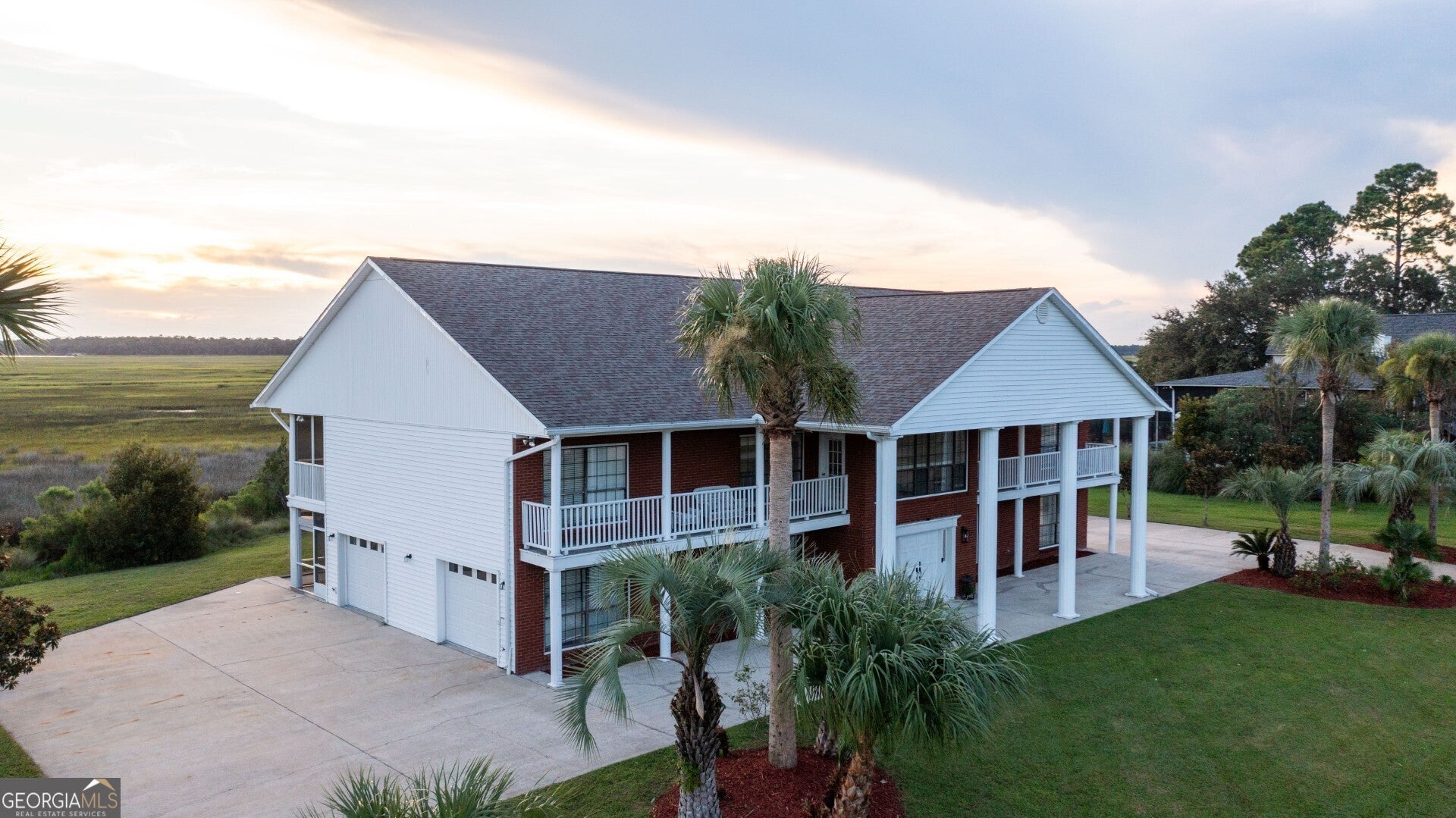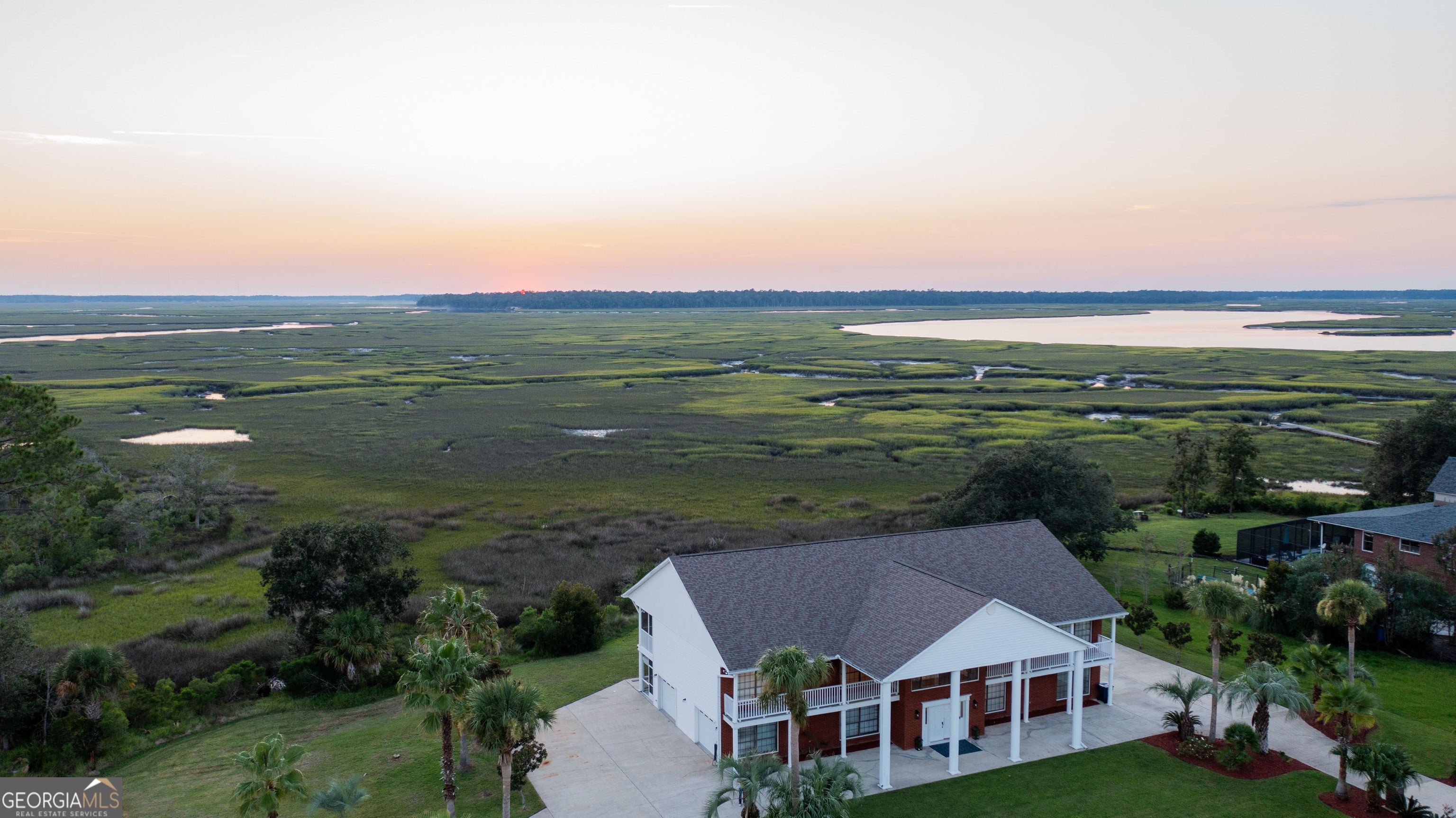 Enjoy the sunset every night! This beautiful 2-story brick home is on over an acre, located at the end of a cul-de-sac, and has stunning marsh and river views for miles! There is so much room in this home with 3 Bedrooms and 3 Baths PLUS 2 additional rooms that could be an Office and a Library, or Formal Dining Room (or whatever you need it to be), PLUS a downstairs Bonus Space with an additional 1536 sq ft. Upstairs is an open floor plan featuring a beautiful wood staircase and chandelier, hardwood floors throughout, a double-sided gas fireplace between the Living Room and Sun Room, Dining area, and so much more. The Kitchen features an island gas cooktop, double ovens, butlers pantry, plenty of cabinets, stainless steel appliances, and more. The Primary Suite features a large walk-in shower, clawfoot tub, double pedestal sinks, walk-in closet (with laundry connection too). The downstairs bonus space is heated/cooled, and there is tons of storage throughout the home and in the oversized garage. Located in Elliots Plantation, near Crooked River State Park and Boat Ramp. No HOA. No City Taxes.