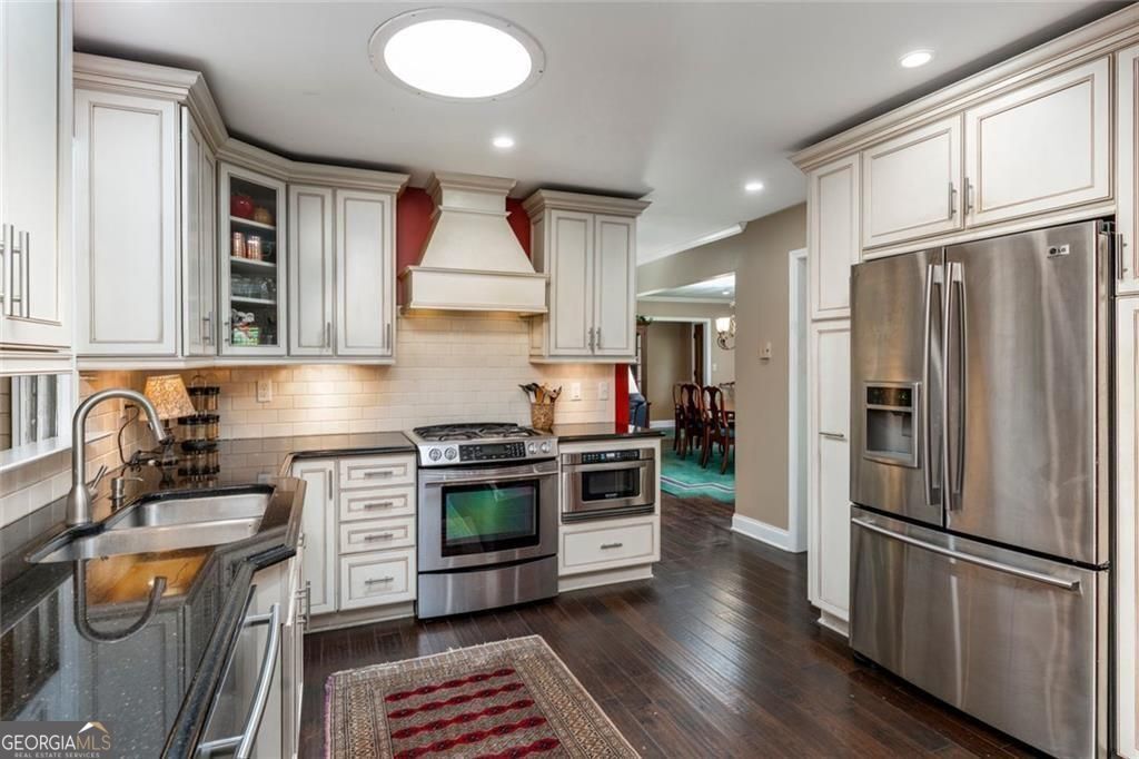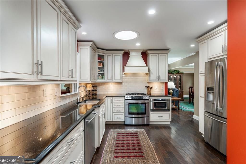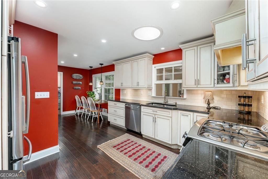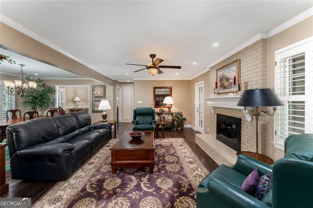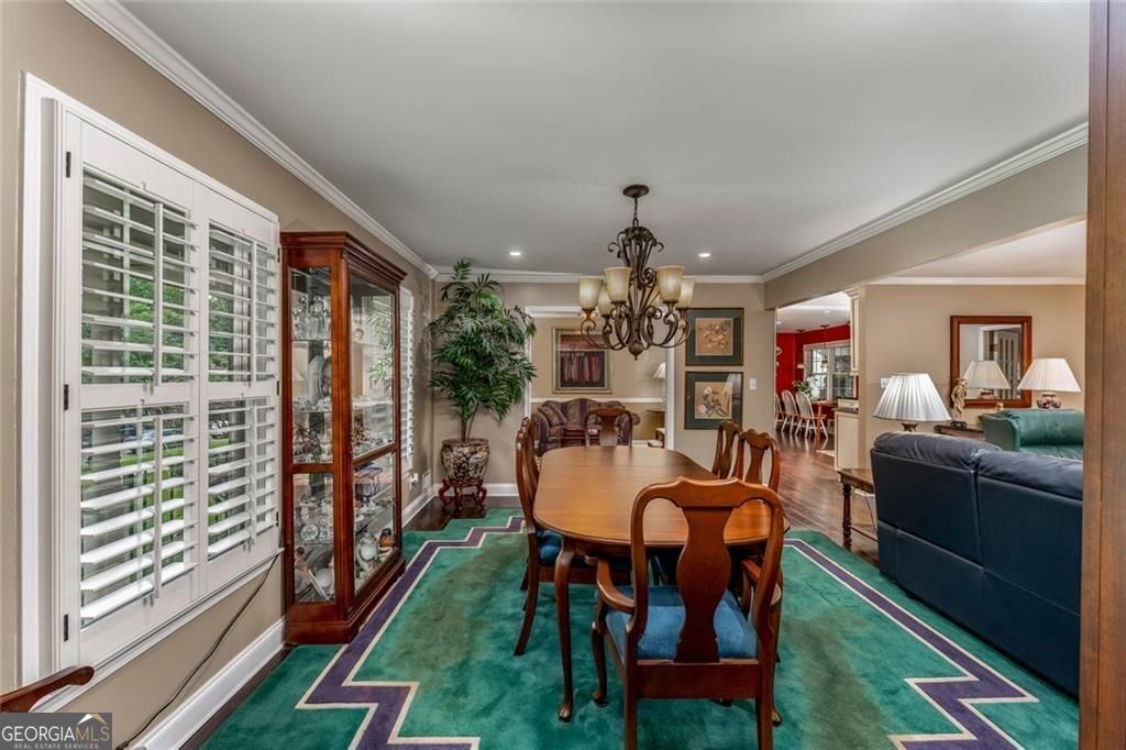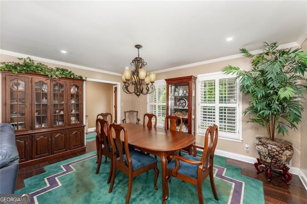 Set on a beautifully landscaped lot in the welcoming cul-de-sac enclave of Peachtree North, this delightful home blends comfort, style, and functionality. A charming front porch invites you into a flowing open floor plan accented by gleaming hardwood floors, plantation shutters, and classic wood blinds. The dining room opens to a bright living room and inviting family room, anchored by a handsome brick fireplace. A cheerful sunroom and a spacious covered patio create wonderful spots to relax or entertain, all while overlooking a gorgeous, private, and fenced backyard framed by mature trees and lush plantings, this serene retreat is ideal for entertaining and family life. A versatile storage shed adds charm and convenience. The updated gourmet kitchen is both stylish and practical, showcasing freshly painted cabinetry, gleaming granite countertops, subway tile backsplash, stainless steel appliances including a gas range, and custom pull-out pantry shelves. A sunny breakfast room and oversized laundry room with backyard access add everyday convenience. Upstairs, the serene primary suite offers a comfortable retreat with an attached bath featuring a double vanity, while two additional bedrooms share a nicely updated hall bath. The lower level is a standout, offering a fully equipped in-law suite with its own private entrance. Complete with a second kitchen, generous living room, spacious bedroom with huge walk-in closet, and private full bath, it provides a perfect setting for extended family, guests, or multi-generational living. Ideally located in the desirable Dunwoody school district, this home offers the best of convenience and community. Walk to the JCC and nearby places of worship, and enjoy close proximity to shopping, dining, and major interstates-all with easy access to the very best of Atlanta.
