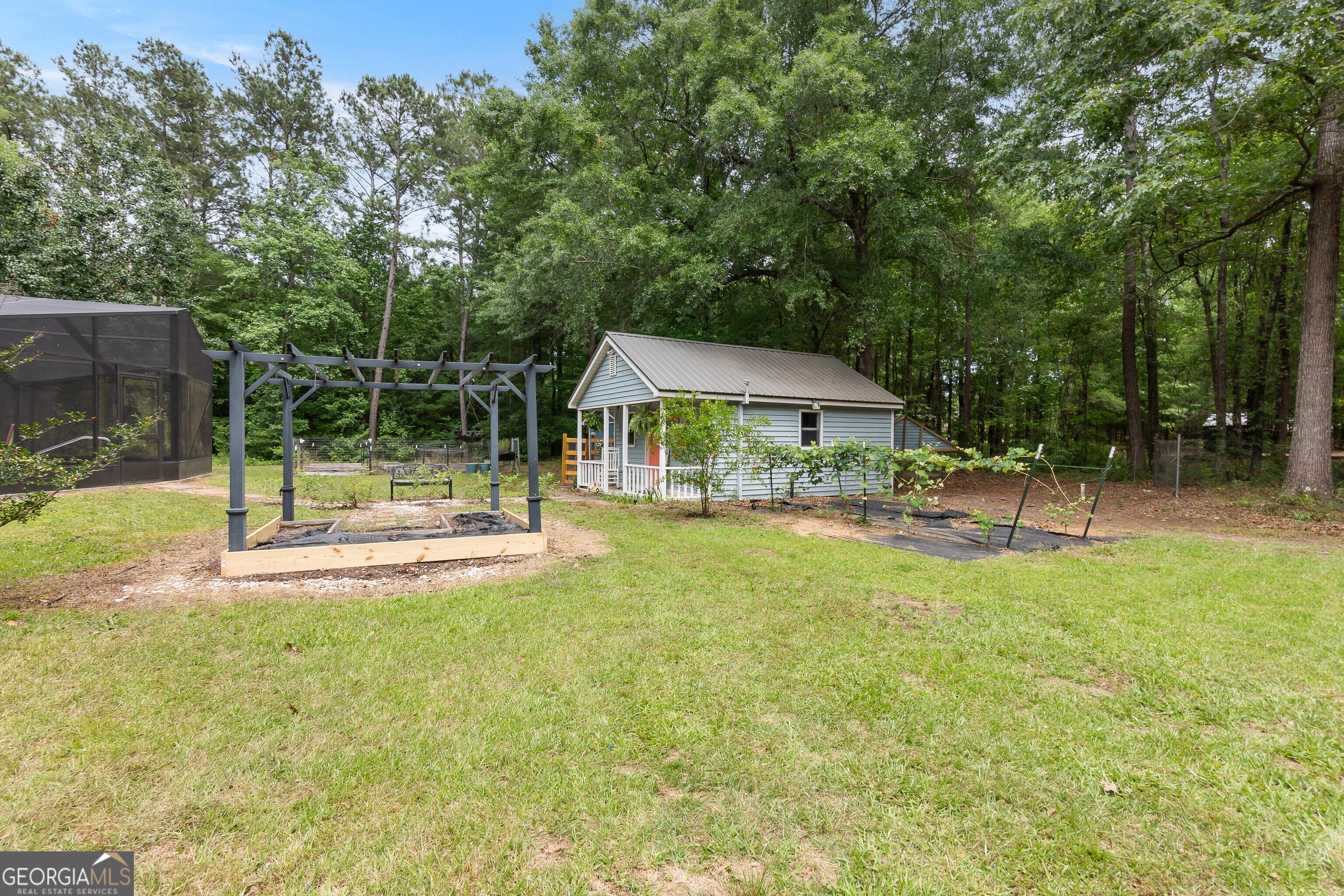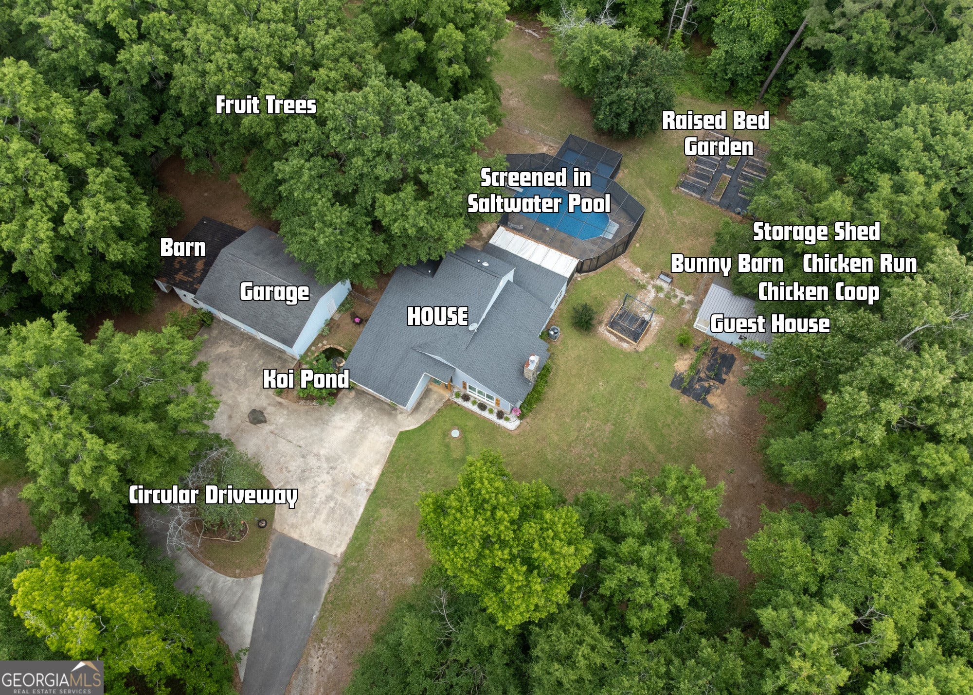 This beautiful, spacious and thoughtfully updated home has everything! 4 bed/ 3 bath w/ Office, Screened Heated Saltwater Pool, Guest Cottage, Chicken coop, Detached Garage, and so much more!!! Read on to see it all....Discover unparalleled country living on this sprawling 2.53-acre retreat set back from the road and hidden through the trees behind a welcoming circle driveway, where every detail has been thoughtfully crafted for comfort, convenience, and enjoyment. The 2,807-square-foot home welcomes you with three generously sized secondary bedrooms on the main level-along with two full baths, a formal dining room perfect for entertaining, and a huge sunroom flooded with natural light. Upstairs you'll find a vast master suite complete with a dedicated home office, a giant walk-in closet, and an expanded master bathroom boasting a double vanity, freestanding soaking tub, and an enormous two-person shower. The living room captivates with exposed wooden beams, a stunning stone wood-burning fireplace, and cozy built-in seating-ideal for family gatherings. Just steps away, the chef's kitchen gleams with granite countertops, herringbone-pattern tile floors, a huge custom-built island, crisp subway-tile backsplash, abundant cabinetry, and top-of-the-line stainless-steel appliances. Chores become a pleasure in the extraordinary laundry room, which offers a deep wash sink, a built-in folding table, custom laundry-basket storage, and space for a secondary refrigerator. Step outside into your private oasis: a saltwater-heated pool framed by a fully screened Apple Enclosure with multiple seating areas for lounging or al fresco dining. A charming cottage with its own half bath provides versatile guest quarters or a quiet workspace, while a 900-square-foot detached garage/workshop offers ample room for projects. Animal lovers will delight in on-site amenities-a chicken coop with generous run, a bunny barn with run, and a goat barn-nestled among fruit trees, grapevines, and blueberry bushes. Cultivate your green thumb in the expansive garden and store tools in the adjacent shed, or simply unwind by the tranquil koi pond .Embrace the best of both worlds with luxurious amenities, pastoral charm, and endless possibilities on this extraordinary property. Owner willing to take down fencing for Bunny Barn if buyer doesn't want to use as such and could easily be converted back to storage. Owner of home is listing agent and holds an Active Real Estate License.