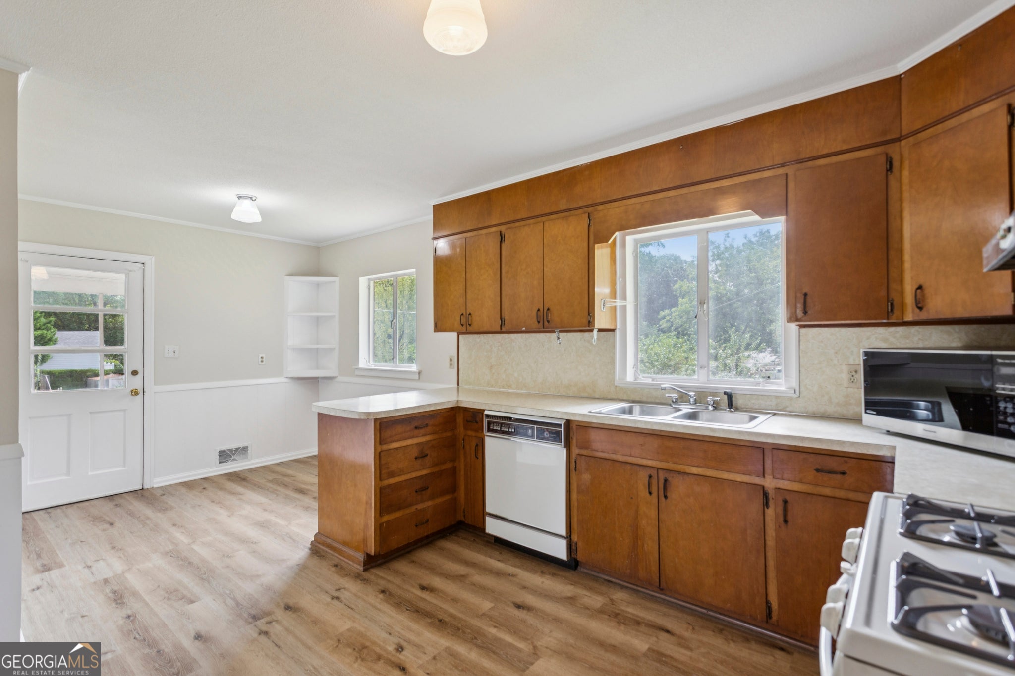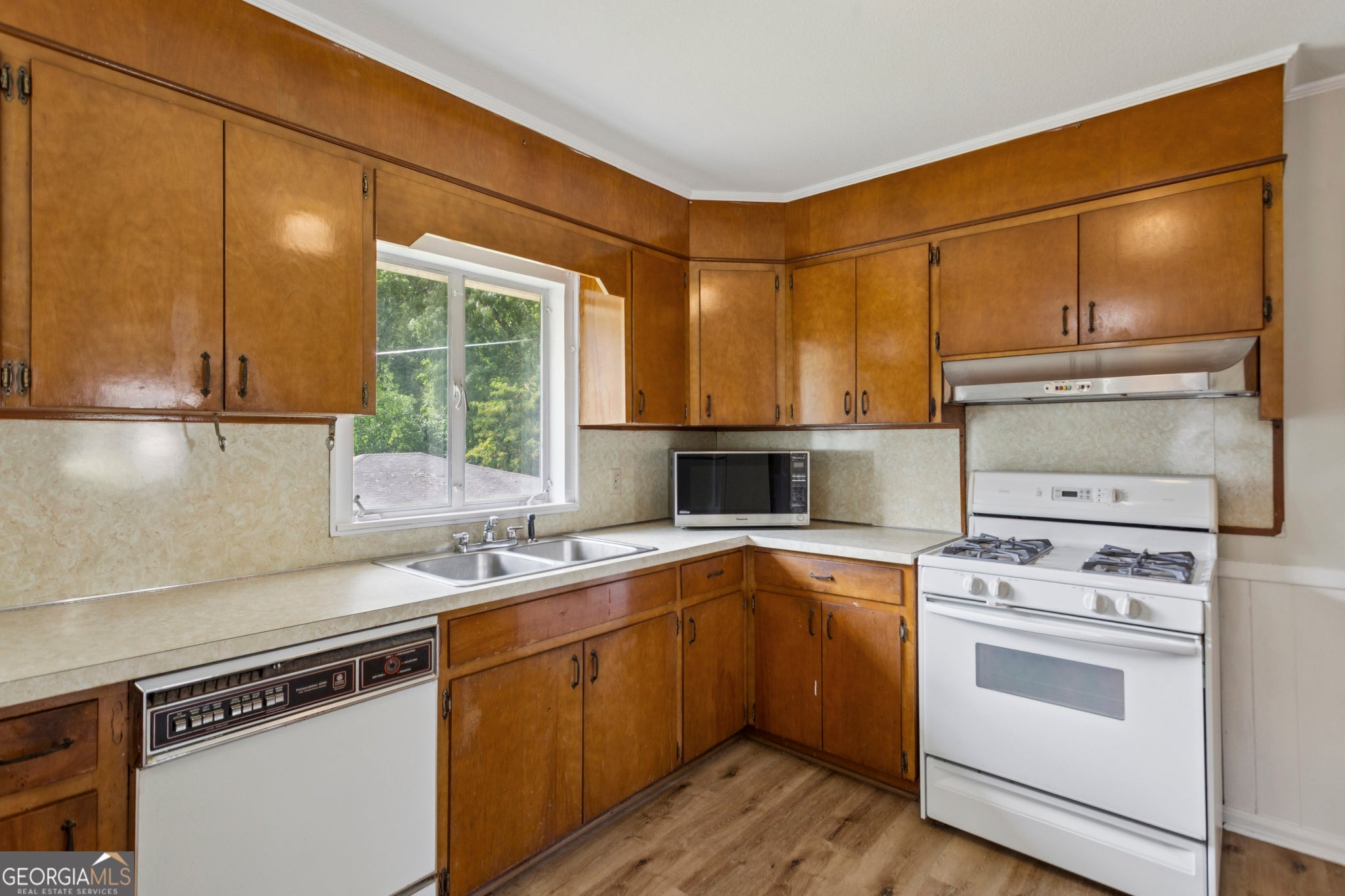 Well-cared-for classic, 4-sided brick ranch perfectly situated on a spacious corner lot (almost 1/2 acre). Featuring an open-concept family and dining area, this home offers a warm and inviting layout ideal for everyday living. The kitchen includes a breakfast area and a convenient laundry room, with direct access to a screened-in porch and a one-car carport. Fresh updates include newly re-stained original hardwood floors, new luxury vinyl flooring in the kitchen, laundry room, and middle bedroom, fresh interior paint, and updated light fixtures in the bedrooms. Enjoy a level, fenced backyard with a large detached garage/workshop complete with electricity and new roof - perfect for additional cars, storage, projects, or hobbies. The crawl space provides easy access to the systems, including a newer HVAC system and water heater, for added peace of mind. Located just minutes from I-75, the Marietta Square, Kennestone Hospital, and medical offices. There are so many opportunities with this gem!