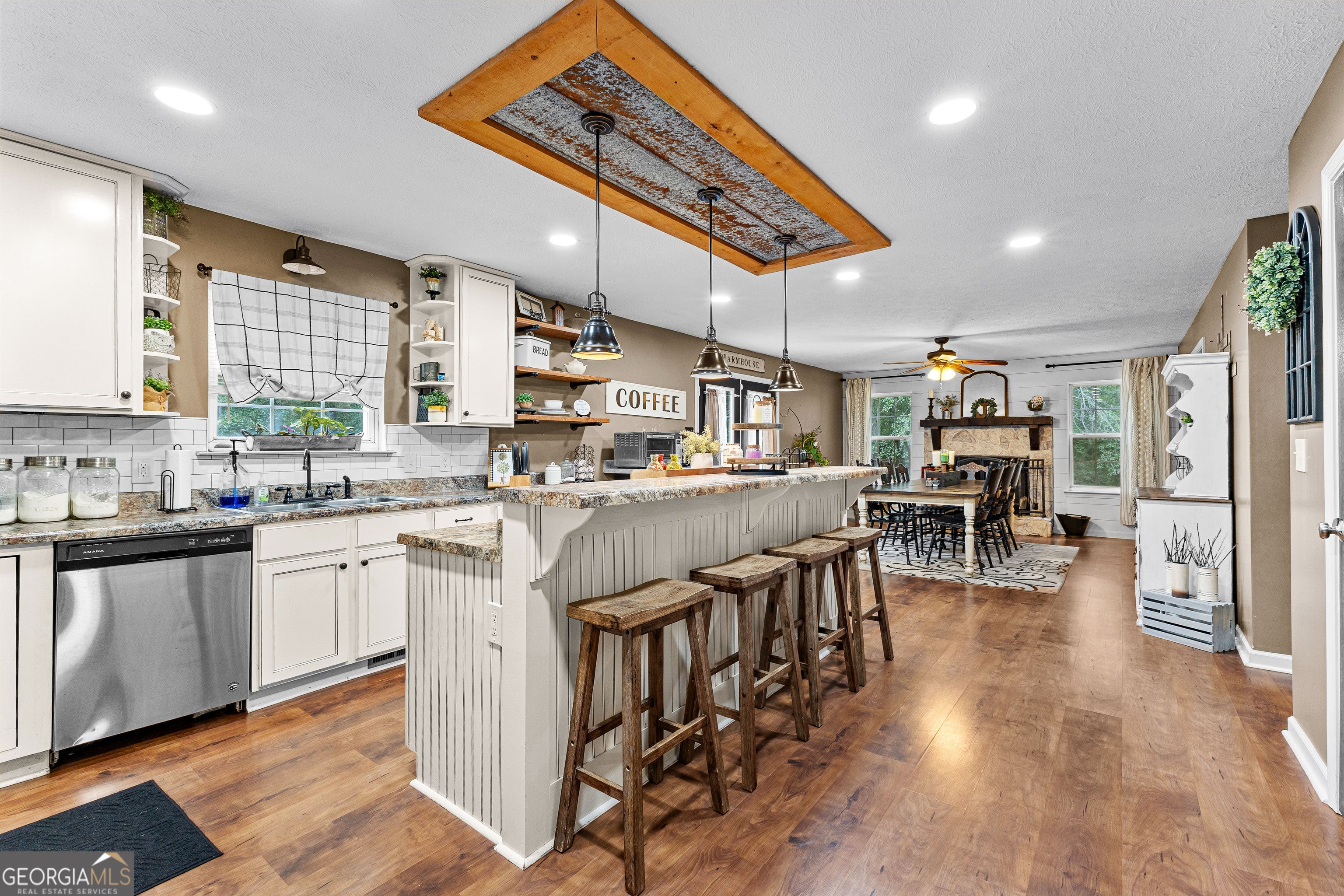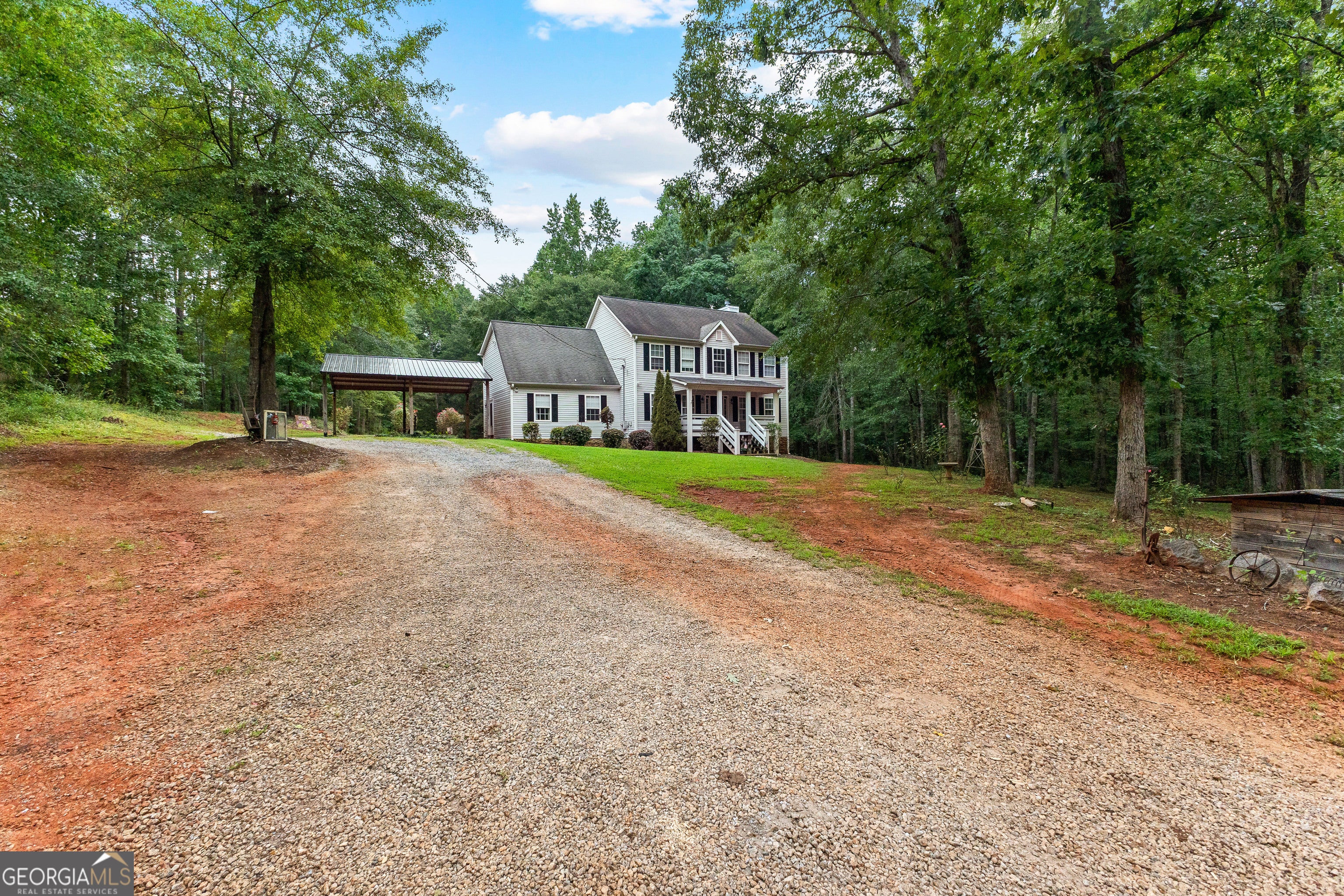 Wind down the private driveway to this beautiful 2-story home situated on 4.9 acres. Offering 4 bedrooms and 2.5 baths, this property provides both space and function in a serene setting. Step into the foyer with a family room on one side and an office/den on the other. The layout flows into the open concept kitchen and dining area, highlighted by a stunning stone fireplace, a large bar, and plentiful cabinetry for storage. Additional living space includes a spacious den, giving flexibility for entertaining or relaxation. Upstairs, the large primary suite offers a comfortable retreat, while three additional bedrooms provide ample space for family or guests. With 2.5 baths, convenience is built in. Outdoor living is equally inviting, with a welcoming front porch, covered parking, and nearly 5 acres to enjoy. Whether you're looking for room to expand, space to garden, or simply privacy, this property is ready to meet your needs.