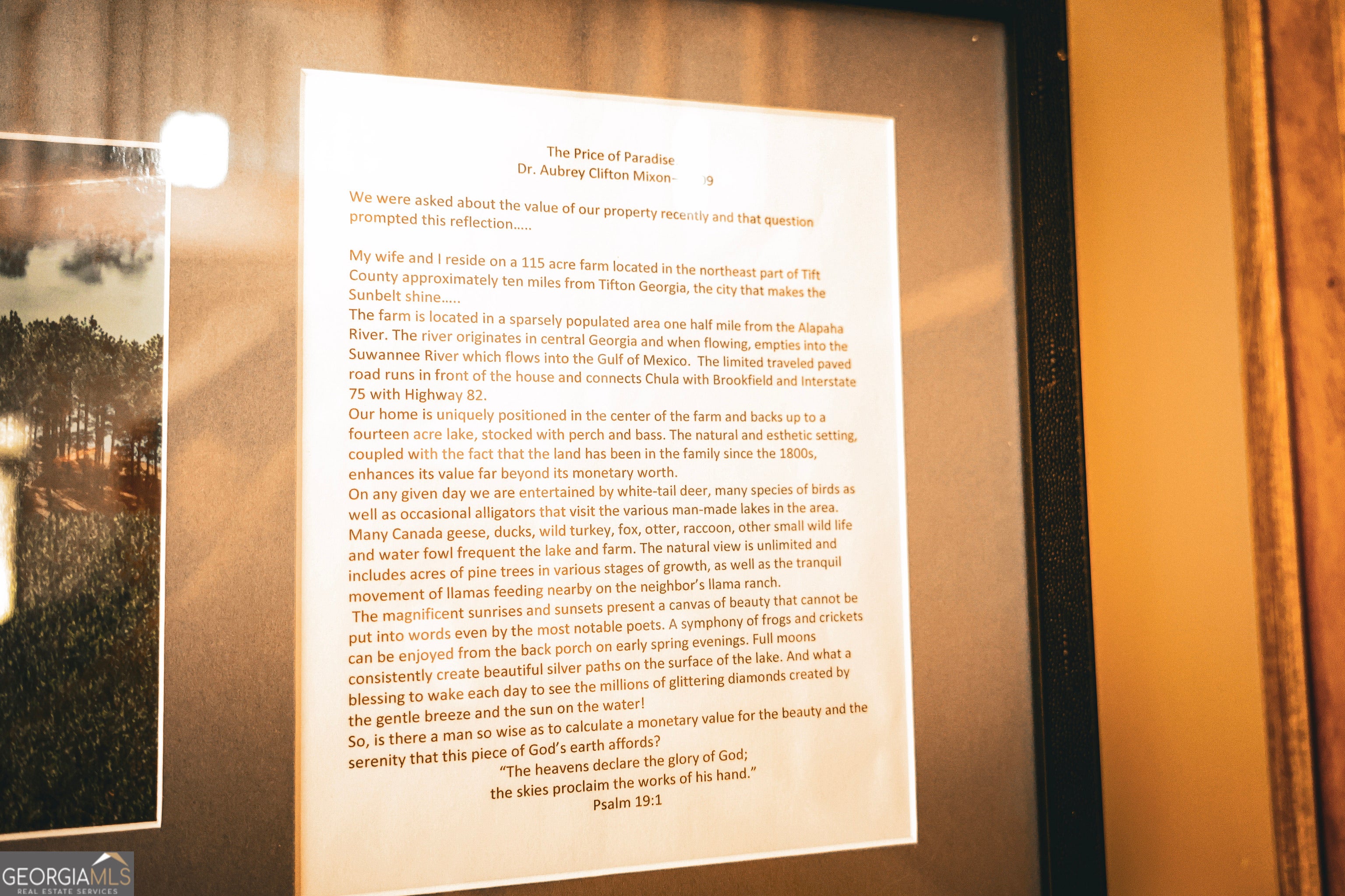 Tucked away in the heart of South Georgia sits a place where time seems to slow down, the coffee tastes a smidge better, and evenings on the porch linger just a little longer. Welcome to The Mixon Estate - 109 acres of pure country living wrapped in Southern charm. The Mixon Estate has been a labor of love with years of thoughtful planning and land stewardship. The legacy of this farm was created countless years ago by Mr. Mixon, now it's time for a new family to create their own legacy at The Mixon Estate. At the heart of The Mixon Estate is a pristine crystal clear 17-acre lake. A dock awaits ready for early morning fishing or college football Saturday afternoon cookouts. The occasional eruption of a topwater feeding bass indicates the type of fishery one can enjoy. To the north, a 2-acre pond adds another touch of tranquility and adventure. This well-manicured farm tells its own story - 40 acres of 17-year-old longleaf pines, an additional 40 acres of mature timber, and healthy populations of deer, turkeys, and ducks. An excellent mix of water, planted pines, and natural growth timber creates this picturesque landscape. The home is every bit as inviting as the land it rests on. A Southern Living-inspired farmhouse down a gravel drive off the rural Chula Brookfield Road, includes 2,323 square feet of comfort and grace. Two stories, 3 bedrooms, 2.5 baths, and a spacious bonus room give plenty of room for family and guests. The wraparound porch with stately columns sets the stage for rocking chairs and storytelling, while the deck, breezeway, and two-car garage make for easy living and entertaining. Located just eight miles north of Tifton, Georgia, The Mixon Estate is conveniently located to excellent healthcare facilities, restaurants, and shopping. Whether looking for a place to retire, entertain guests, or raise a family, The Mixon Estate is truly a one-of-a-kind property!