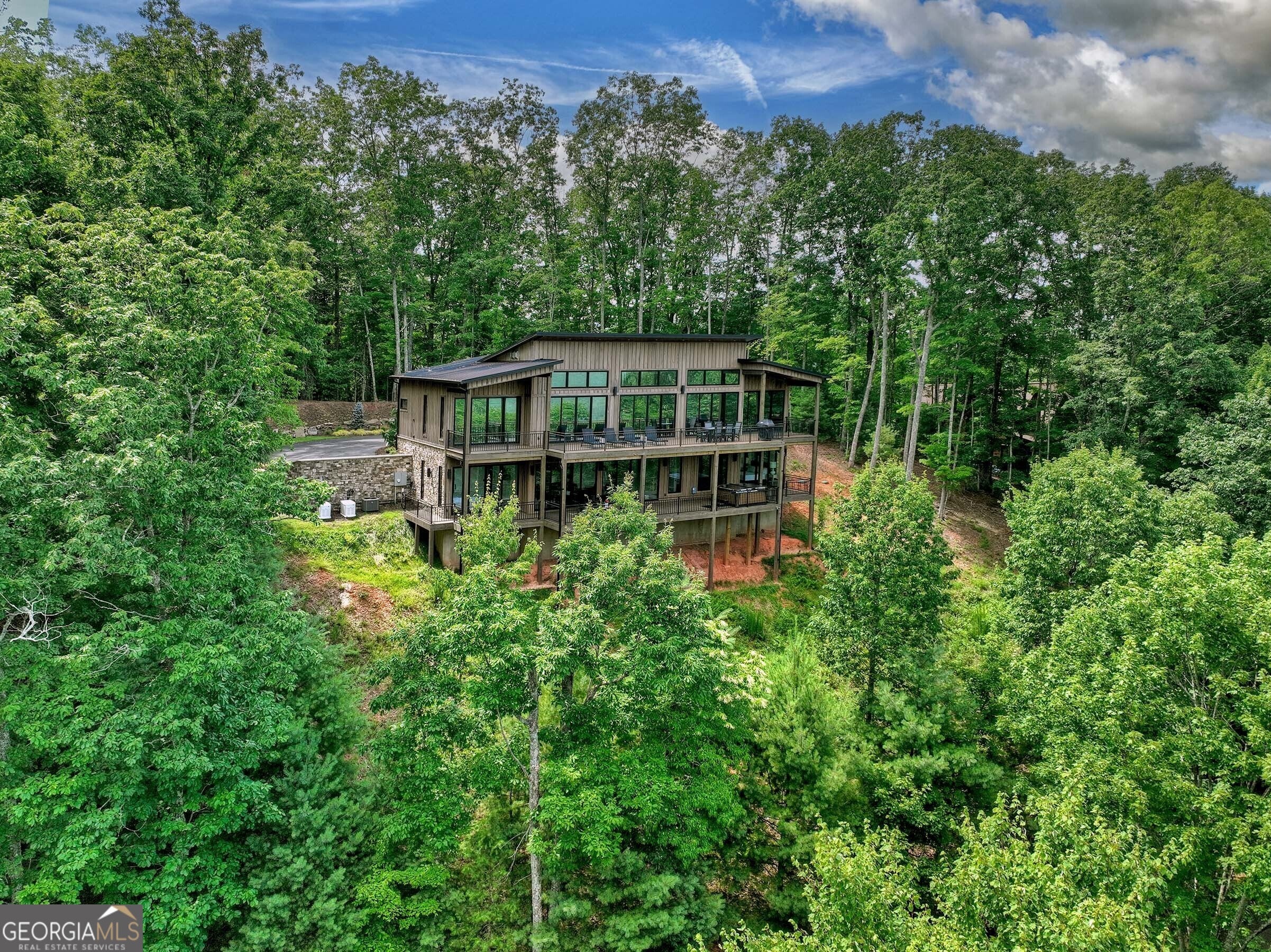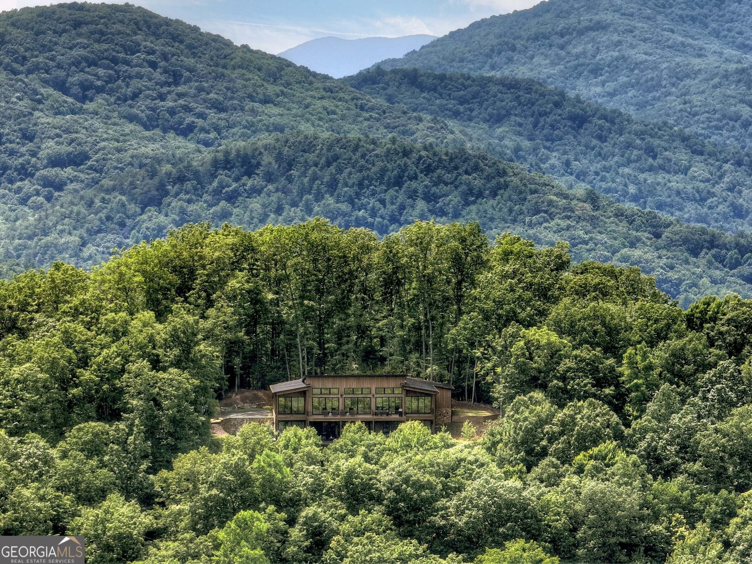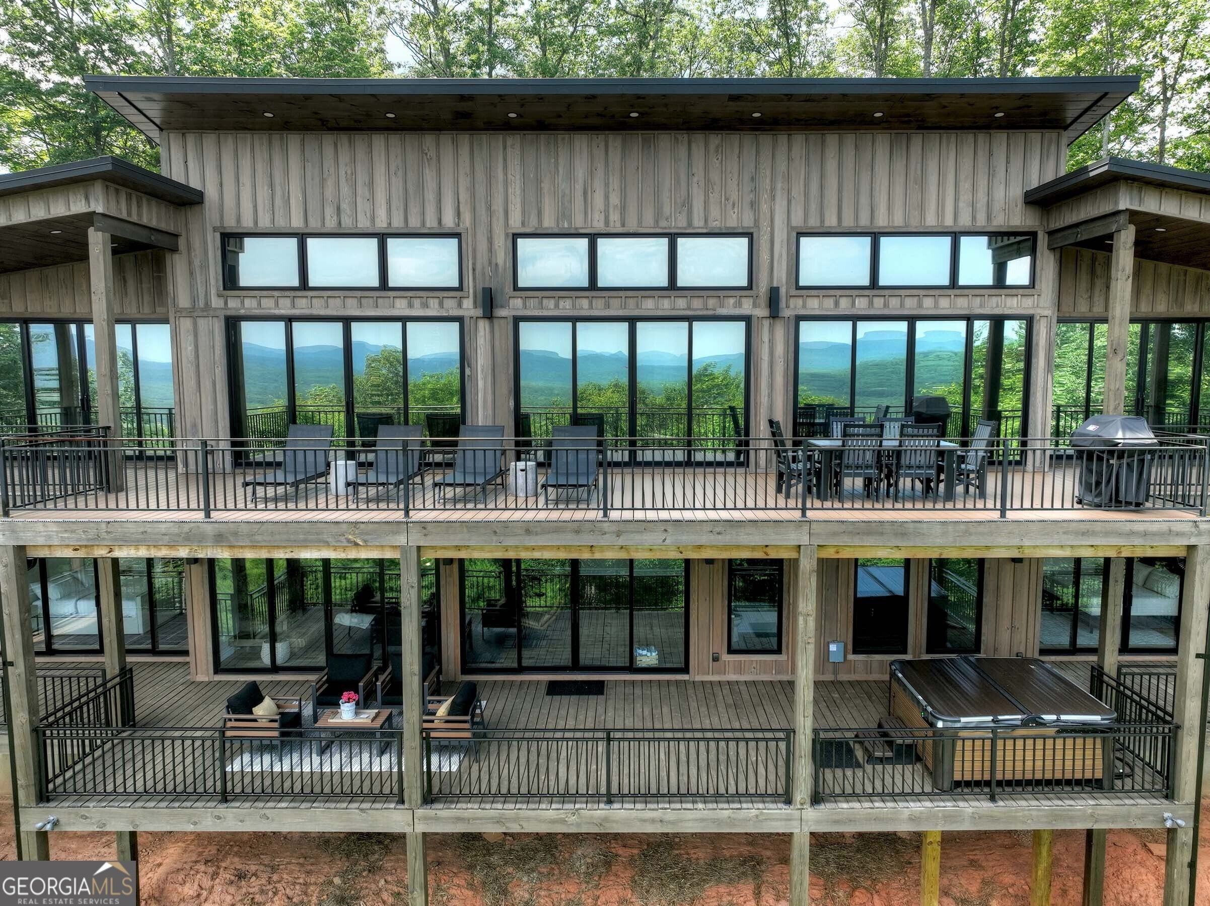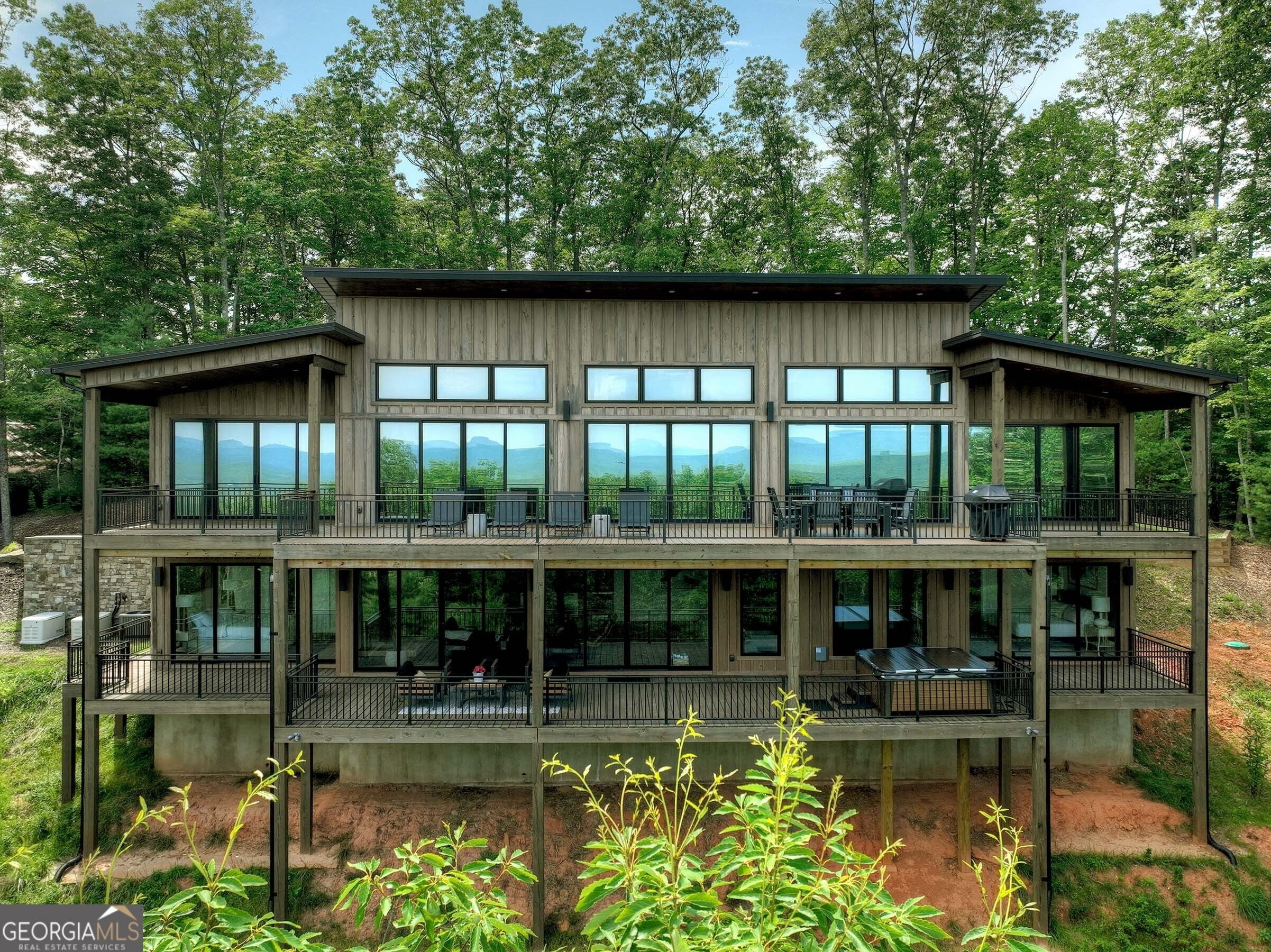 Seamlessly blending contemporary elegance with the timeless rustic warmth of a true mountain chalet, The Lodge at Little Creek Overlook beckons for a redefined luxury mountain lifestyle one of its kind. Tennessee field stone, cypress wood siding and rolled steel blend harmoniously with walls of glass as you're greeted with the front facade of the home. Gaze through the front door and see through the home and out towards the layered mountain views and panoramic scenery atop the mountain. Backing up to acres of USNF land, this home is completely private and tucked away. On the interior, find it complete with five bedroom suites and two powder rooms. The main level is a stunning open-concept with a large living room accented by a custom masonry stone and steel fireplace. Dining and kitchen make for the perfect entertainer's home. Sliders off the living, dining and even butler's pantry from the kitchen open the outdoors and invite the mountains inside. Find the gourmet kitchen adorned with custom cabinetry and quartz countertops with waterfall edges. Home is fully equipped and stocked for the chef at heart. Main level has a large laundry room, a powder room, two primary suites, and a wing leading to the fully-finished two car garage. Main level deck is built with TREX decking and steel railings. On the terrace level, find a large den area with fireplace, full bar, three additional bedroom suites, bountiful storage and utility areas. Walk-out terrace deck is set up with a jacuzzi overlooking the lush mountain scenery. Home has been equipped with two generators, two buried propane tanks, a TESLA charger, and sold fully furnished! Located in the highly sought-after Aska Adventure Area and minutes from the Toccoa River, Lake Blue Ridge, and the best hiking and biking trails all while gated w/ all paved access. The fine details of this home are at length -- reach out for more information. Discover the contemporary mountain lifestyle today!
