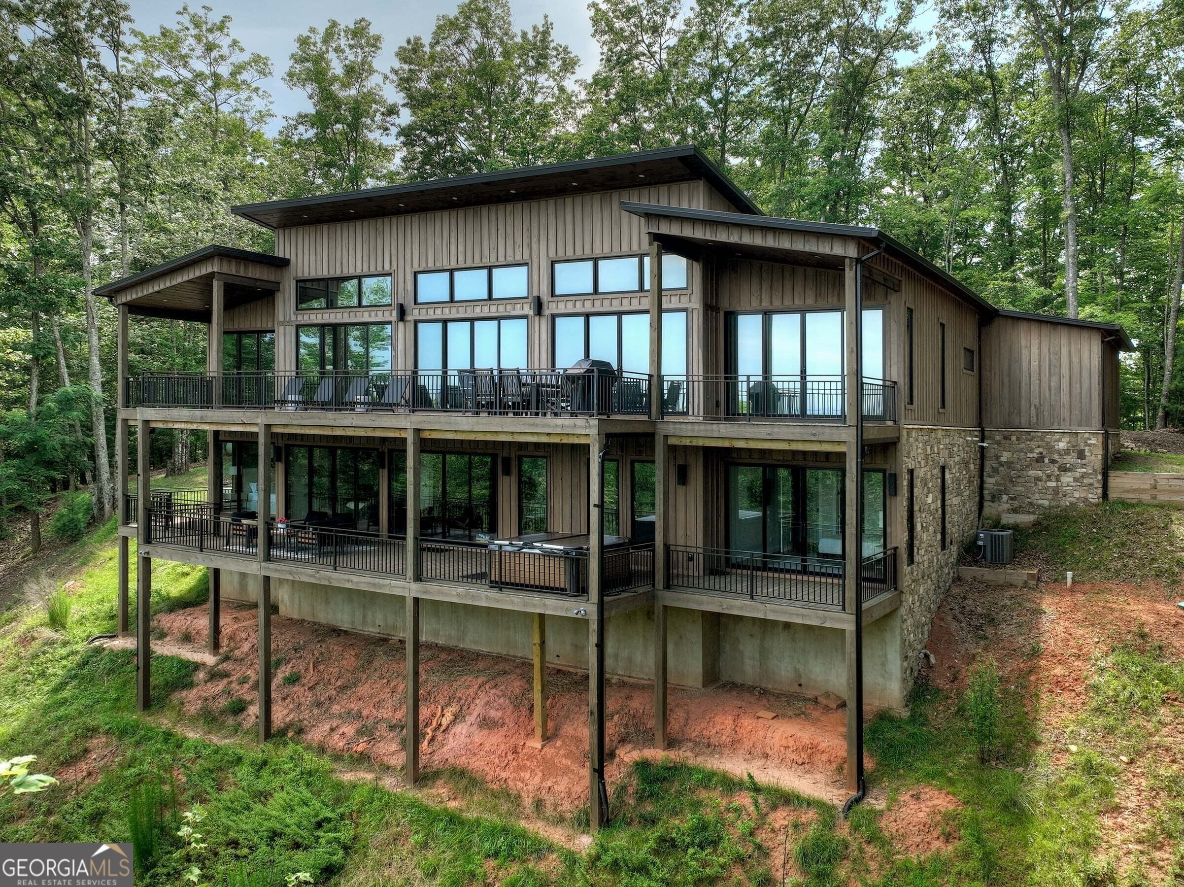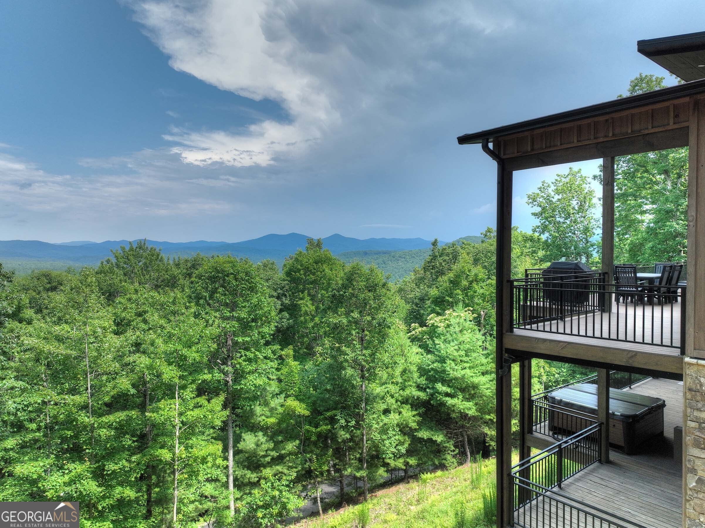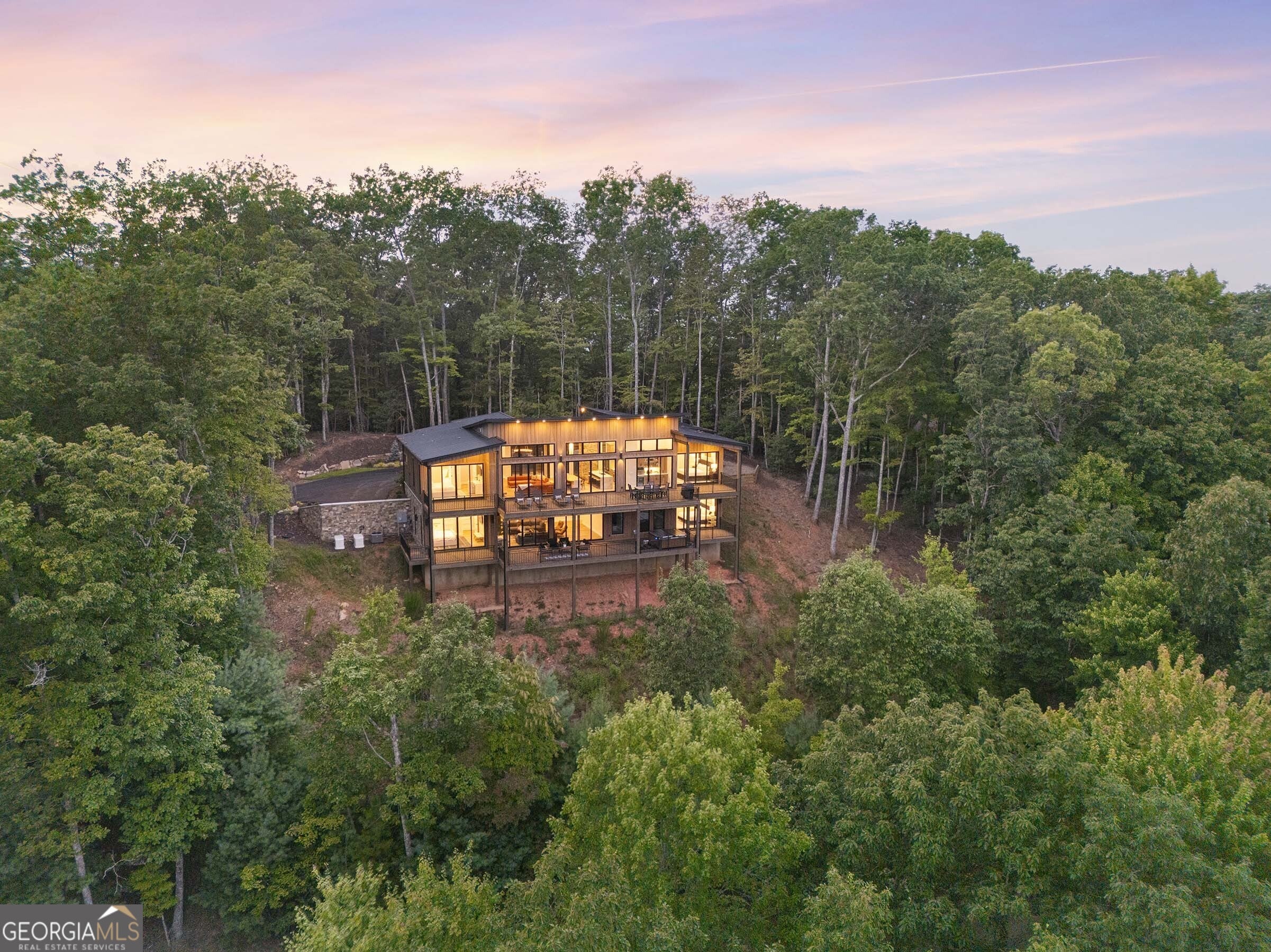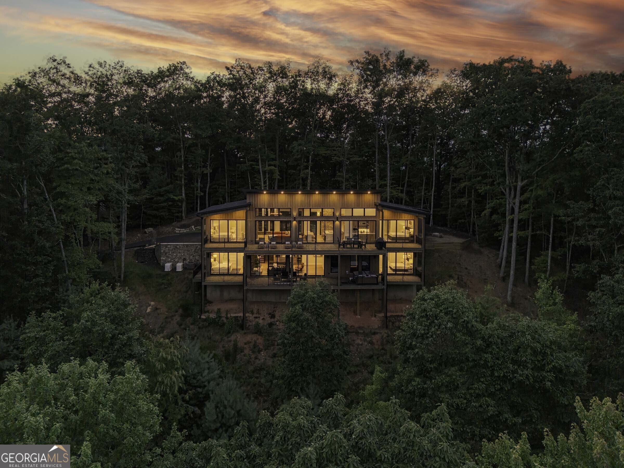 Seamlessly blending contemporary elegance with the timeless rustic warmth of a true mountain chalet, The Lodge at Little Creek Overlook beckons for a redefined luxury mountain lifestyle one of its kind. Tennessee field stone, cypress wood siding and rolled steel blend harmoniously with walls of glass as you're greeted with the front facade of the home. Gaze through the front door and see through the home and out towards the layered mountain views and panoramic scenery atop the mountain. Backing up to acres of USNF land, this home is completely private and tucked away. On the interior, find it complete with five bedroom suites and two powder rooms. The main level is a stunning open-concept with a large living room accented by a custom masonry stone and steel fireplace. Dining and kitchen make for the perfect entertainer's home. Sliders off the living, dining and even butler's pantry from the kitchen open the outdoors and invite the mountains inside. Find the gourmet kitchen adorned with custom cabinetry and quartz countertops with waterfall edges. Home is fully equipped and stocked for the chef at heart. Main level has a large laundry room, a powder room, two primary suites, and a wing leading to the fully-finished two car garage. Main level deck is built with TREX decking and steel railings. On the terrace level, find a large den area with fireplace, full bar, three additional bedroom suites, bountiful storage and utility areas. Walk-out terrace deck is set up with a jacuzzi overlooking the lush mountain scenery. Home has been equipped with two generators, two buried propane tanks, a TESLA charger, and sold fully furnished! Located in the highly sought-after Aska Adventure Area and minutes from the Toccoa River, Lake Blue Ridge, and the best hiking and biking trails all while gated w/ all paved access. The fine details of this home are at length -- reach out for more information. Discover the contemporary mountain lifestyle today!