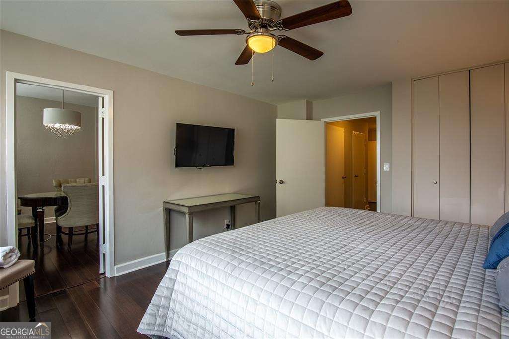 Short, Mid-term, & Long-Term Rentals Available. Applicants should have a verifiable employment history, a minimum gross monthly income of three times the rent, and a good credit score. Immediately Available, No Minimum Lease Term. No Rental Arbitrage allowed. Renovated two-bedroom, one-bathroom unit offers a stylish and fully equipped living space. The property features a combined living and dining area, a separate kitchen with a large walk-in pantry, and a dedicated storage room. Hardwood floors run throughout the home, adding warmth and character. The primary bedroom is furnished with a king-size bed, a premium-quality hybrid mattress, and a wall-mounted flat-screen TV. The secondary bedroom includes a queen-size bed with a hybrid mattress and offers a beautiful view of the city. Both bedrooms provide privacy and direct access to the shared bathroom, which is clean, modern, and finished in bright white tones. The living area is designed for relaxation, complete with an adjustable wall-mounted flat-screen TV. The kitchen is fully stocked and ready for use, making it easy to host guests. The unit also includes high-speed internet, blinds, and a private supply closet secured with a digital combination lock. Freshly painted just one month ago in Sherwin-Williams Pure White, this home is turnkey and fully loaded with furnishings, including premium mattresses and all kitchenware. Perfectly prepared to comfortably accommodate several guests, this property is a rare find with both style and convenience. Landlord pays homeowner association fee, which includes everything: 300 MB Xfinity Internet, Electricity, Heating, Cooling, Gas for cooking Range, Water, Sewer, plus all the HOA Amenities. One assigned parking space, typically valued at $55/night, full-size inground pool, and laundry facility available.