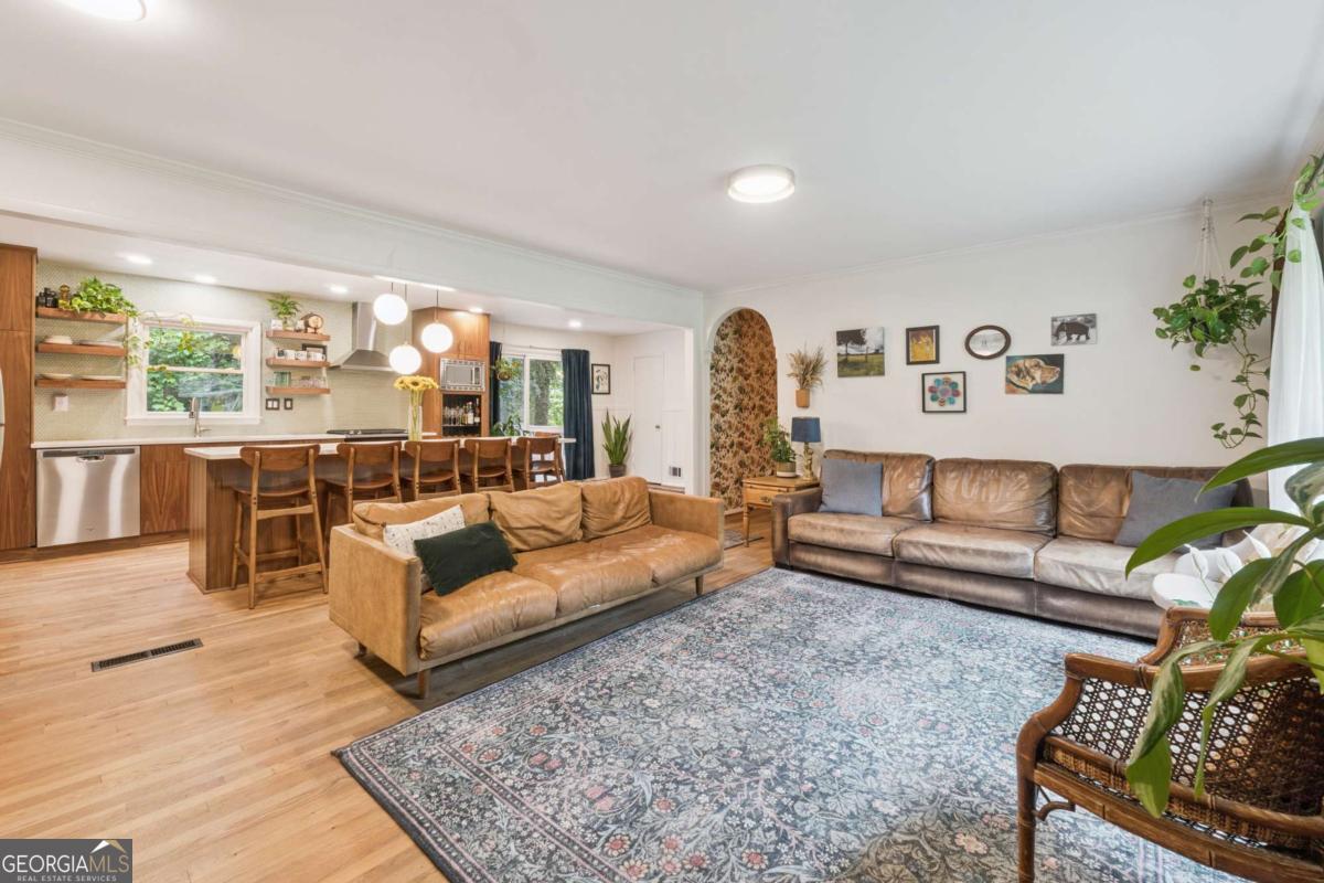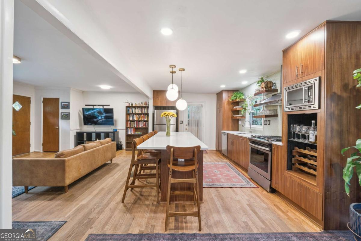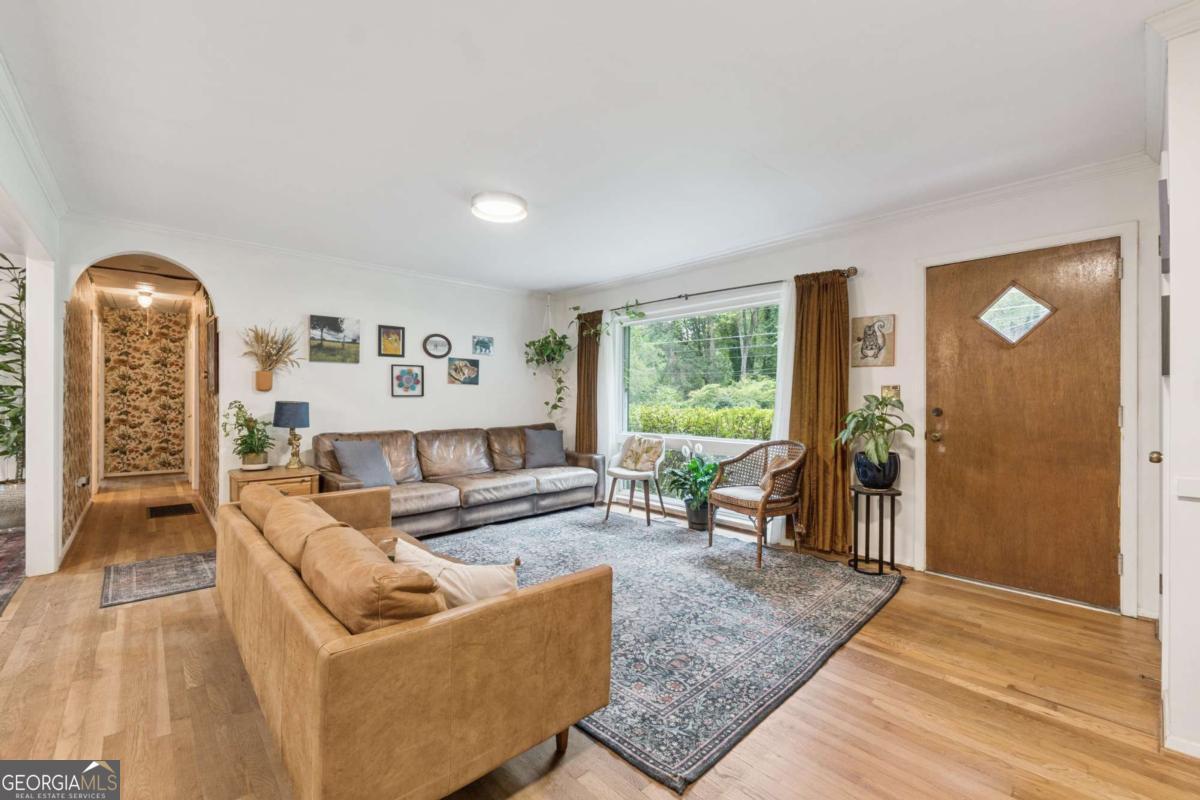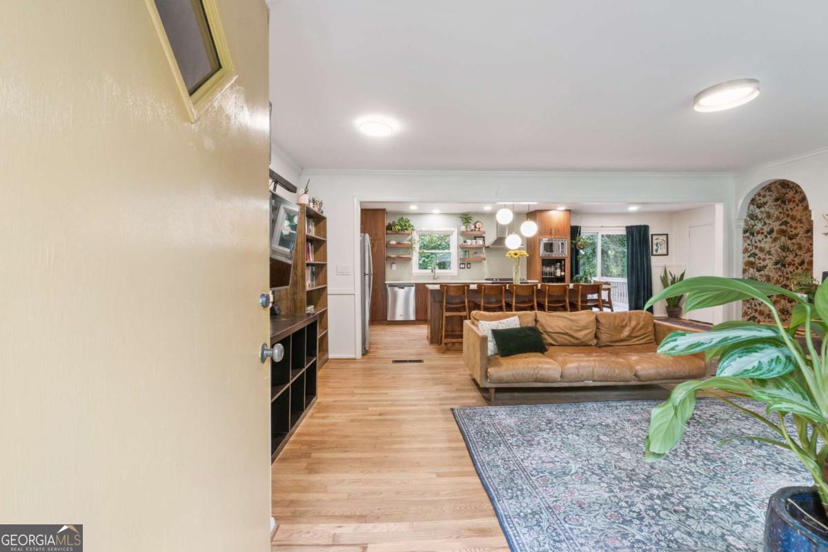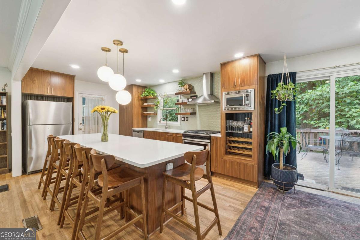 From the moment you pull up to this stunning mid-century modern home, you'll be captivated by its undeniable curb appeal. Nestled on a spacious and level half-acre lot, the lush green lawn, freshly painted exterior, and new shutters make a striking first impression. Step inside and you'll find a home that beautifully blends preserved mid-century touches with modern updates that elevate the home's timeless style. True to mid-century modern design, the owners have maintained the architectural charm while introducing thoughtful upgrades that make this home both elegant and functional. The living room, filled with light from the large floor to ceiling portrait window, flows seamlessly into a show-stopping, fully renovated kitchen - straight out of a magazine. Featuring floor-to-ceiling cabinetry, a statement aqua backsplash that runs counter to ceiling, and a massive 9-foot island, this space is perfect for both cooking enthusiasts and entertainers. The island currently doubles as a dining table, but there's also ample room to add a more traditional table in the adjacent space if desired. As you move through the home, you'll be delighted by a hallway adorned with designer House of Hackney wallpaper, bringing a whimsical, garden-inspired feel indoors. This enchanting touch hints at the botanical paradise waiting outside. Garden lovers, take note! The yard has been meticulously curated and maintained by passionate owners. From March through July, enjoy five months of continuous blooms: hundreds of towering lilies (some over 6 feet tall), vibrant purple liatris, iris, gladiolus, multiple varieties of peonies with flowers as large as dinner plates, and so much more. Spring welcomes massive azalea bushes in both front and back, while Chinese fringe trees provide year-round color and texture. In winter, the large camellia tree bursts with red blooms from December to February. And let's not forget the fruiting peach trees in the front yard-producing hundreds of peaches each season. Inside, all bedrooms have been freshly painted, and the home is accented with stylish new light fixtures and modern blinds throughout. The primary bedroom features its own private half-bath with a new vanity. Location-wise, you couldn't ask for more. You're just a 5-minute drive to vibrant downtown Chamblee, home to hip restaurants, breweries, distilleries, and boutiques. A foodie's dream, you're also minutes from the world-renowned Buford Highway culinary corridor. Enjoy walking access to Dynamo Swim Club, CDC Chamblee, and proximity to Mercer University, I-85, the highly anticipated Dresden Park upgrade, and more. Top it all off with wonderful neighbors and a peaceful, garden-like setting, and you've found a truly special home that's the best of both past and present.