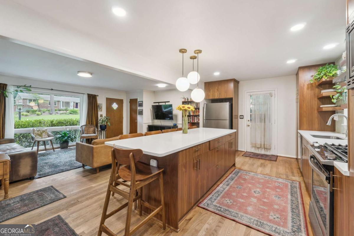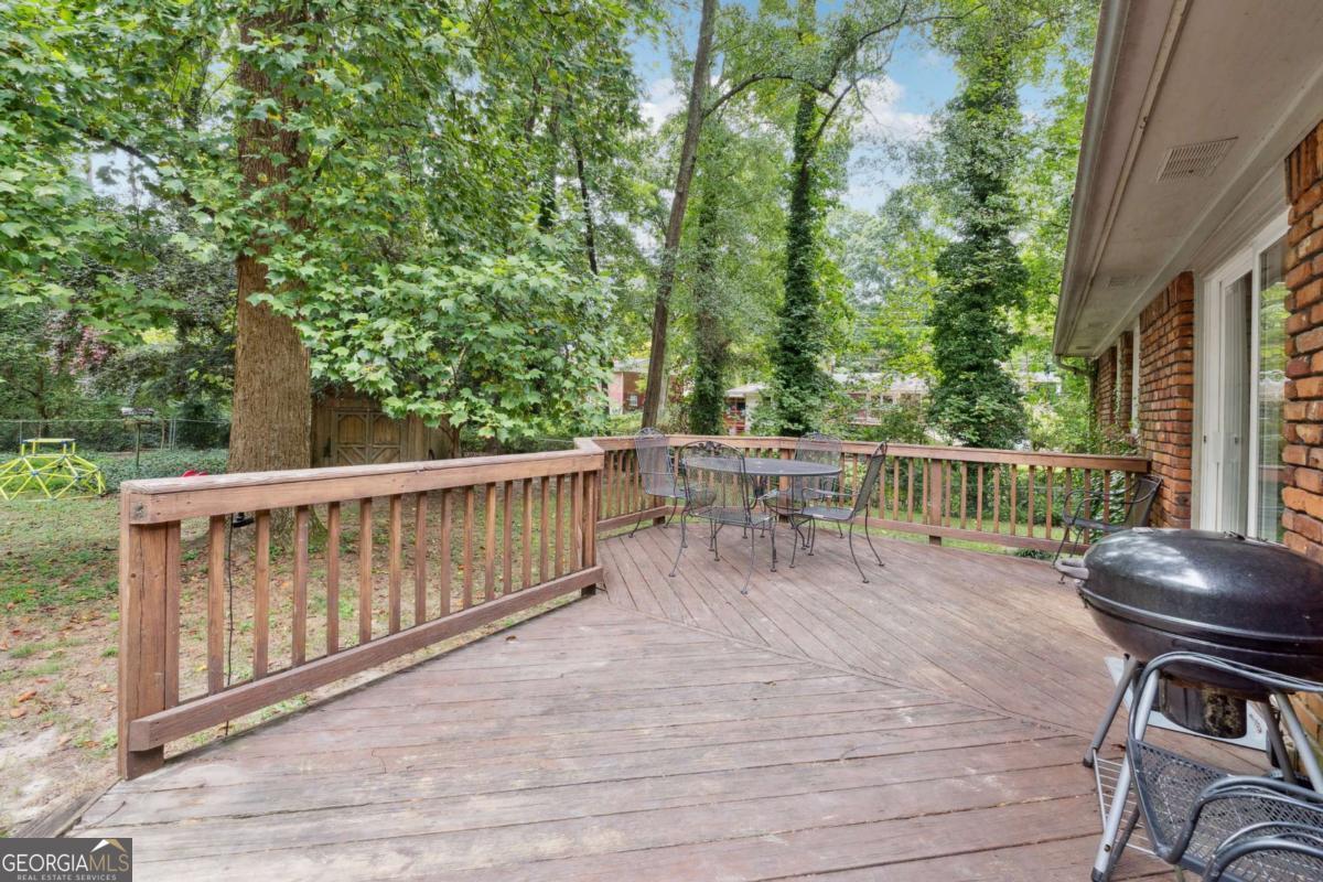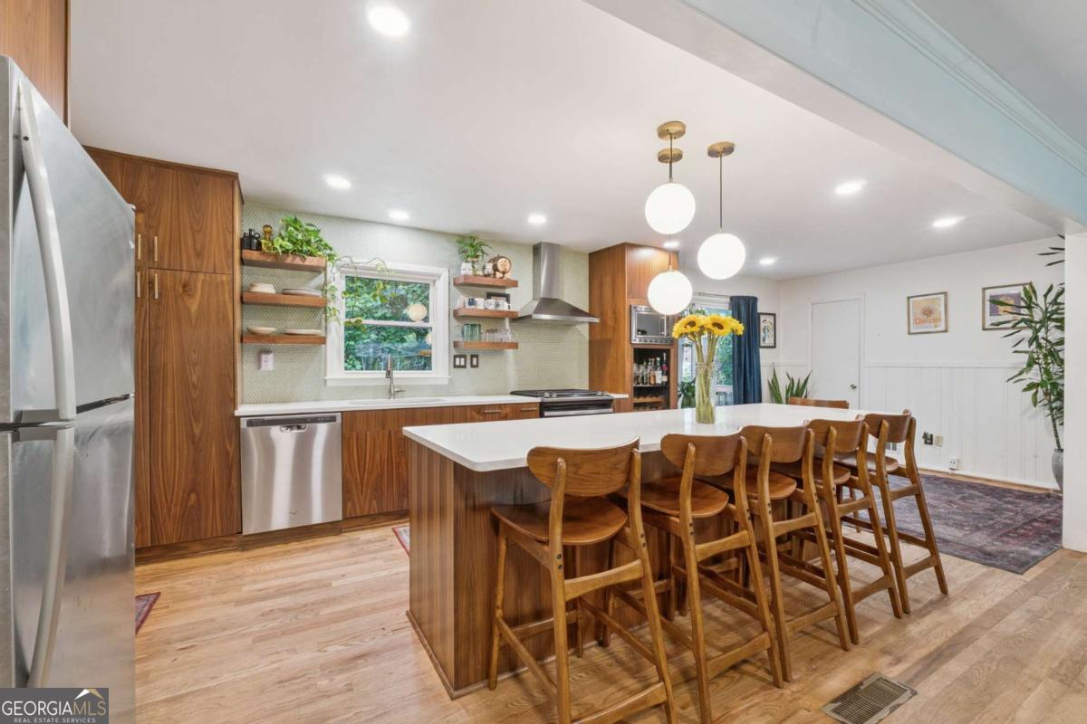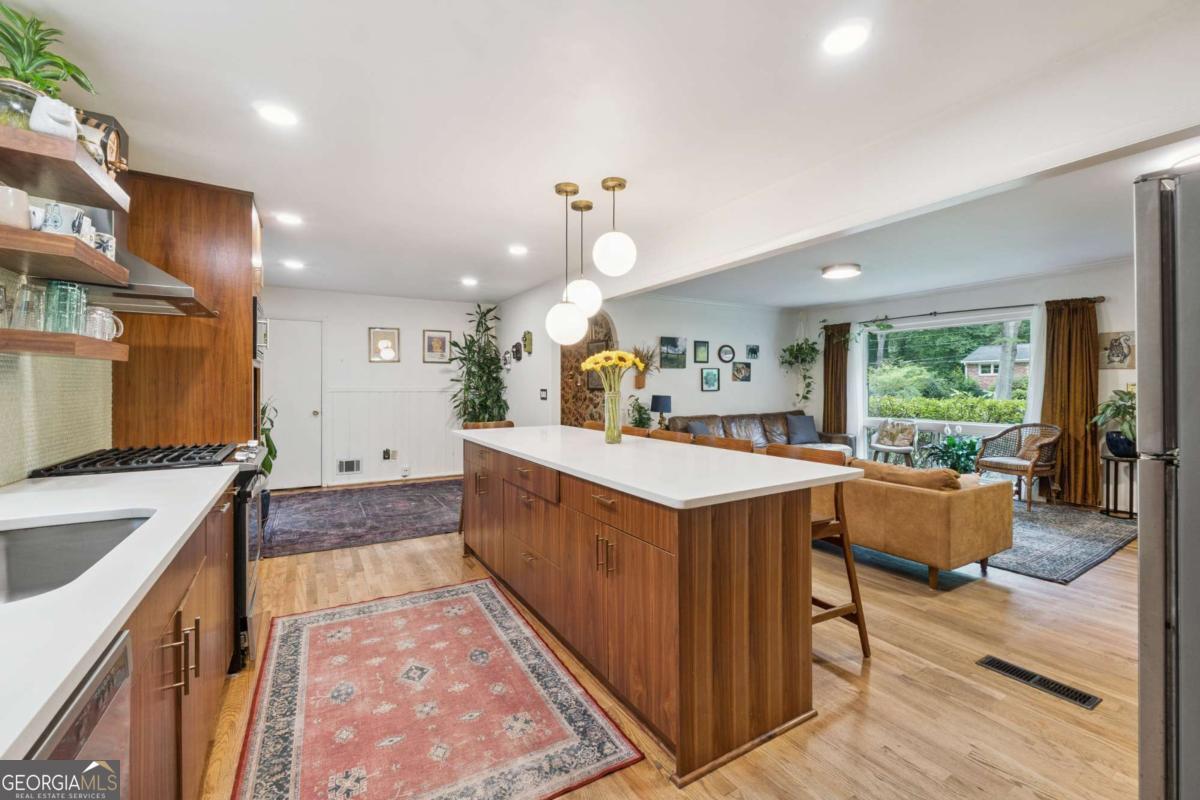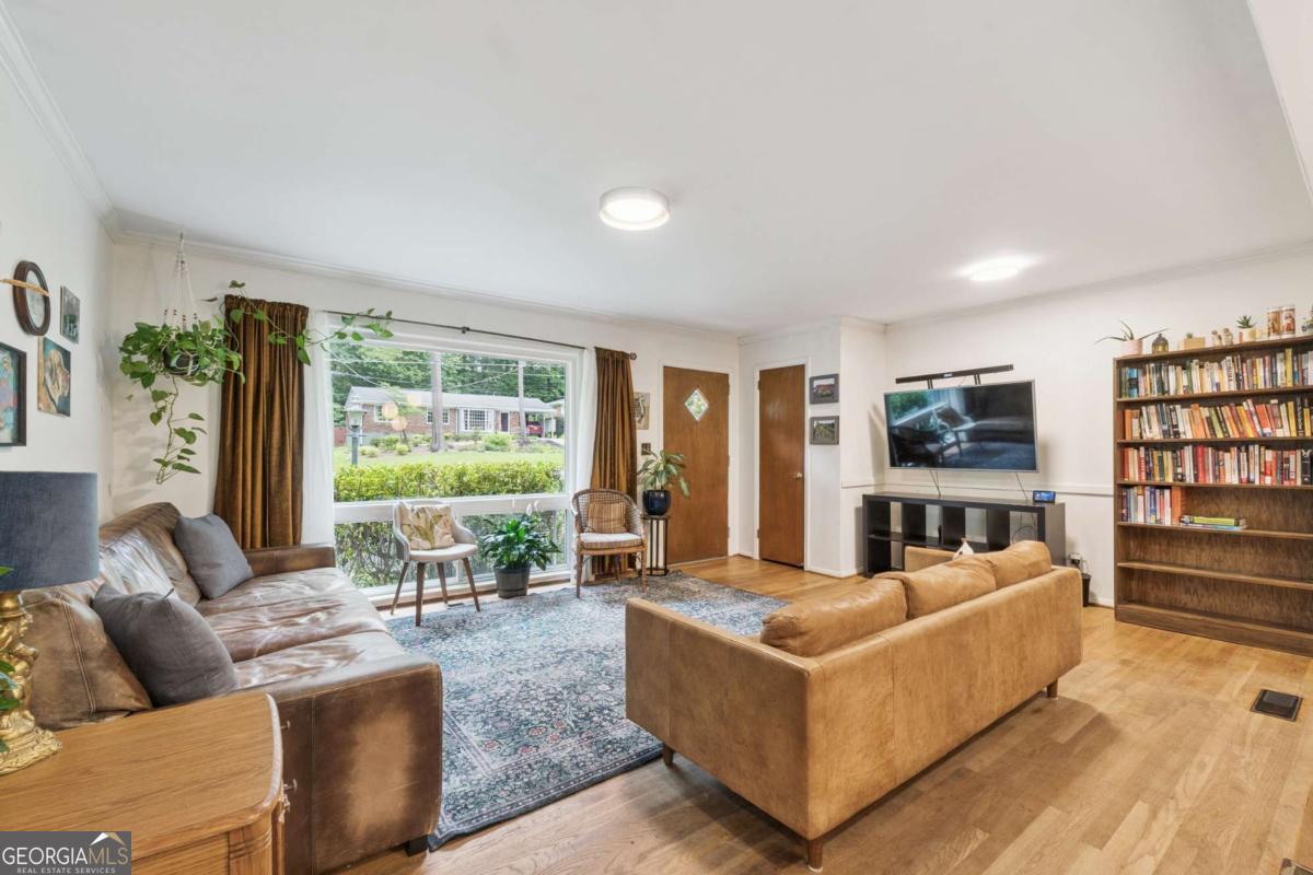 From the moment you pull up to this stunning mid-century modern home, you'll be captivated by its undeniable curb appeal. Nestled on a spacious and level half-acre lot, the lush green lawn, freshly painted exterior, and new shutters make a striking first impression. Step inside and you'll find a home that beautifully blends preserved mid-century touches with modern updates that elevate the home's timeless style. True to mid-century modern design, the owners have maintained the architectural charm while introducing thoughtful upgrades that make this home both elegant and functional. The living room, filled with light from the large floor to ceiling portrait window, flows seamlessly into a show-stopping, fully renovated kitchen - straight out of a magazine. Featuring floor-to-ceiling cabinetry, a statement aqua backsplash that runs counter to ceiling, and a massive 9-foot island, this space is perfect for both cooking enthusiasts and entertainers. The island currently doubles as a dining table, but there's also ample room to add a more traditional table in the adjacent space if desired. As you move through the home, you'll be delighted by a hallway adorned with designer House of Hackney wallpaper, bringing a whimsical, garden-inspired feel indoors. This enchanting touch hints at the botanical paradise waiting outside. Garden lovers, take note! The yard has been meticulously curated and maintained by passionate owners. From March through July, enjoy five months of continuous blooms: hundreds of towering lilies (some over 6 feet tall), vibrant purple liatris, iris, gladiolus, multiple varieties of peonies with flowers as large as dinner plates, and so much more. Spring welcomes massive azalea bushes in both front and back, while Chinese fringe trees provide year-round color and texture. In winter, the large camellia tree bursts with red blooms from December to February. And let's not forget the fruiting peach trees in the front yard-producing hundreds of peaches each season. Inside, all bedrooms have been freshly painted, and the home is accented with stylish new light fixtures and modern blinds throughout. The primary bedroom features its own private half-bath with a new vanity. Location-wise, you couldn't ask for more. You're just a 5-minute drive to vibrant downtown Chamblee, home to hip restaurants, breweries, distilleries, and boutiques. A foodie's dream, you're also minutes from the world-renowned Buford Highway culinary corridor. Enjoy walking access to Dynamo Swim Club, CDC Chamblee, and proximity to Mercer University, I-85, the highly anticipated Dresden Park upgrade, and more. Top it all off with wonderful neighbors and a peaceful, garden-like setting, and you've found a truly special home that's the best of both past and present.