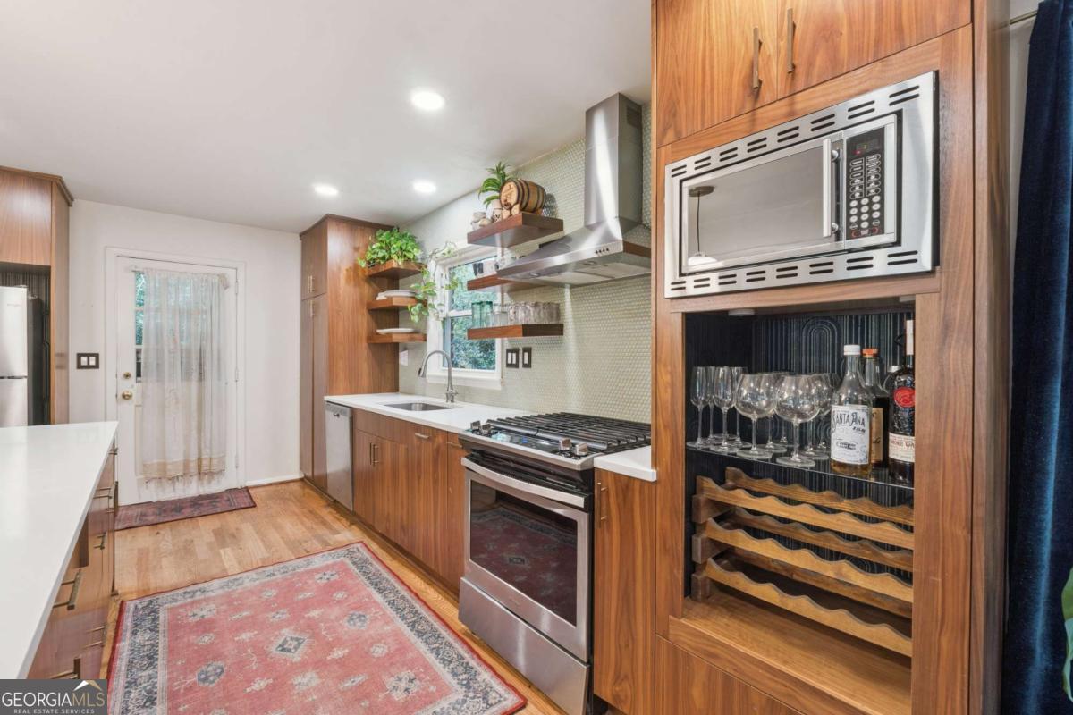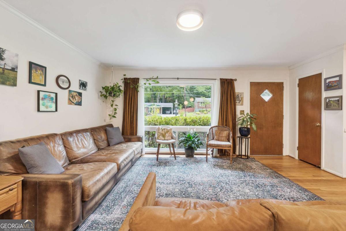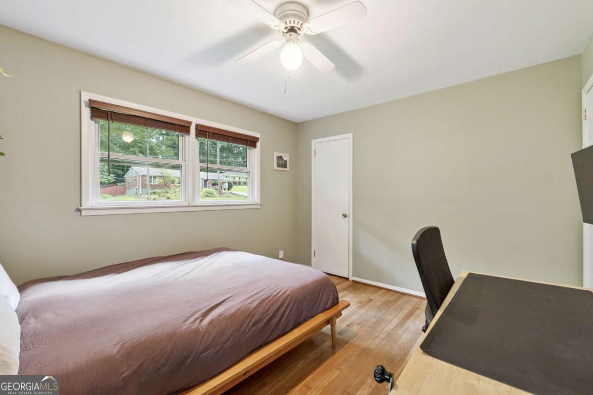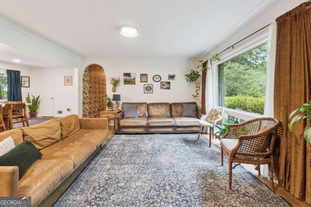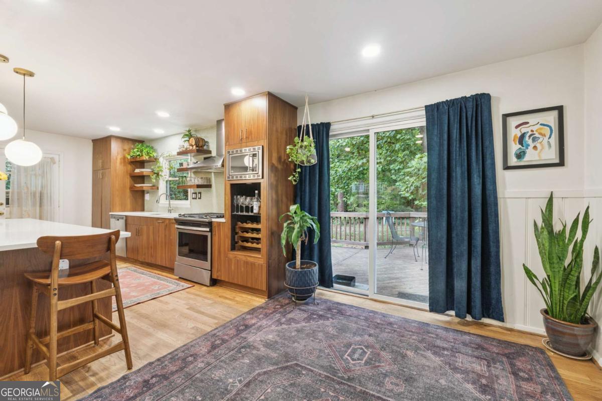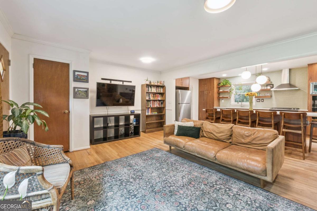 From the moment you pull up to this stunning mid-century modern home, you'll be captivated by its undeniable curb appeal. Nestled on a spacious and level half-acre lot, the lush green lawn, freshly painted exterior, and new shutters make a striking first impression. Step inside and you'll find a home that beautifully blends preserved mid-century touches with modern updates that elevate the home's timeless style. True to mid-century modern design, the owners have maintained the architectural charm while introducing thoughtful upgrades that make this home both elegant and functional. The living room, filled with light from the large floor to ceiling portrait window, flows seamlessly into a show-stopping, fully renovated kitchen - straight out of a magazine. Featuring floor-to-ceiling cabinetry, a statement aqua backsplash that runs counter to ceiling, and a massive 9-foot island, this space is perfect for both cooking enthusiasts and entertainers. The island currently doubles as a dining table, but there's also ample room to add a more traditional table in the adjacent space if desired. As you move through the home, you'll be delighted by a hallway adorned with designer House of Hackney wallpaper, bringing a whimsical, garden-inspired feel indoors. This enchanting touch hints at the botanical paradise waiting outside. Garden lovers, take note! The yard has been meticulously curated and maintained by passionate owners. From March through July, enjoy five months of continuous blooms: hundreds of towering lilies (some over 6 feet tall), vibrant purple liatris, iris, gladiolus, multiple varieties of peonies with flowers as large as dinner plates, and so much more. Spring welcomes massive azalea bushes in both front and back, while Chinese fringe trees provide year-round color and texture. In winter, the large camellia tree bursts with red blooms from December to February. And let's not forget the fruiting peach trees in the front yard-producing hundreds of peaches each season. Inside, all bedrooms have been freshly painted, and the home is accented with stylish new light fixtures and modern blinds throughout. The primary bedroom features its own private half-bath with a new vanity. Location-wise, you couldn't ask for more. You're just a 5-minute drive to vibrant downtown Chamblee, home to hip restaurants, breweries, distilleries, and boutiques. A foodie's dream, you're also minutes from the world-renowned Buford Highway culinary corridor. Enjoy walking access to Dynamo Swim Club, CDC Chamblee, and proximity to Mercer University, I-85, the highly anticipated Dresden Park upgrade, and more. Top it all off with wonderful neighbors and a peaceful, garden-like setting, and you've found a truly special home that's the best of both past and present.