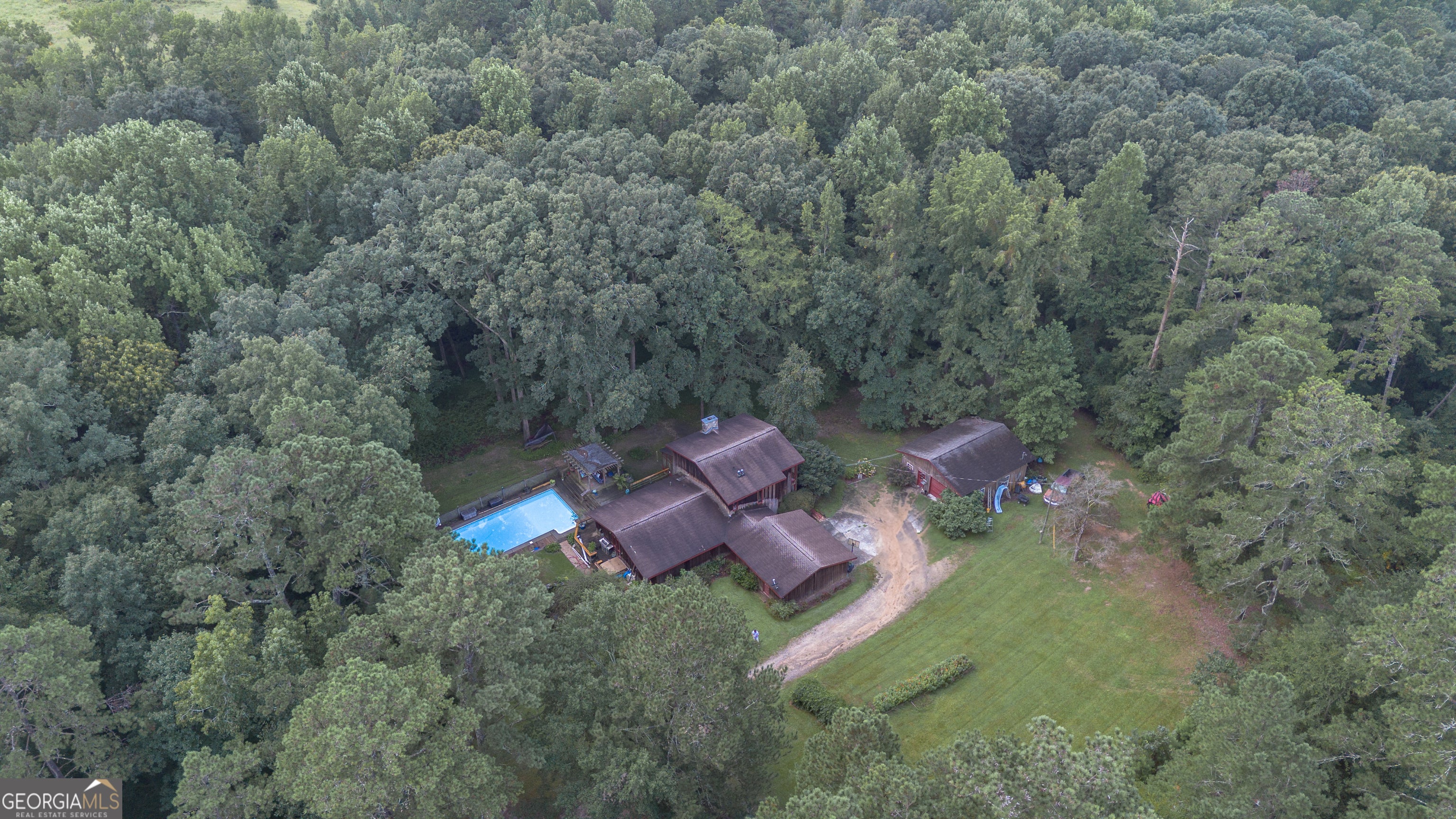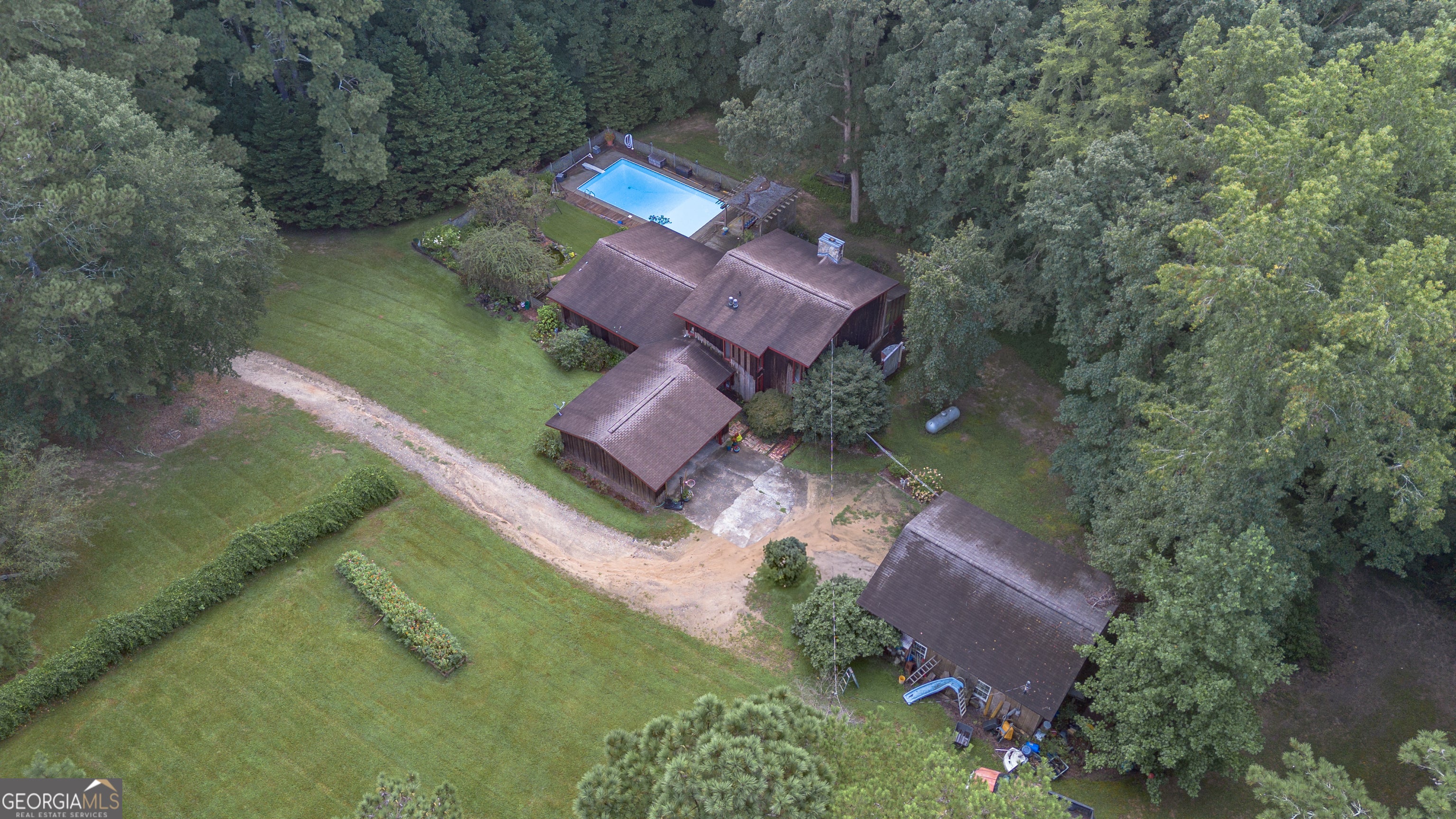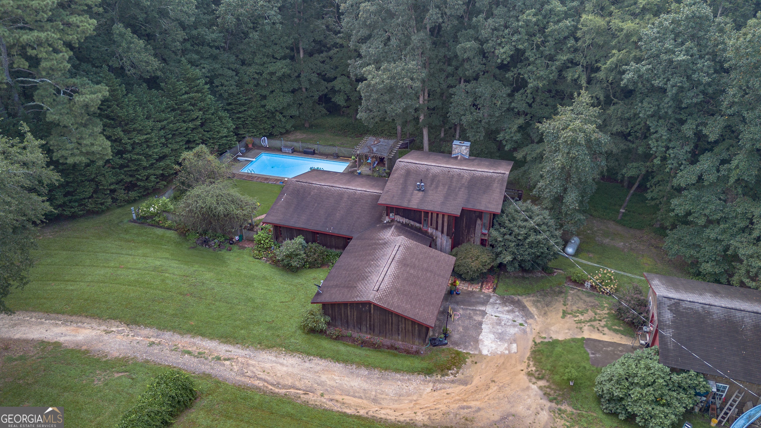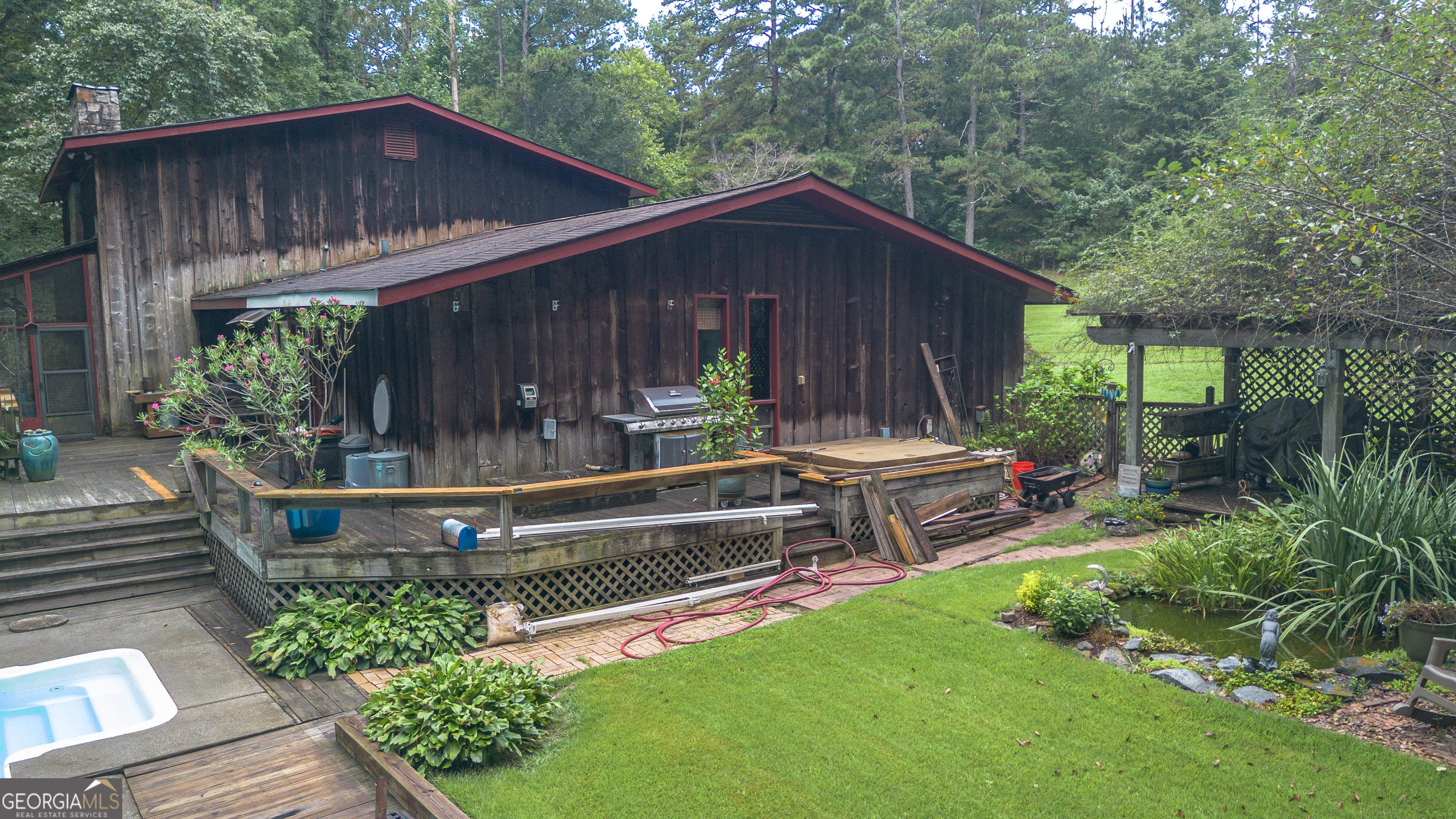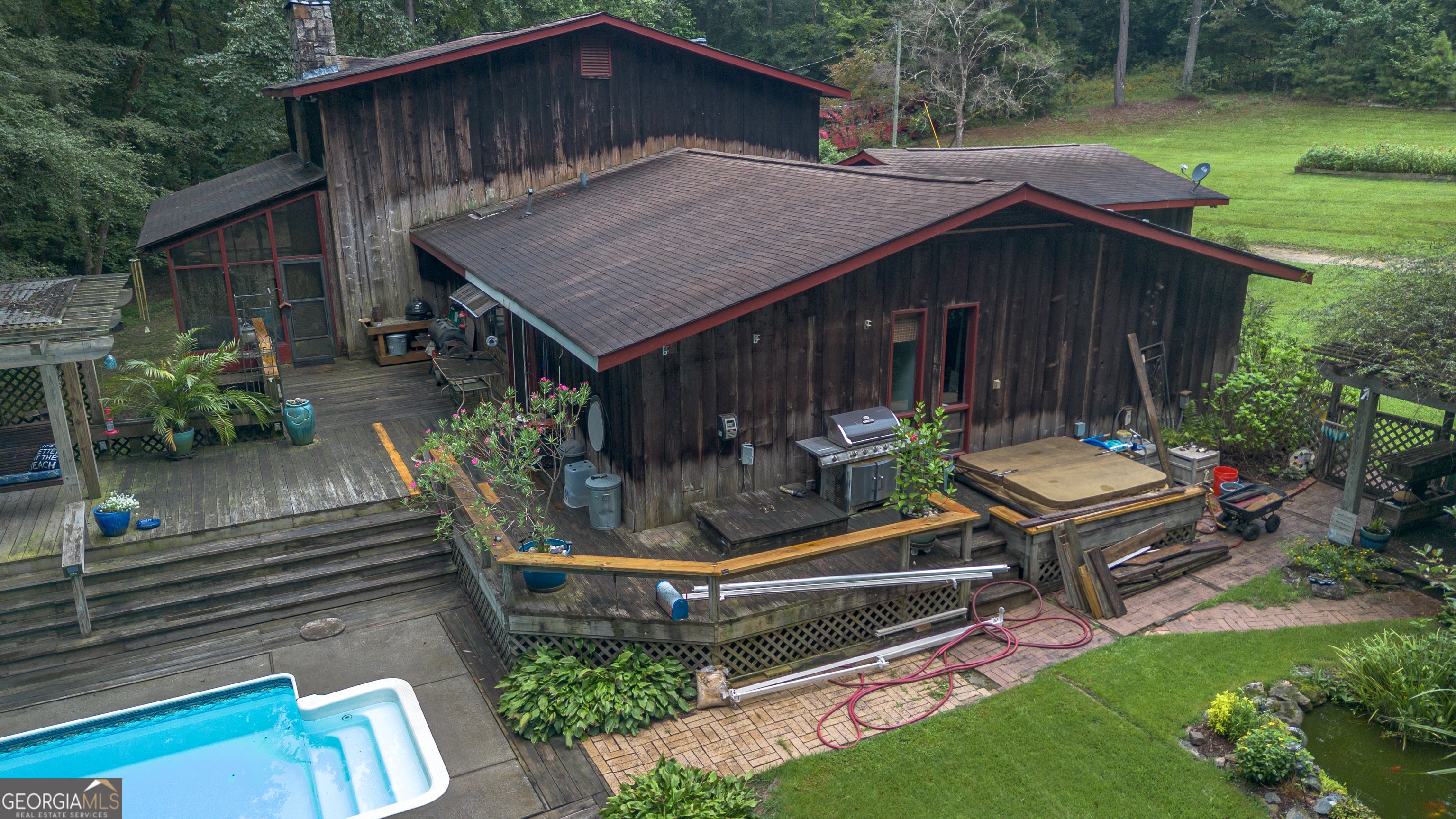 Rustic Country Home on 8+ Acres with Natural Views. Welcome to your private oasis! Nestled on over 8 acres of beautifully landscaped grounds, this rustic country home offers a perfect blend of tranquility and modern comforts. With breathtaking expansive views of lush natural woods, a serene creek, and abundant wildlife, you'll feel a world away while still enjoying convenient access to nearby amenities. This inviting 3-bedroom, 2-bath residence features a spacious primary suite complete with an en suite bathroom that boasts a jetted garden tub and French doors leading out to the back deck. The heart of the home is the Great Room, highlighted by soaring 20-foot ceilings, a stunning stone fireplace with gas logs, and built-ins that create a warm and inviting atmosphere. Step outside to your private paradise! Enjoy sunny days lounging by the impressive 20x40 saltwater pool with a durable vinyl liner, or unwind under the pergola with a hot tub that overlooks the pool area. For those who appreciate nature, a separate pergola harbors a Koi pond, providing a perfect spot for relaxation. The property also features a well-equipped woodworking shop/garage, complete with heating and air conditioning in the office area-ideal for hobbyists or those needing extra workspace. The full basement is partially finished, offering endless possibilities for additional living space or storage. Outdoor enthusiasts will appreciate the large fenced-in dog pen, making this home perfect for pet lovers. Additional highlights include a screened-in back porch, ideal for enjoying those warm summer evenings without pesky bugs. Don't miss this rare opportunity to own a slice of country paradise with all the comforts of home. Schedule your private showing today and experience the serenity this property has to offer! The possibilities are endless.