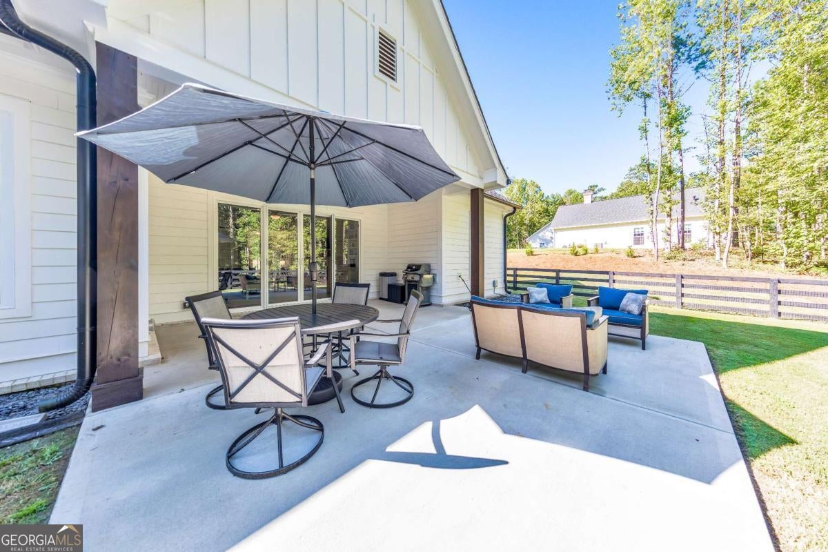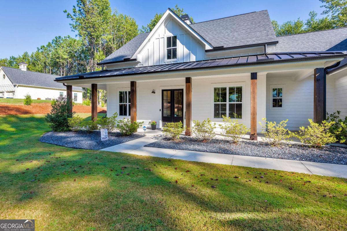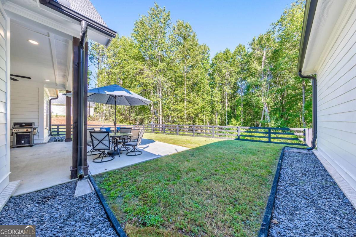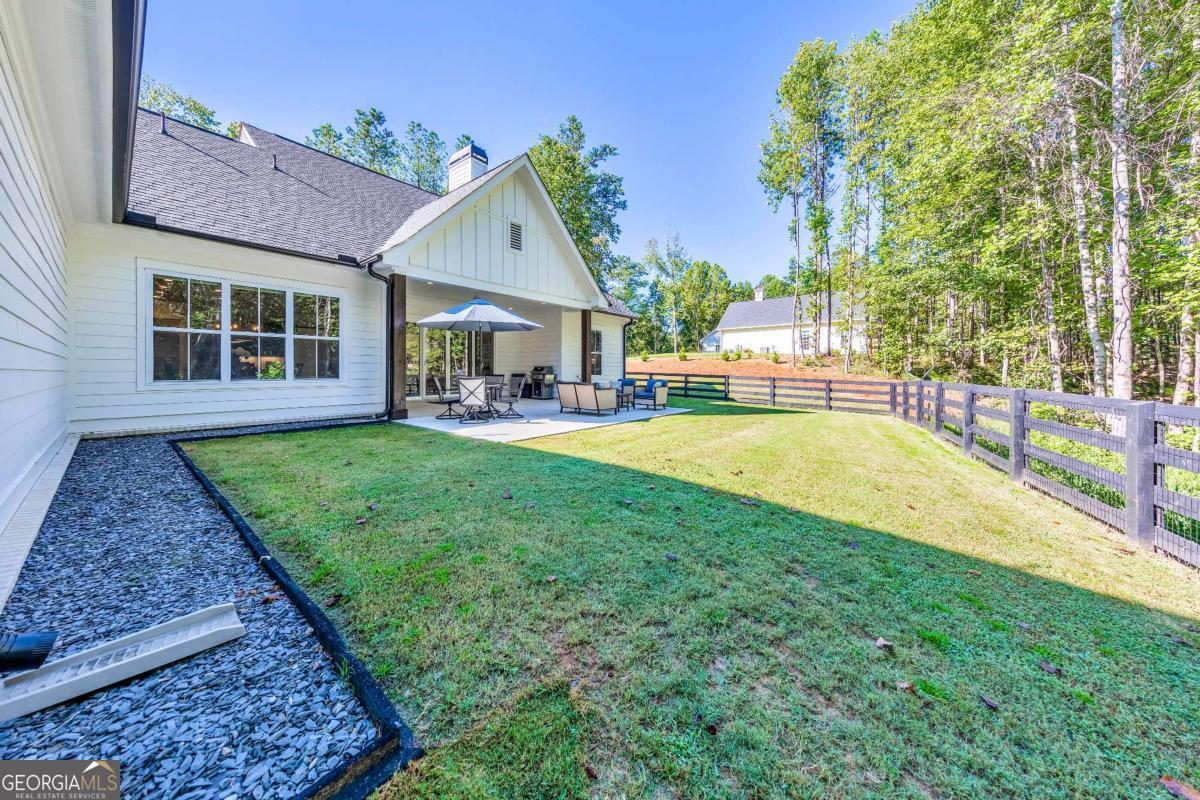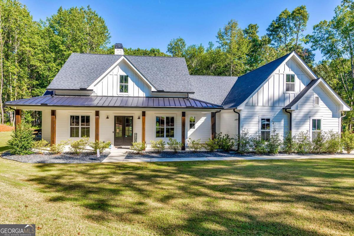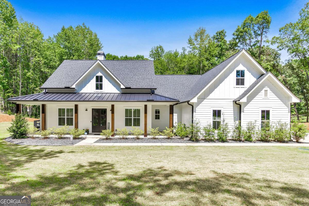 Looking for a home that checks all of your boxes? Look no further! Welcome to this stunning 2023-built modern farmhouse, offering 4 bedrooms and 3 baths on a picturesque 1.5 acre lot in a prime Woodstock location. From the moment you step onto the charming rocking chair front porch, you'll feel right at home. Inside, the open-concept design is filled with natural light, showcasing a bright and airy living space that's perfect for both everyday living and entertaining. The chef's kitchen is a true showpiece with an expansive island, quartz countertops, stainless steel appliances, a farmhouse sink, and a large walk-in pantry. An office sits just off the main living area, providing a quiet space to work from home. The main-level primary suite is a luxurious retreat with a spa-like bath boasting a double shower and dual vanities. The oversized walk-in closet is a dream and connects directly to the laundry room for added convenience. Two additional main-level bedrooms share a beautifully designed hall bath with a double vanity, while a versatile flex room with a dog door to the backyard adds extra function. Upstairs, a private bedroom and full bath create the ideal suite for teens, guests, or extended family. Thoughtful details include 8-foot solid core doors on the main level, soft-close cabinets/drawers throughout, a tankless gas water heater, and a washer and gas dryer included. Outside, the expansive covered back porch and extended patio overlook the level, fenced backyard, providing the perfect backdrop for weekend barbecues, playtime, or simply relaxing while kids and pets enjoy the space. Blending modern luxury with timeless farmhouse charm, this home is designed for comfort, style, and lasting memories. With its incredible features and inviting spaces, it's a place you'll be proud to call home for years to come!
