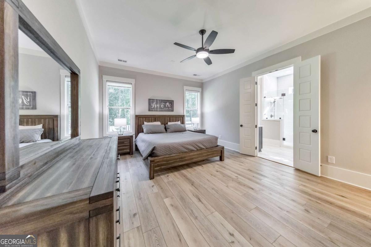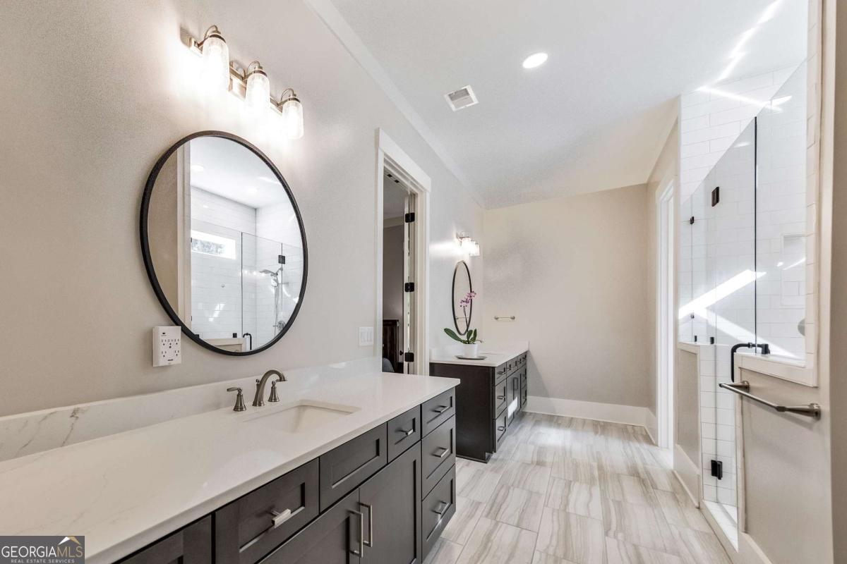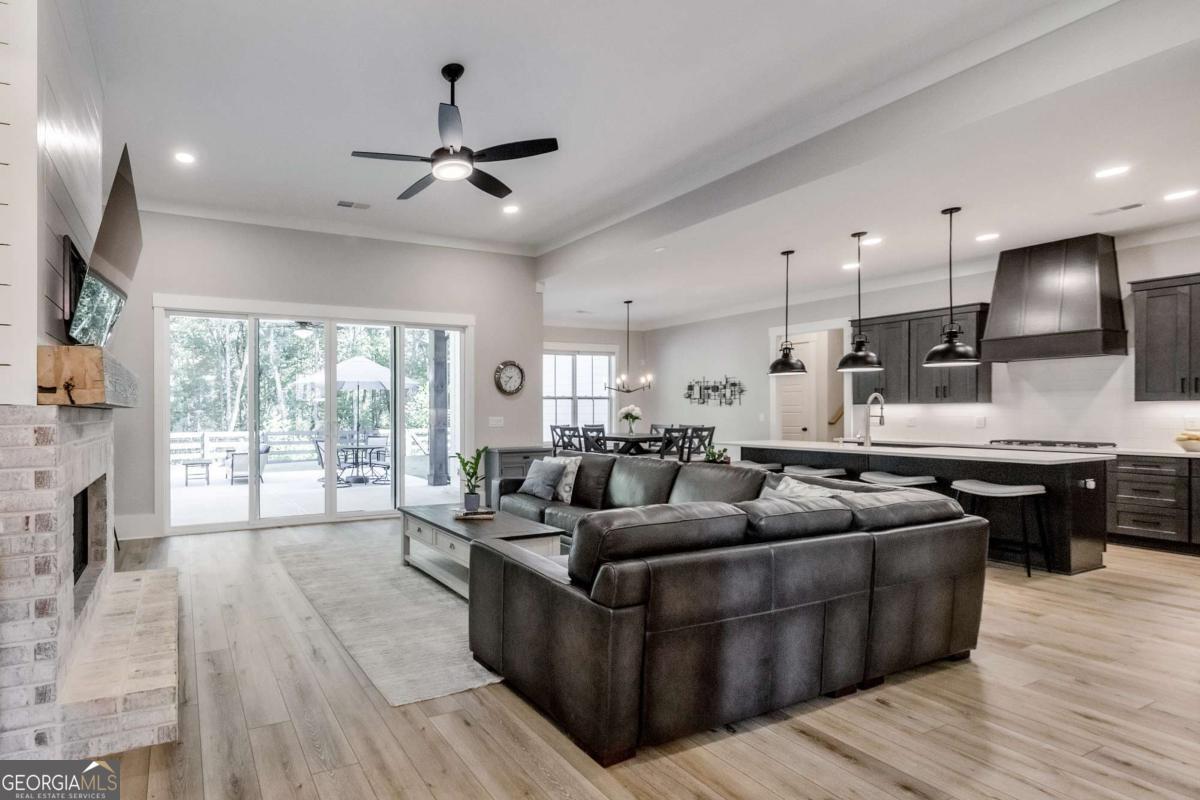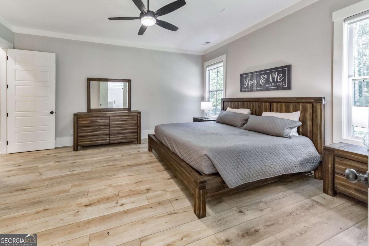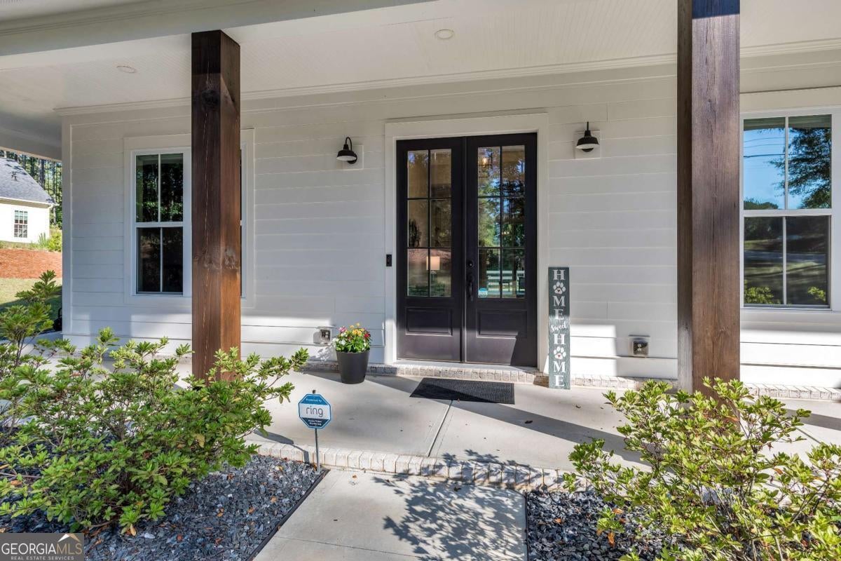 Looking for a home that checks all of your boxes? Look no further! Welcome to this stunning 2023-built modern farmhouse, offering 4 bedrooms and 3 baths on a picturesque 1.5 acre lot in a prime Woodstock location. From the moment you step onto the charming rocking chair front porch, you'll feel right at home. Inside, the open-concept design is filled with natural light, showcasing a bright and airy living space that's perfect for both everyday living and entertaining. The chef's kitchen is a true showpiece with an expansive island, quartz countertops, stainless steel appliances, a farmhouse sink, and a large walk-in pantry. An office sits just off the main living area, providing a quiet space to work from home. The main-level primary suite is a luxurious retreat with a spa-like bath boasting a double shower and dual vanities. The oversized walk-in closet is a dream and connects directly to the laundry room for added convenience. Two additional main-level bedrooms share a beautifully designed hall bath with a double vanity, while a versatile flex room with a dog door to the backyard adds extra function. Upstairs, a private bedroom and full bath create the ideal suite for teens, guests, or extended family. Thoughtful details include 8-foot solid core doors on the main level, soft-close cabinets/drawers throughout, a tankless gas water heater, and a washer and gas dryer included. Outside, the expansive covered back porch and extended patio overlook the level, fenced backyard, providing the perfect backdrop for weekend barbecues, playtime, or simply relaxing while kids and pets enjoy the space. Blending modern luxury with timeless farmhouse charm, this home is designed for comfort, style, and lasting memories. With its incredible features and inviting spaces, it's a place you'll be proud to call home for years to come!