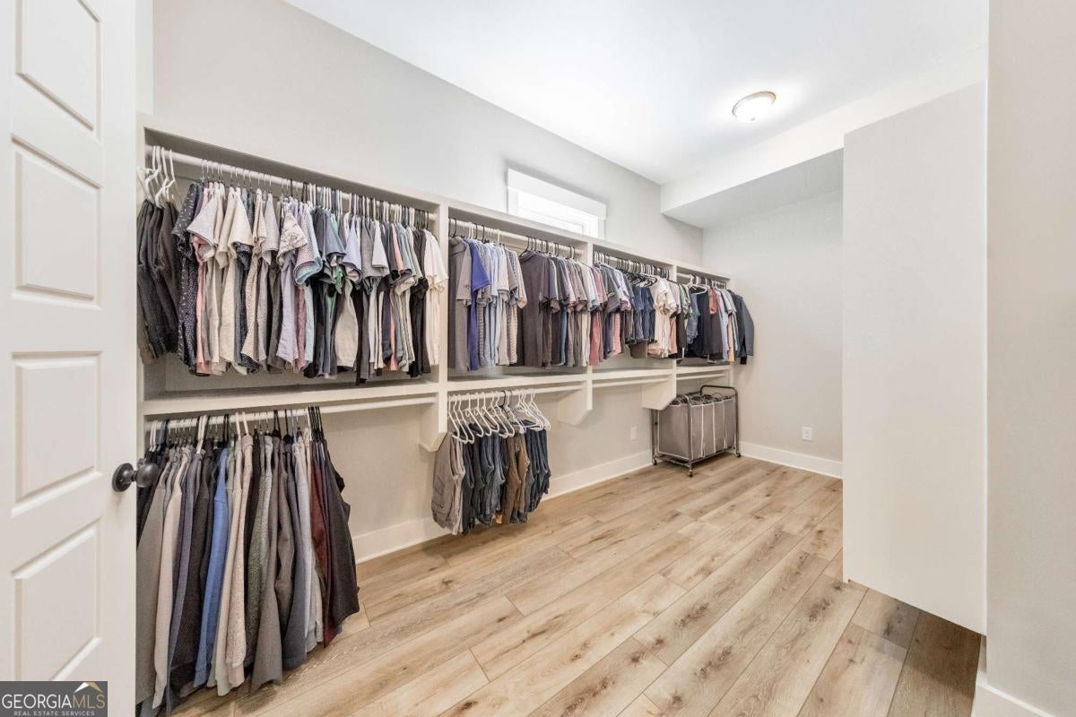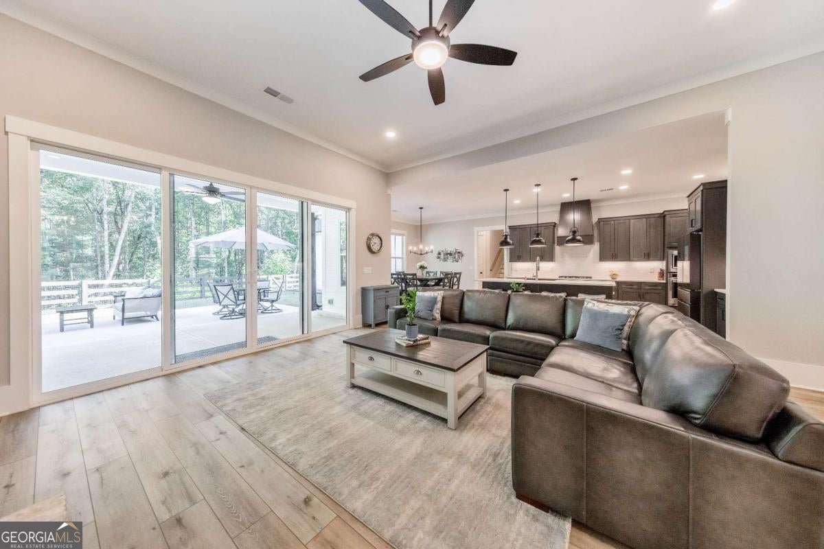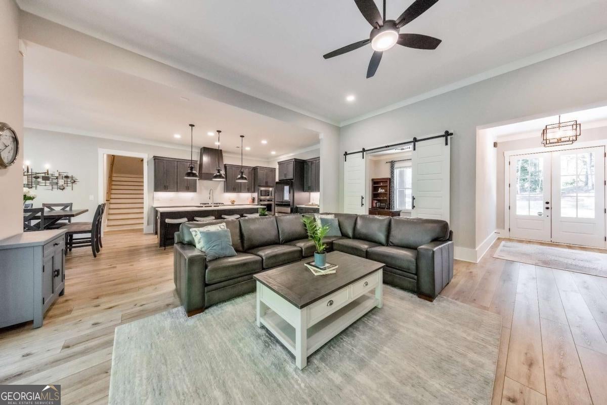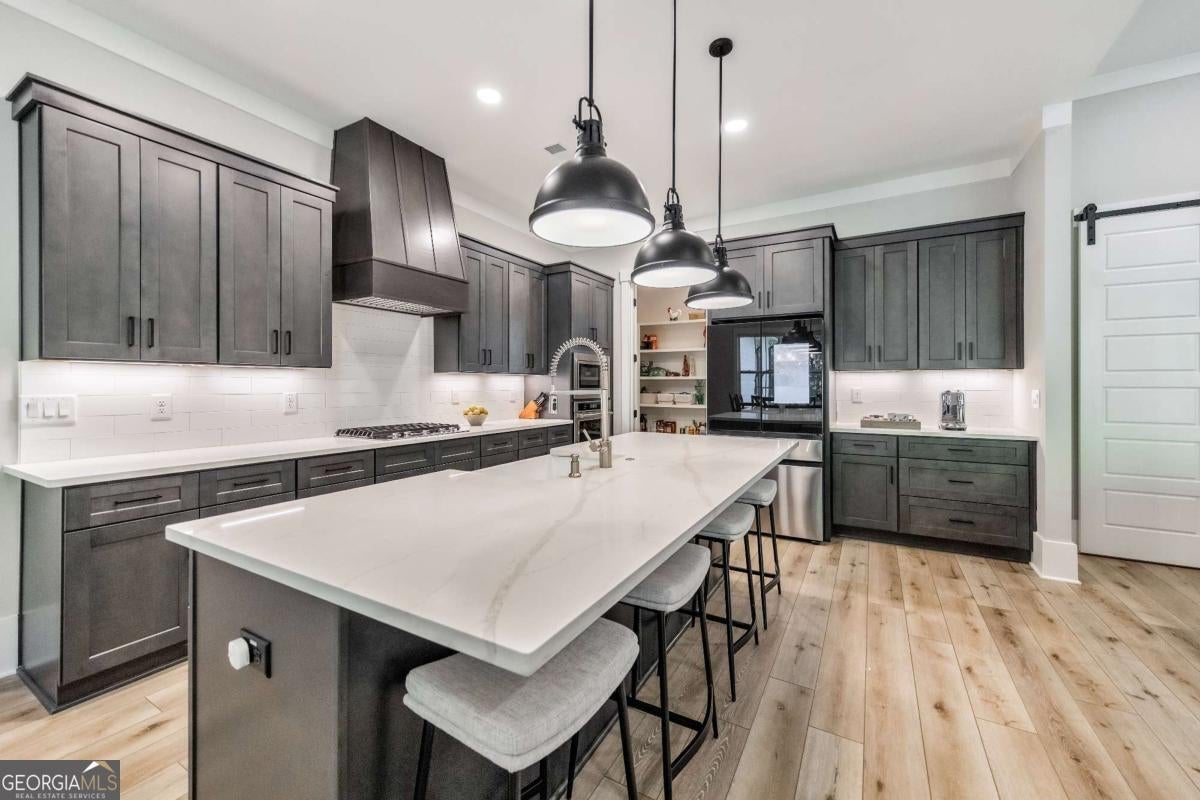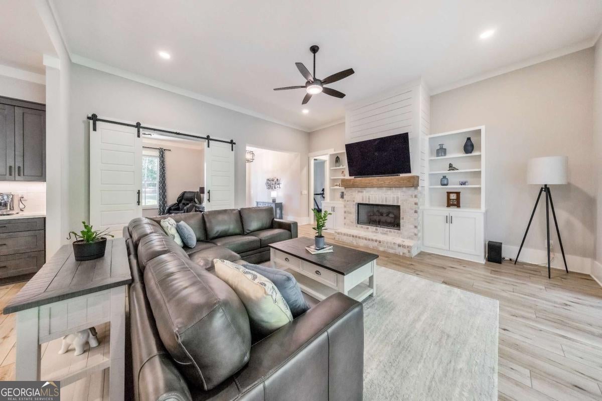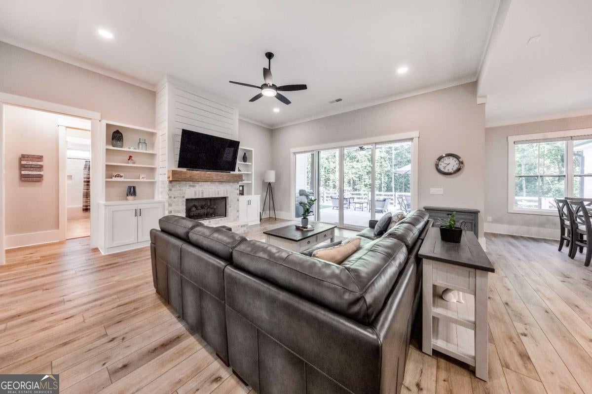 Looking for a home that checks all of your boxes? Look no further! Welcome to this stunning 2023-built modern farmhouse, offering 4 bedrooms and 3 baths on a picturesque 1.5 acre lot in a prime Woodstock location. From the moment you step onto the charming rocking chair front porch, you'll feel right at home. Inside, the open-concept design is filled with natural light, showcasing a bright and airy living space that's perfect for both everyday living and entertaining. The chef's kitchen is a true showpiece with an expansive island, quartz countertops, stainless steel appliances, a farmhouse sink, and a large walk-in pantry. An office sits just off the main living area, providing a quiet space to work from home. The main-level primary suite is a luxurious retreat with a spa-like bath boasting a double shower and dual vanities. The oversized walk-in closet is a dream and connects directly to the laundry room for added convenience. Two additional main-level bedrooms share a beautifully designed hall bath with a double vanity, while a versatile flex room with a dog door to the backyard adds extra function. Upstairs, a private bedroom and full bath create the ideal suite for teens, guests, or extended family. Thoughtful details include 8-foot solid core doors on the main level, soft-close cabinets/drawers throughout, a tankless gas water heater, and a washer and gas dryer included. Outside, the expansive covered back porch and extended patio overlook the level, fenced backyard, providing the perfect backdrop for weekend barbecues, playtime, or simply relaxing while kids and pets enjoy the space. Blending modern luxury with timeless farmhouse charm, this home is designed for comfort, style, and lasting memories. With its incredible features and inviting spaces, it's a place you'll be proud to call home for years to come!