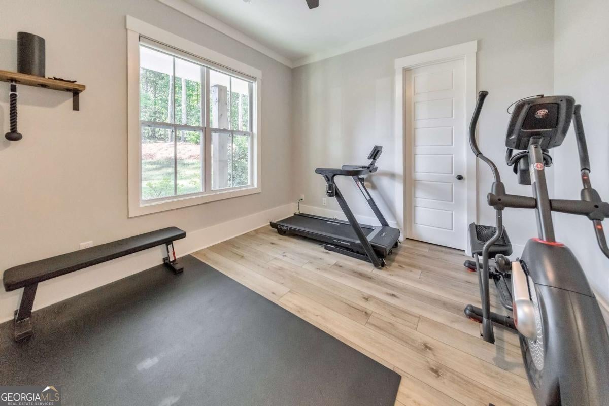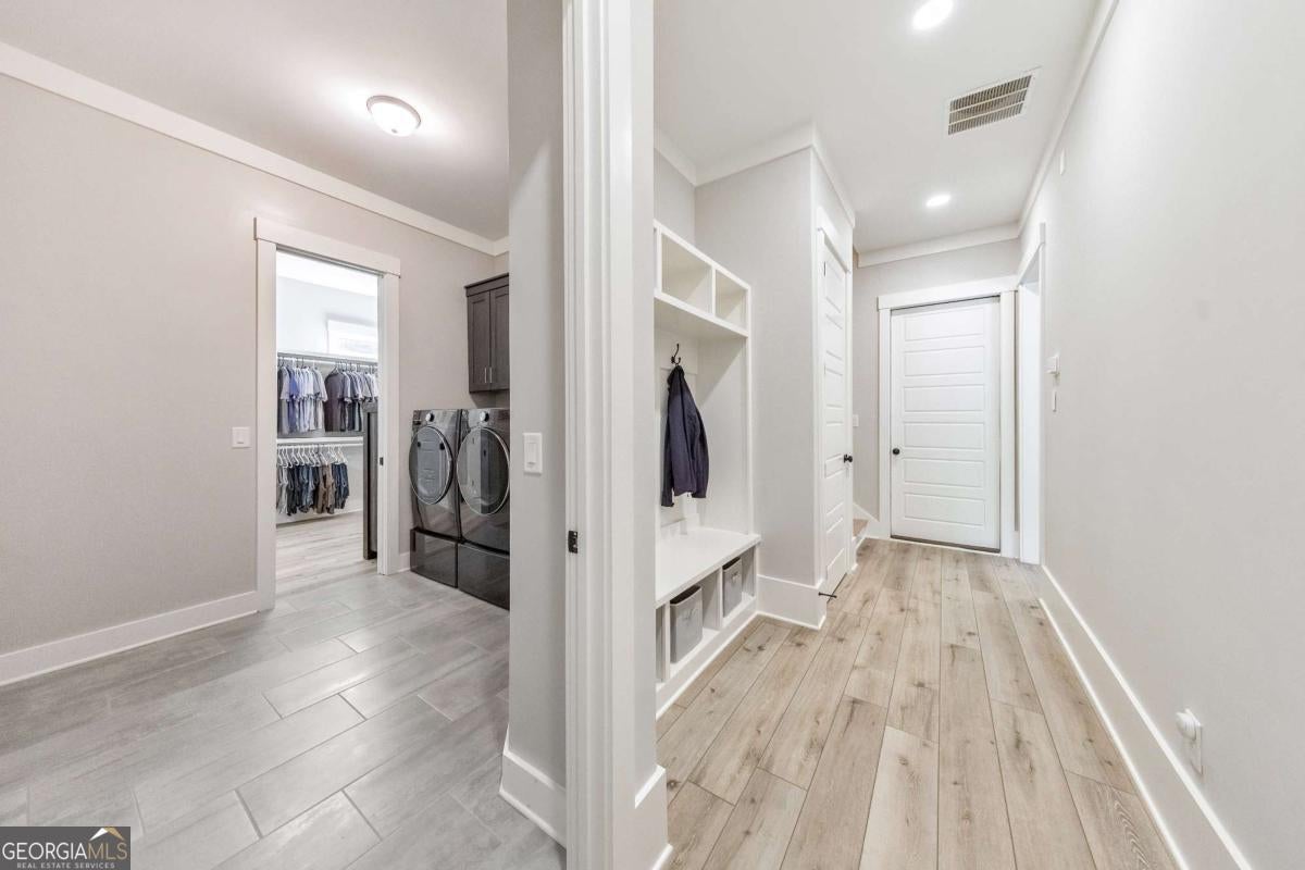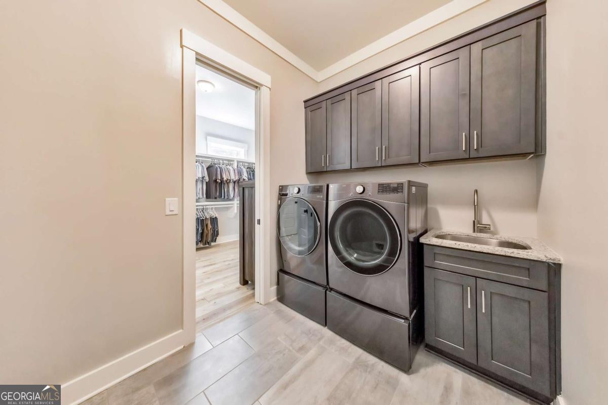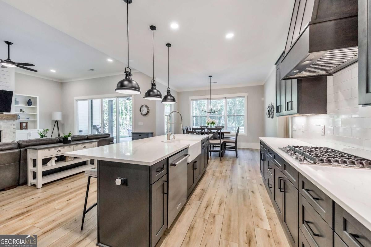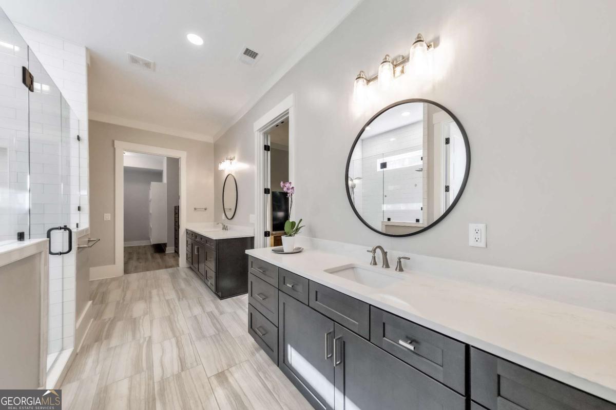 Looking for a home that checks all of your boxes? Look no further! Welcome to this stunning 2023-built modern farmhouse, offering 4 bedrooms and 3 baths on a picturesque 1.5 acre lot in a prime Woodstock location. From the moment you step onto the charming rocking chair front porch, you'll feel right at home. Inside, the open-concept design is filled with natural light, showcasing a bright and airy living space that's perfect for both everyday living and entertaining. The chef's kitchen is a true showpiece with an expansive island, quartz countertops, stainless steel appliances, a farmhouse sink, and a large walk-in pantry. An office sits just off the main living area, providing a quiet space to work from home. The main-level primary suite is a luxurious retreat with a spa-like bath boasting a double shower and dual vanities. The oversized walk-in closet is a dream and connects directly to the laundry room for added convenience. Two additional main-level bedrooms share a beautifully designed hall bath with a double vanity, while a versatile flex room with a dog door to the backyard adds extra function. Upstairs, a private bedroom and full bath create the ideal suite for teens, guests, or extended family. Thoughtful details include 8-foot solid core doors on the main level, soft-close cabinets/drawers throughout, a tankless gas water heater, and a washer and gas dryer included. Outside, the expansive covered back porch and extended patio overlook the level, fenced backyard, providing the perfect backdrop for weekend barbecues, playtime, or simply relaxing while kids and pets enjoy the space. Blending modern luxury with timeless farmhouse charm, this home is designed for comfort, style, and lasting memories. With its incredible features and inviting spaces, it's a place you'll be proud to call home for years to come!