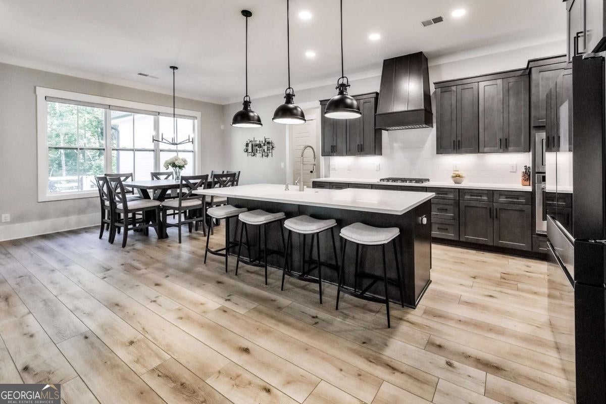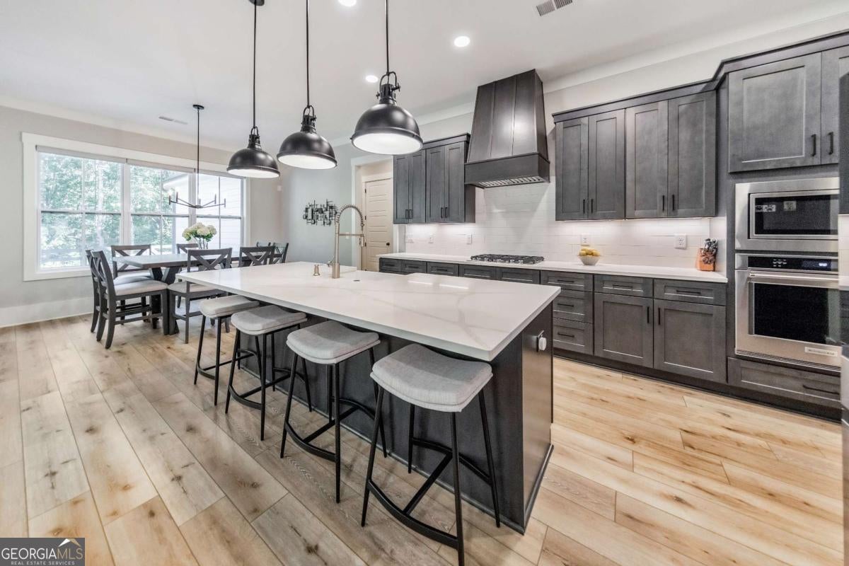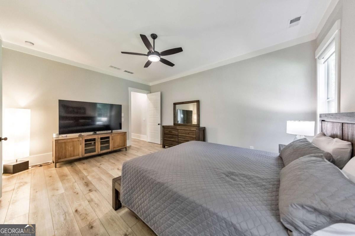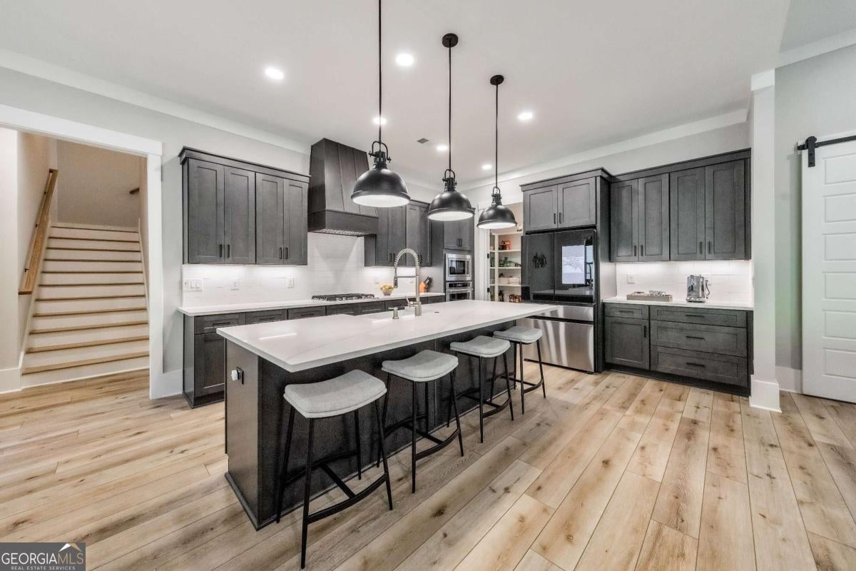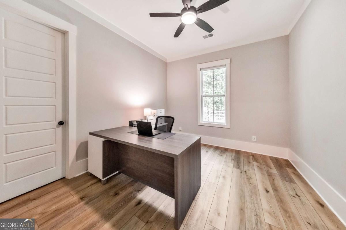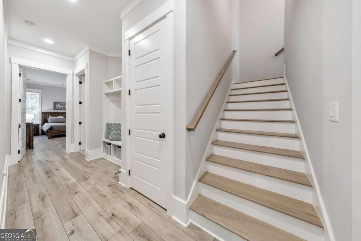 Looking for a home that checks all of your boxes? Look no further! Welcome to this stunning 2023-built modern farmhouse, offering 4 bedrooms and 3 baths on a picturesque 1.5 acre lot in a prime Woodstock location. From the moment you step onto the charming rocking chair front porch, you'll feel right at home. Inside, the open-concept design is filled with natural light, showcasing a bright and airy living space that's perfect for both everyday living and entertaining. The chef's kitchen is a true showpiece with an expansive island, quartz countertops, stainless steel appliances, a farmhouse sink, and a large walk-in pantry. An office sits just off the main living area, providing a quiet space to work from home. The main-level primary suite is a luxurious retreat with a spa-like bath boasting a double shower and dual vanities. The oversized walk-in closet is a dream and connects directly to the laundry room for added convenience. Two additional main-level bedrooms share a beautifully designed hall bath with a double vanity, while a versatile flex room with a dog door to the backyard adds extra function. Upstairs, a private bedroom and full bath create the ideal suite for teens, guests, or extended family. Thoughtful details include 8-foot solid core doors on the main level, soft-close cabinets/drawers throughout, a tankless gas water heater, and a washer and gas dryer included. Outside, the expansive covered back porch and extended patio overlook the level, fenced backyard, providing the perfect backdrop for weekend barbecues, playtime, or simply relaxing while kids and pets enjoy the space. Blending modern luxury with timeless farmhouse charm, this home is designed for comfort, style, and lasting memories. With its incredible features and inviting spaces, it's a place you'll be proud to call home for years to come!
