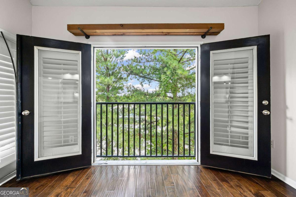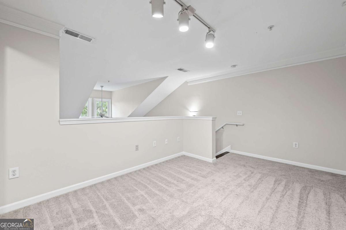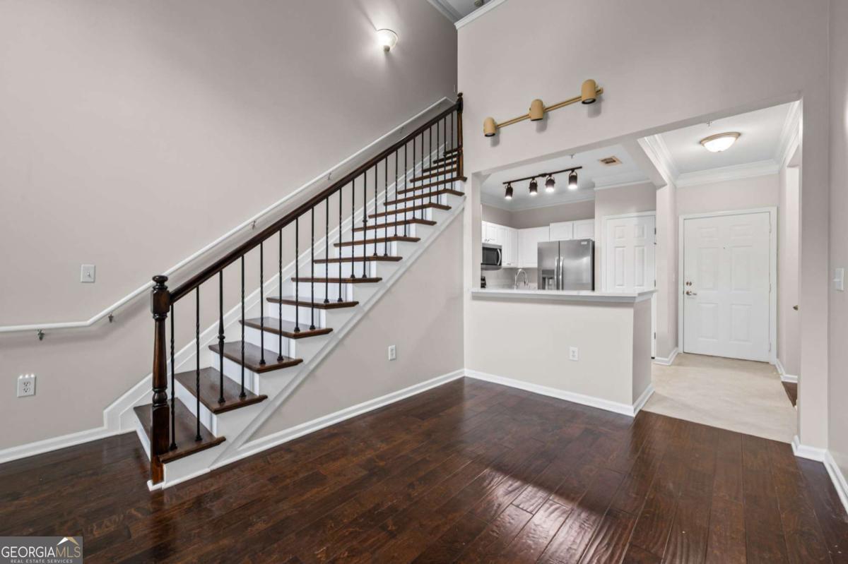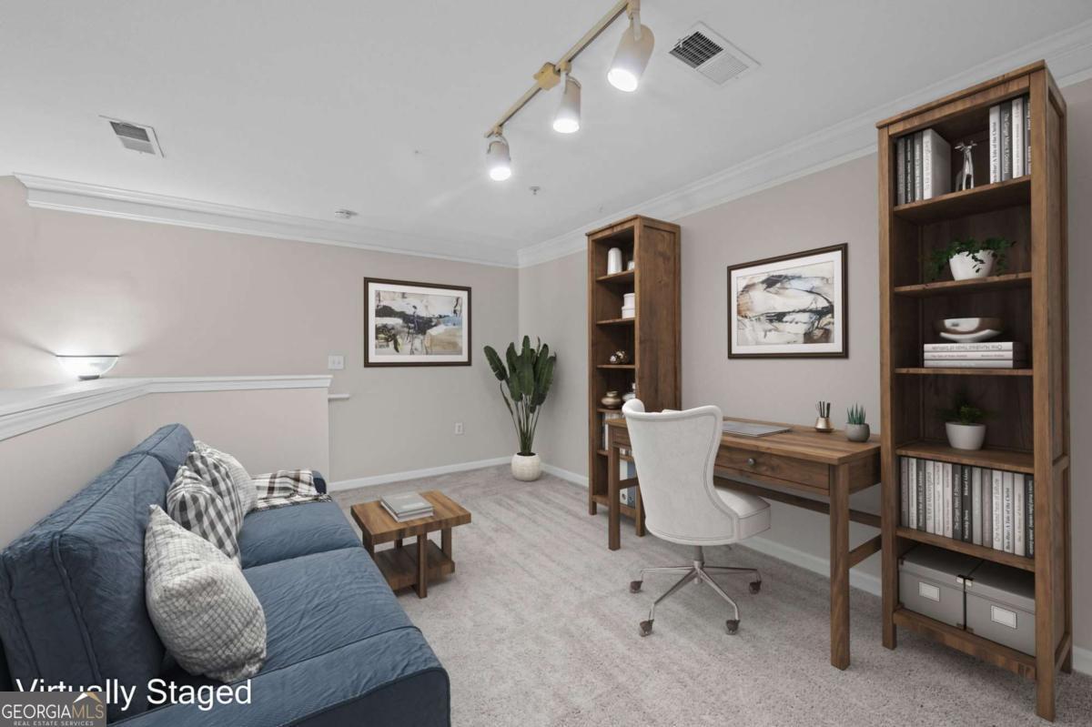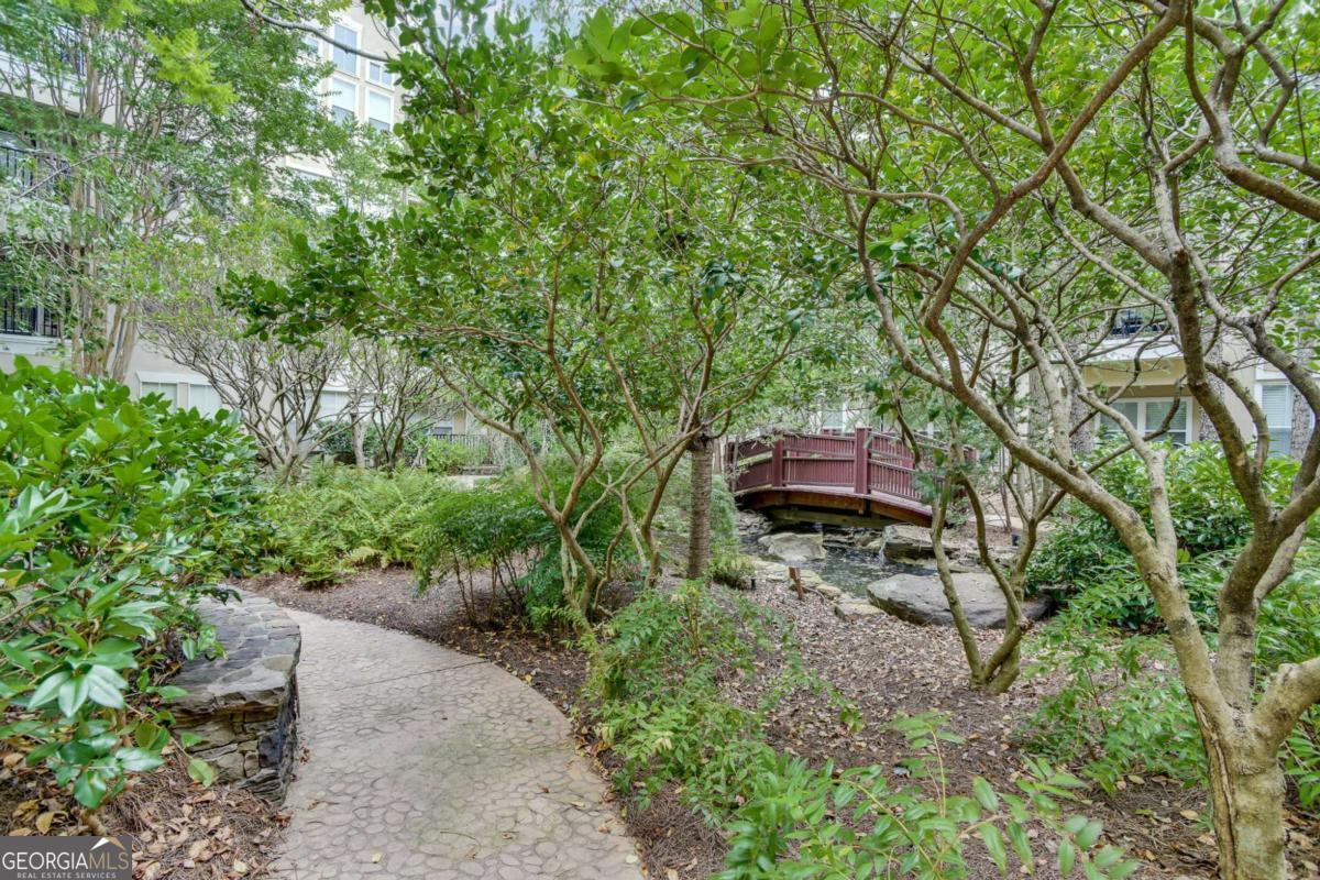 Welcome home to Madison Square in Dunwoody, a resort-style, gated community. This spacious and rare top floor condo has one bedroom with an upstairs loft. Upgrades galore! The kitchen features a new and beautiful quartz countertop with a deep single bowl stainless sink, new SS refrigerator plus SS microwave, range and dishwasher; There are ample white cabinets, tiled flooring as well as a spacious pantry. The open floor plan has the kitchen looking into the two-story vaulted great room with a lot of natural light; An additional balcony off the great room is great for enjoying a cup of coffee in the morning and even has as storage room; Beautiful hardwoods adorn the great room along with plantation shutters, all adding sophistication; The spacious bedroom leads into a spa-like bathroom with a double vanity that has a new quartz countertop, new sinks and fixtures along with a tub/shower combination; The bathroom leads to a spacious walk in closet; The laundry room is tucked away in the hallway and includes a washer and dryer; The classy wood stairs with beautiful iron balusters lead you to a second story loft or flex room with new carpet; This can be a great office and large enough to use as a a guest room as well. The loft also has another huge walk in closet. Neutral paint throughout and an HVAC unit that is only 2 years old. Each of the four buildings in this community have a different resort-style amenity; The zero entry beach style pool and spa has areas for grilling and dining; There is a relaxing zen garden in another building designed with waterfalls, walkways and seating areas; A lap pool which stays a little quieter than beach pool is designed specifically for swimming laps; The Sculpture garden is a lush space with unique sculptures, walkways, benches and quiet spaces. The clubhouse is a private area that is available for private events and has social events for the community; There is a large fitness room in the same building as the condo; A deeded an secure covered parking space is on the same level as the condo so there is no need for steps or elevator. Minutes to the Perimeter area with plenty of shopping, restaurants and entertainment. Close to Brook Run park where there are community activities such as farmer's market and a huge dog park; This community has a rare on-site office that is available Monday through Friday. This condo is a blend of city living with the charm and luxury of a resort.