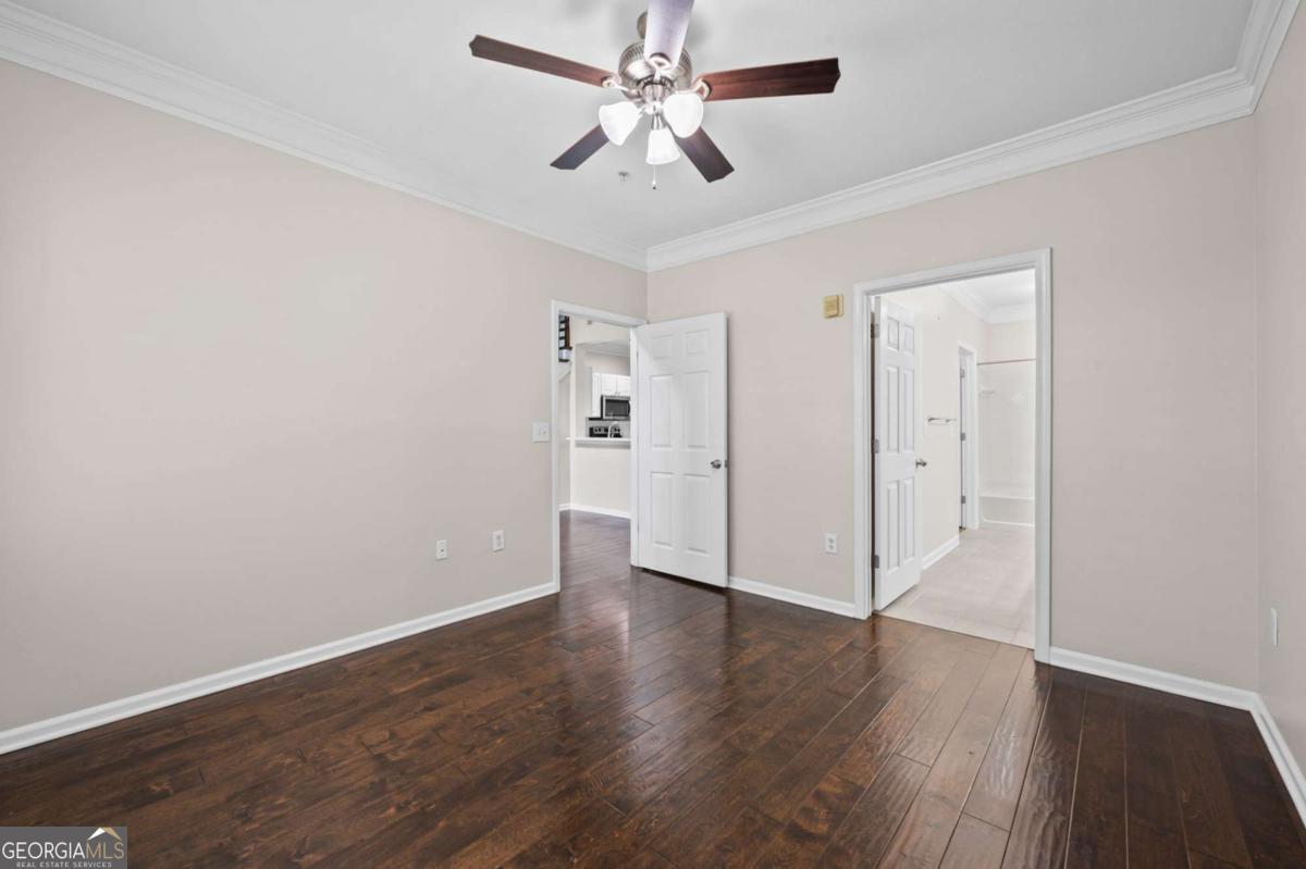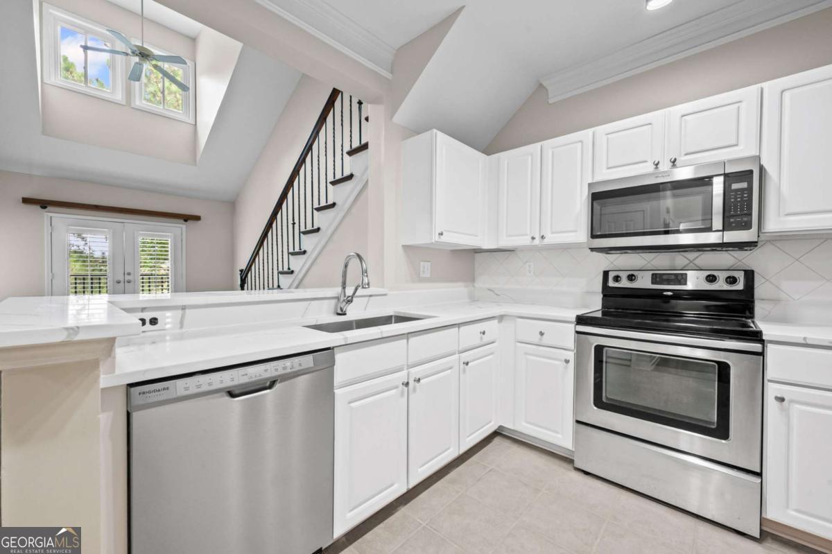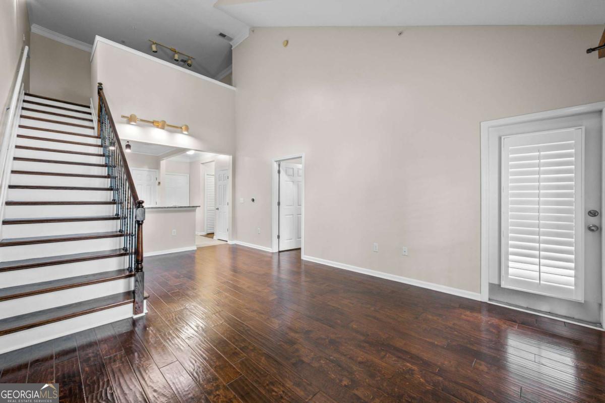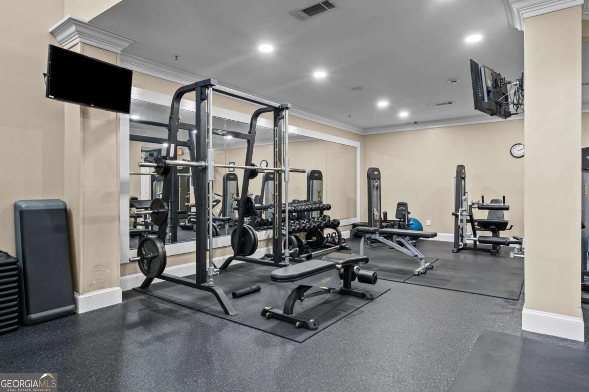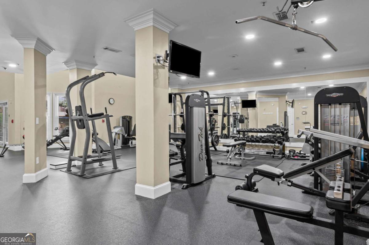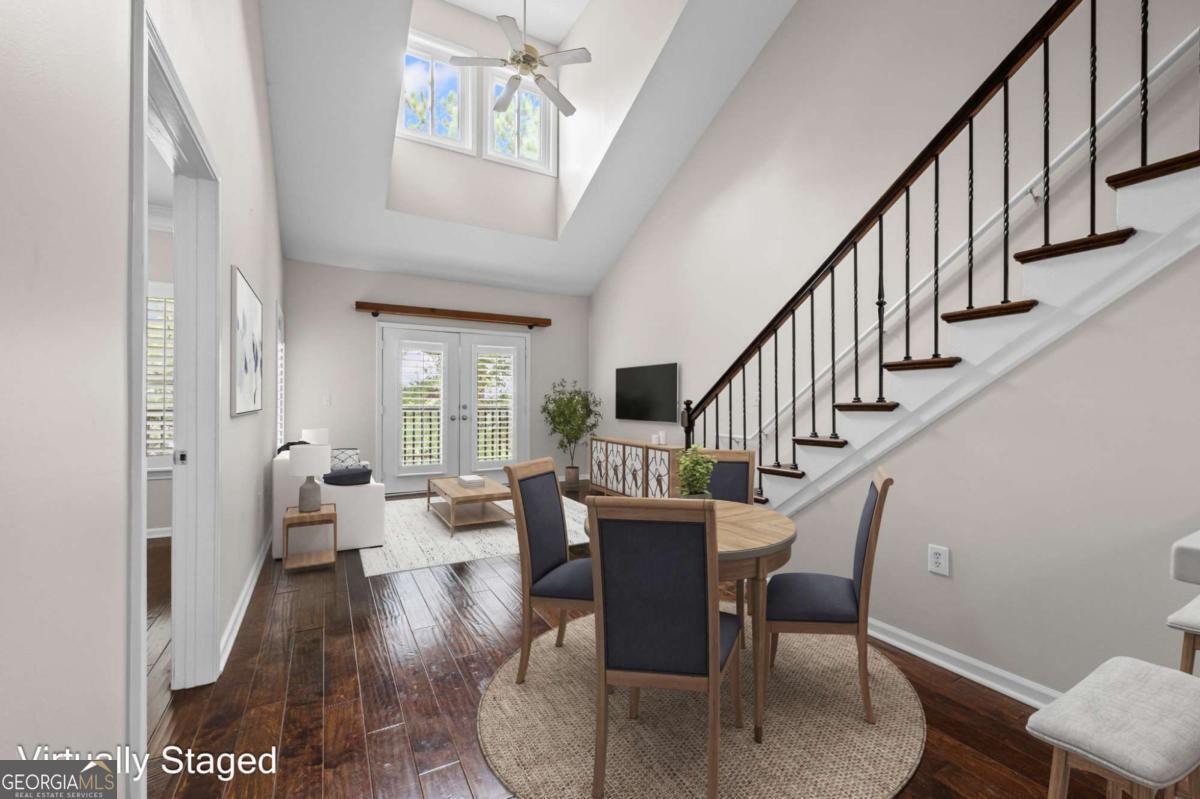 Welcome home to Madison Square in Dunwoody, a resort-style, gated community. This spacious and rare top floor condo has one bedroom with an upstairs loft. Upgrades galore! The kitchen features a new and beautiful quartz countertop with a deep single bowl stainless sink, new SS refrigerator plus SS microwave, range and dishwasher; There are ample white cabinets, tiled flooring as well as a spacious pantry. The open floor plan has the kitchen looking into the two-story vaulted great room with a lot of natural light; An additional balcony off the great room is great for enjoying a cup of coffee in the morning and even has as storage room; Beautiful hardwoods adorn the great room along with plantation shutters, all adding sophistication; The spacious bedroom leads into a spa-like bathroom with a double vanity that has a new quartz countertop, new sinks and fixtures along with a tub/shower combination; The bathroom leads to a spacious walk in closet; The laundry room is tucked away in the hallway and includes a washer and dryer; The classy wood stairs with beautiful iron balusters lead you to a second story loft or flex room with new carpet; This can be a great office and large enough to use as a a guest room as well. The loft also has another huge walk in closet. Neutral paint throughout and an HVAC unit that is only 2 years old. Each of the four buildings in this community have a different resort-style amenity; The zero entry beach style pool and spa has areas for grilling and dining; There is a relaxing zen garden in another building designed with waterfalls, walkways and seating areas; A lap pool which stays a little quieter than beach pool is designed specifically for swimming laps; The Sculpture garden is a lush space with unique sculptures, walkways, benches and quiet spaces. The clubhouse is a private area that is available for private events and has social events for the community; There is a large fitness room in the same building as the condo; A deeded an secure covered parking space is on the same level as the condo so there is no need for steps or elevator. Minutes to the Perimeter area with plenty of shopping, restaurants and entertainment. Close to Brook Run park where there are community activities such as farmer's market and a huge dog park; This community has a rare on-site office that is available Monday through Friday. This condo is a blend of city living with the charm and luxury of a resort.