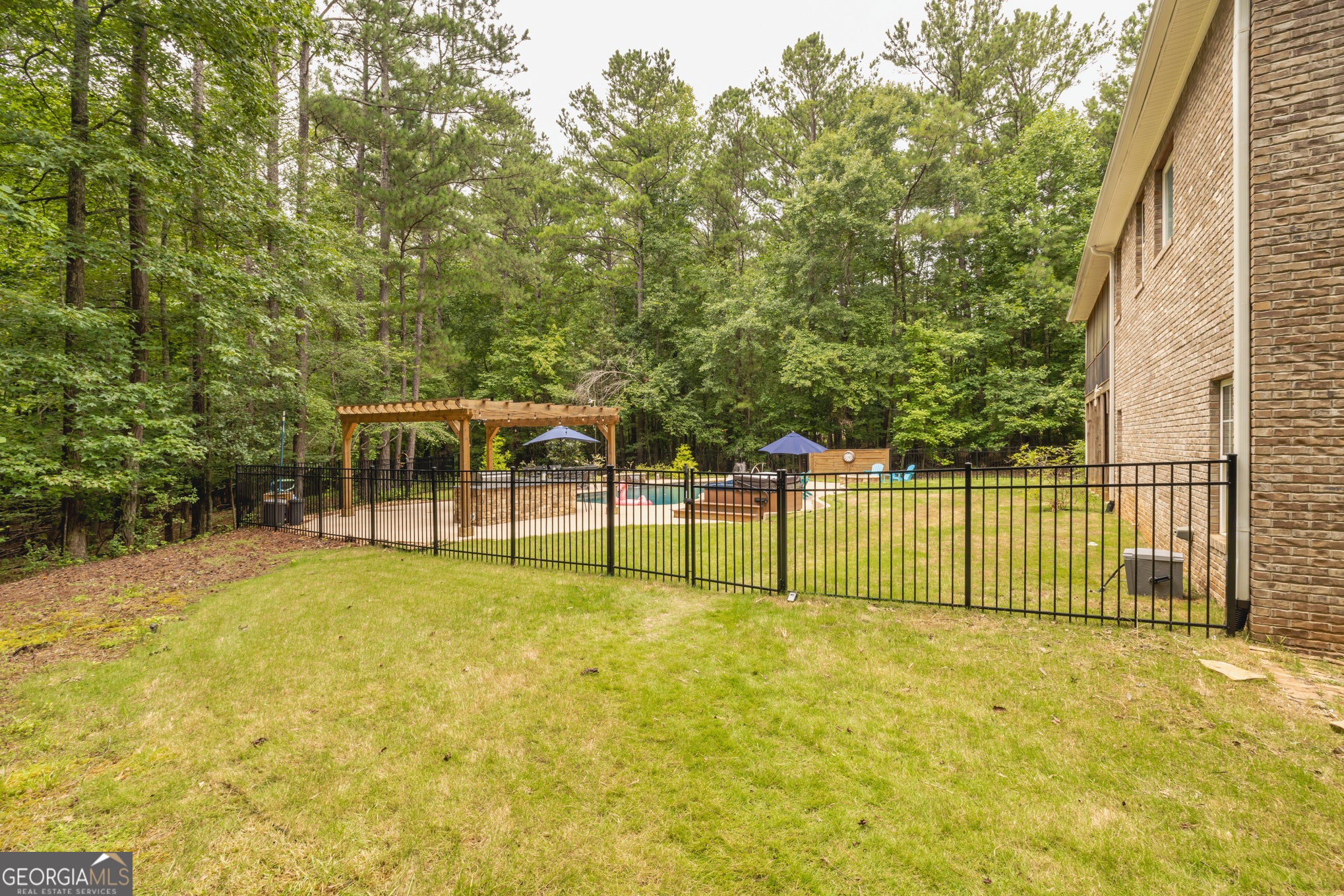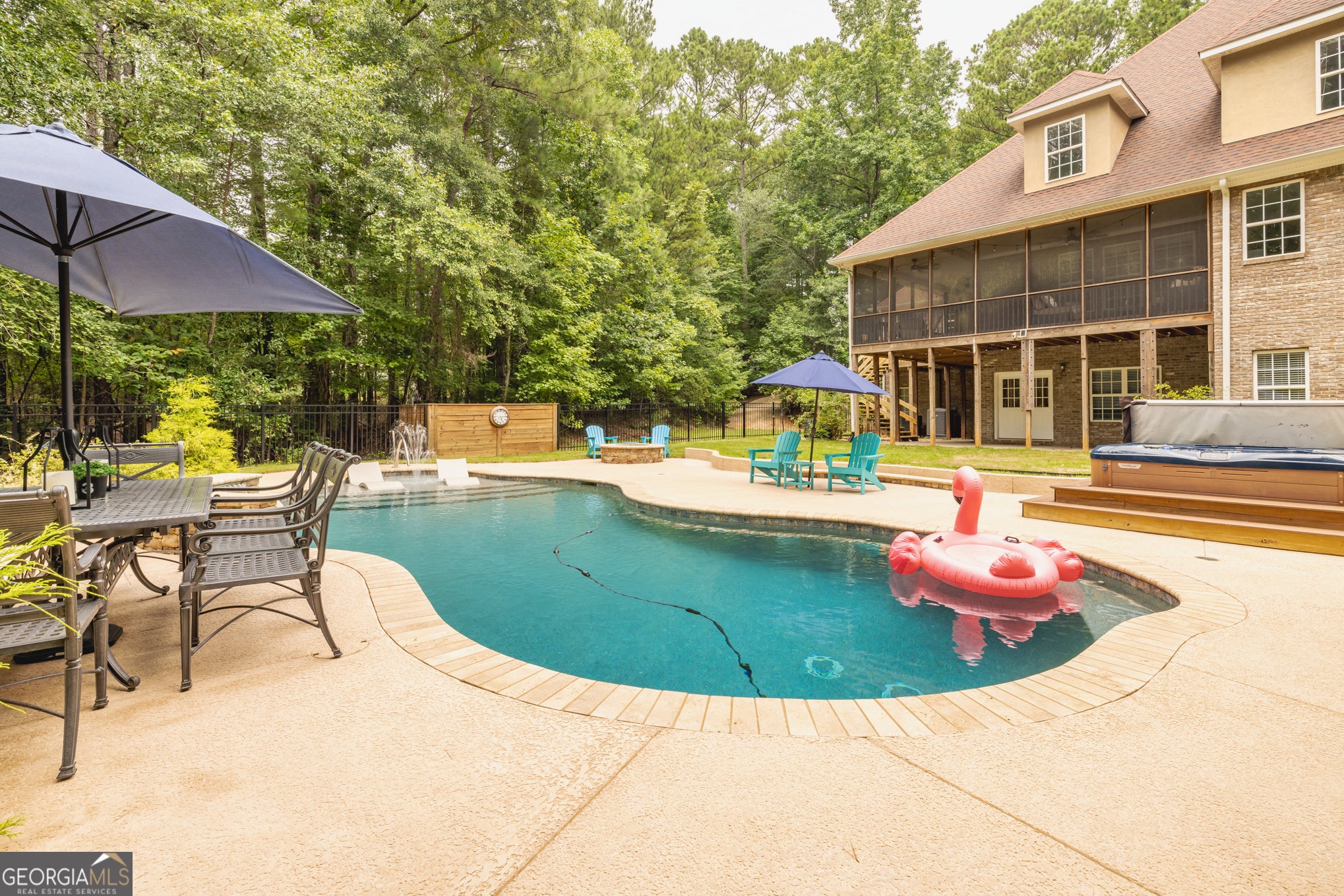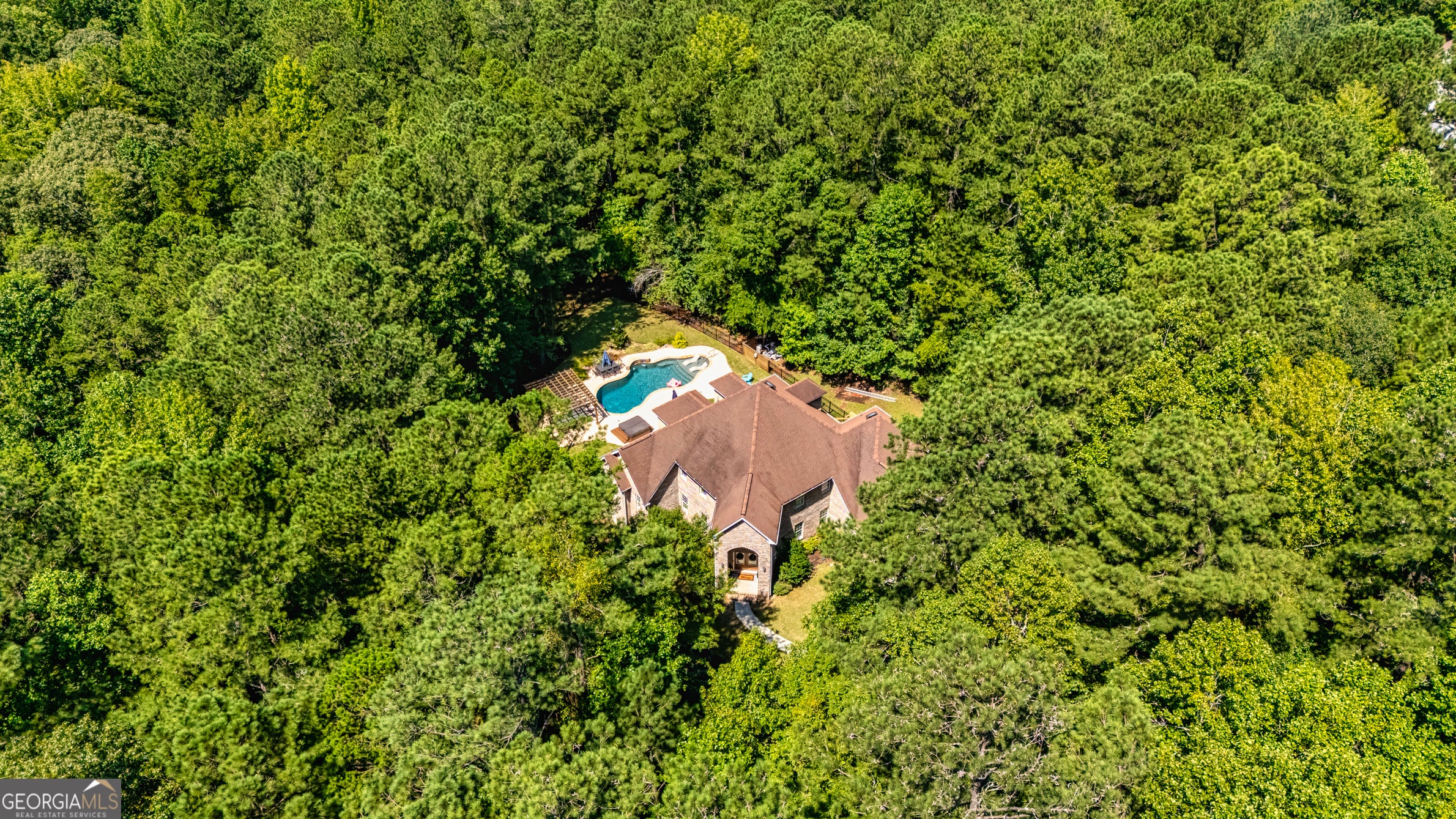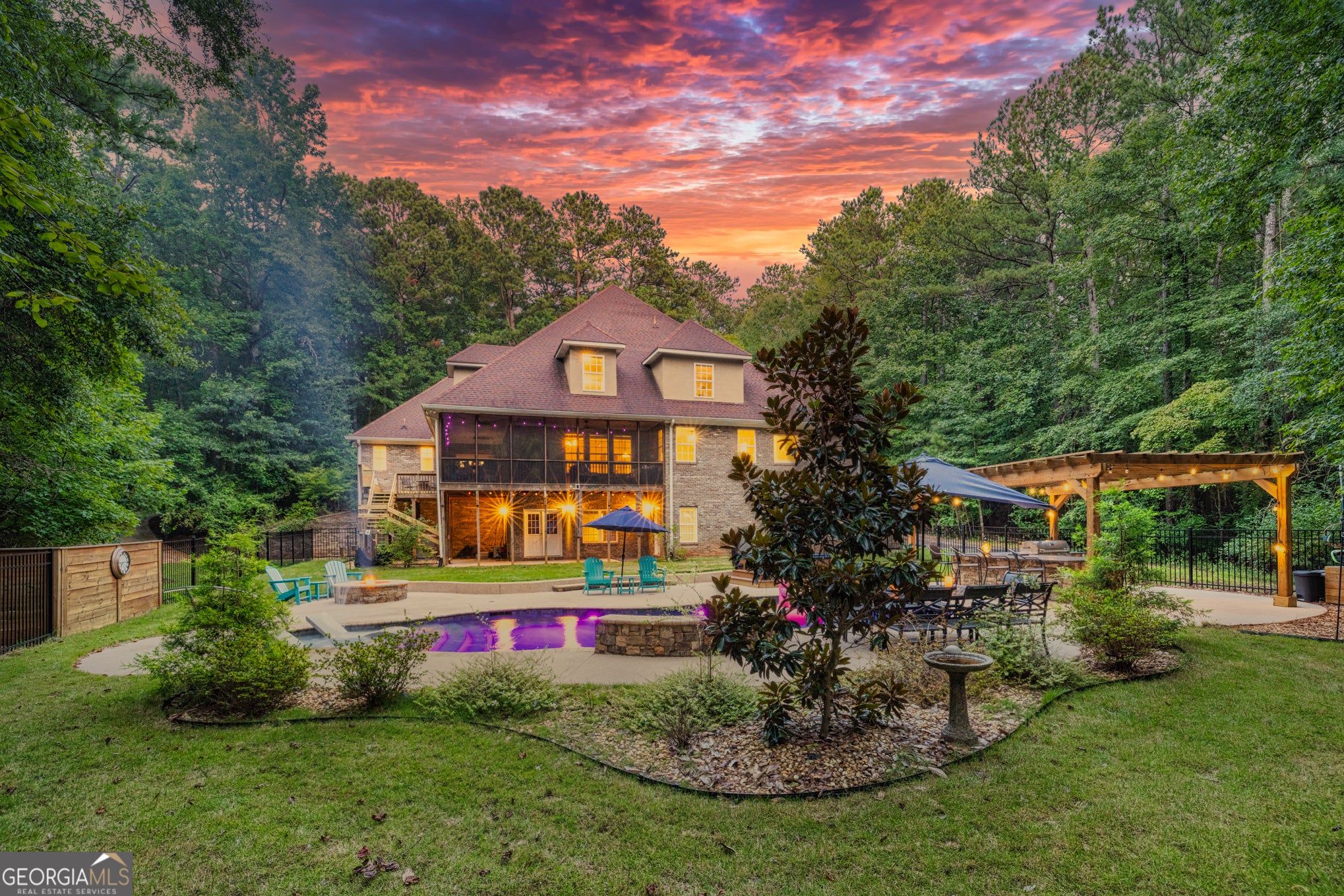 Your Private North Coweta Oasis - Custom Luxury Styled for Outdoor Entertaining Year Round. Welcome to a one-of-a-kind retreat in the sought-after Northgate High School district - a 4 bedroom, 4.5 bath home set on a private, wooded 5-acre tract. From the moment you turn onto the winding drive, you'll know this is something special. Designed from the ground up - architectural plans convey - this low maintenance, four-side brick home offers a lifestyle that's as functional as it is unforgettable. Your front door opens to a soaring Foyer bisecting the formal Living Room and Dining Room, and then flowing into a large Family Room centered on a fireplace. The Kitchen features custom oak cabinets with under-cabinet lighting and stone countertops. The Breakfast Room and Family Room offer access to the screen porch and a grilling deck near the Kitchen. The Primary Suite is on the main level, featuring a spa-style bath with dual vanities, a jetted tub, and a separate shower. Upstairs, you'll find three more Bedrooms plus a huge Bonus Room - perfect for work, play, or guests. Step outside and discover a backyard oasis designed by J&M Pools - a heated and cooled PebbleTech saltwater pool with waterfall, sun shelf with bubblers and loungers, and dazzling LED lighting. The KoolDeck concrete patio, fire pit, and Bullfrog hot tub make entertaining effortless, while the Outdoor Kitchen shaded by an arbor sets the scene for memorable gatherings. Enjoy a screen porch for relaxing mornings, a grilling deck for summer feasts, and the convenience of a new terrace-level Full Bath adjacent to the pool. Three garages on the kitchen level plus a boat garage/shop on the terrace level (with concrete drive access) ensure space for every hobby. Spray foam insulation and newer HVAC units offer energy efficiency. All this is just minutes from Interstate 85 and the 300-acre BT Brown Reservoir, offering fishing and kayaking among quiet natural beauty. With thoughtful design at every turn, this is the home you've been waiting for - a truly custom home where every day feels like a getaway. Schedule your tour and experience the lifestyle for yourself.