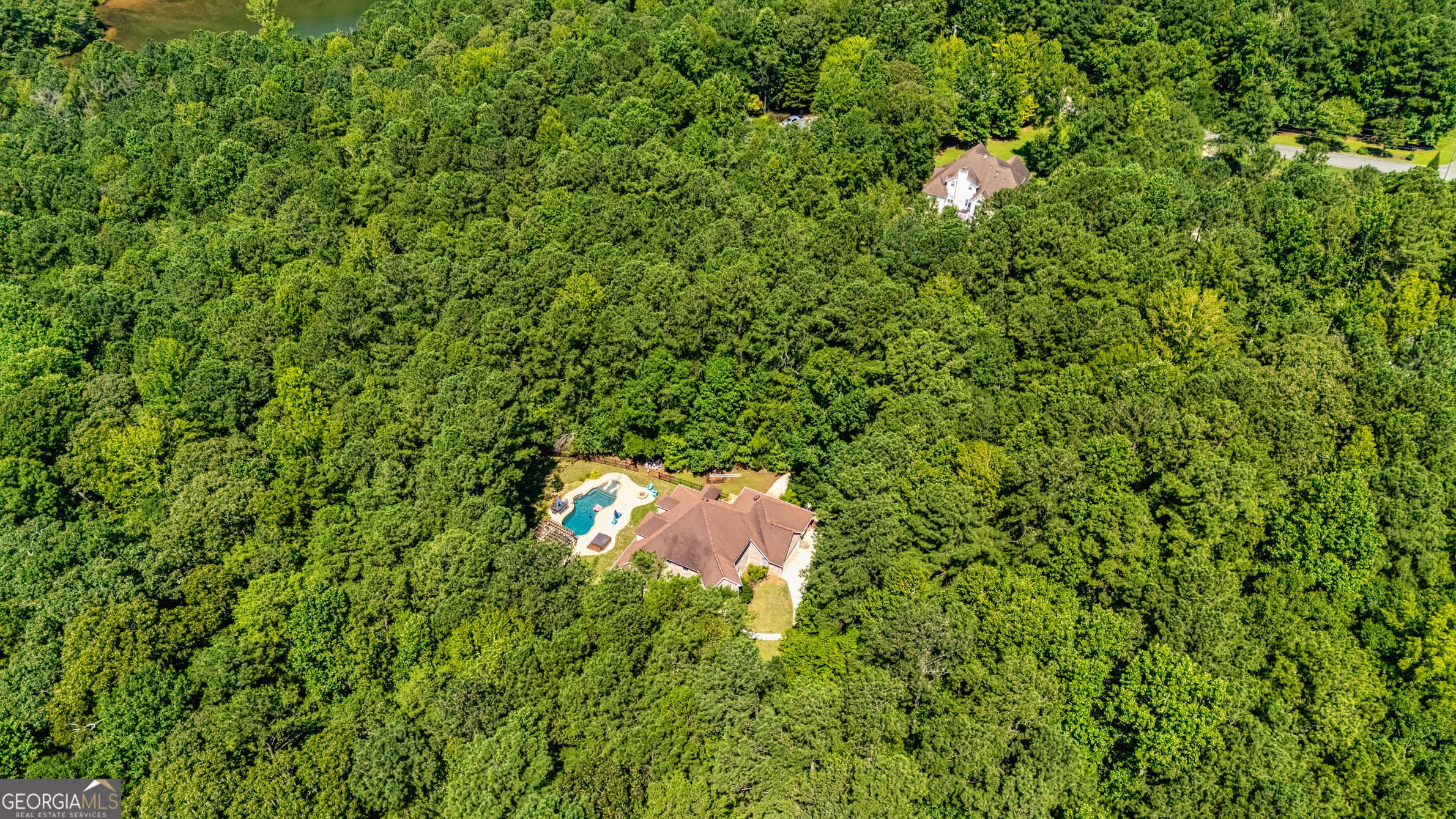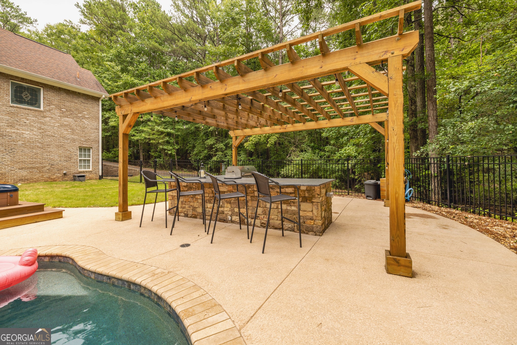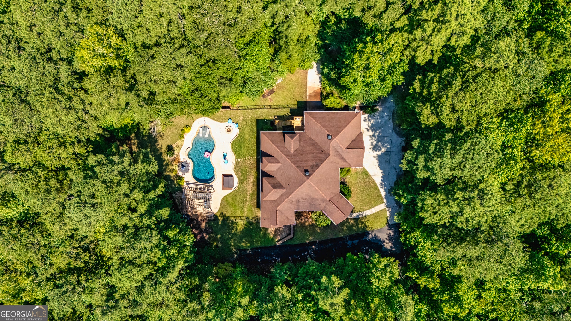 Your Private North Coweta Oasis - Custom Luxury Styled for Outdoor Entertaining Year Round. Welcome to a one-of-a-kind retreat in the sought-after Northgate High School district - a 4 bedroom, 4.5 bath home set on a private, wooded 5-acre tract. From the moment you turn onto the winding drive, you'll know this is something special. Designed from the ground up - architectural plans convey - this low maintenance, four-side brick home offers a lifestyle that's as functional as it is unforgettable. Your front door opens to a soaring Foyer bisecting the formal Living Room and Dining Room, and then flowing into a large Family Room centered on a fireplace. The Kitchen features custom oak cabinets with under-cabinet lighting and stone countertops. The Breakfast Room and Family Room offer access to the screen porch and a grilling deck near the Kitchen. The Primary Suite is on the main level, featuring a spa-style bath with dual vanities, a jetted tub, and a separate shower. Upstairs, you'll find three more Bedrooms plus a huge Bonus Room - perfect for work, play, or guests. Step outside and discover a backyard oasis designed by J&M Pools - a heated and cooled PebbleTech saltwater pool with waterfall, sun shelf with bubblers and loungers, and dazzling LED lighting. The KoolDeck concrete patio, fire pit, and Bullfrog hot tub make entertaining effortless, while the Outdoor Kitchen shaded by an arbor sets the scene for memorable gatherings. Enjoy a screen porch for relaxing mornings, a grilling deck for summer feasts, and the convenience of a new terrace-level Full Bath adjacent to the pool. Three garages on the kitchen level plus a boat garage/shop on the terrace level (with concrete drive access) ensure space for every hobby. Spray foam insulation and newer HVAC units offer energy efficiency. All this is just minutes from Interstate 85 and the 300-acre BT Brown Reservoir, offering fishing and kayaking among quiet natural beauty. With thoughtful design at every turn, this is the home you've been waiting for - a truly custom home where every day feels like a getaway. Schedule your tour and experience the lifestyle for yourself.