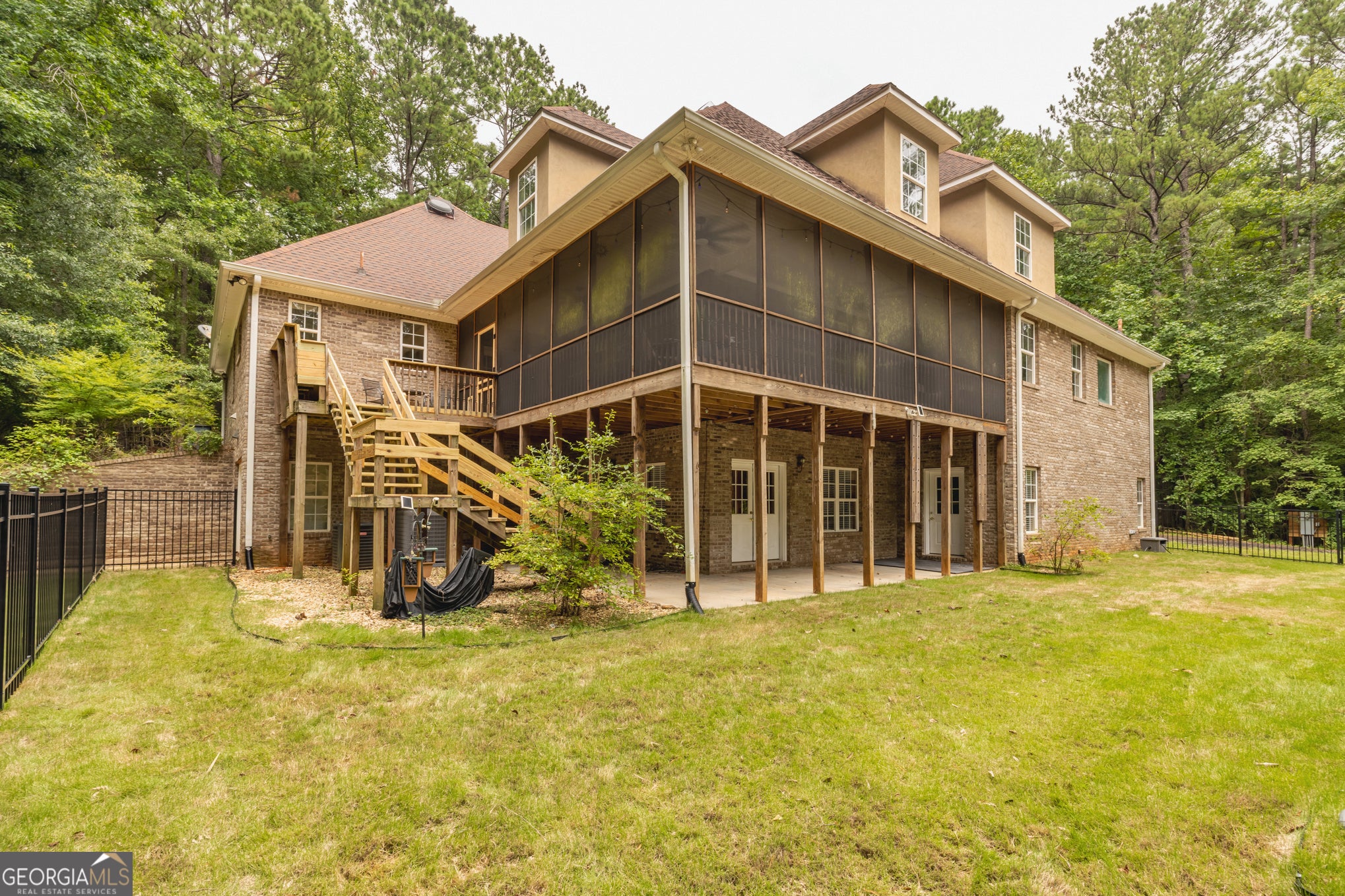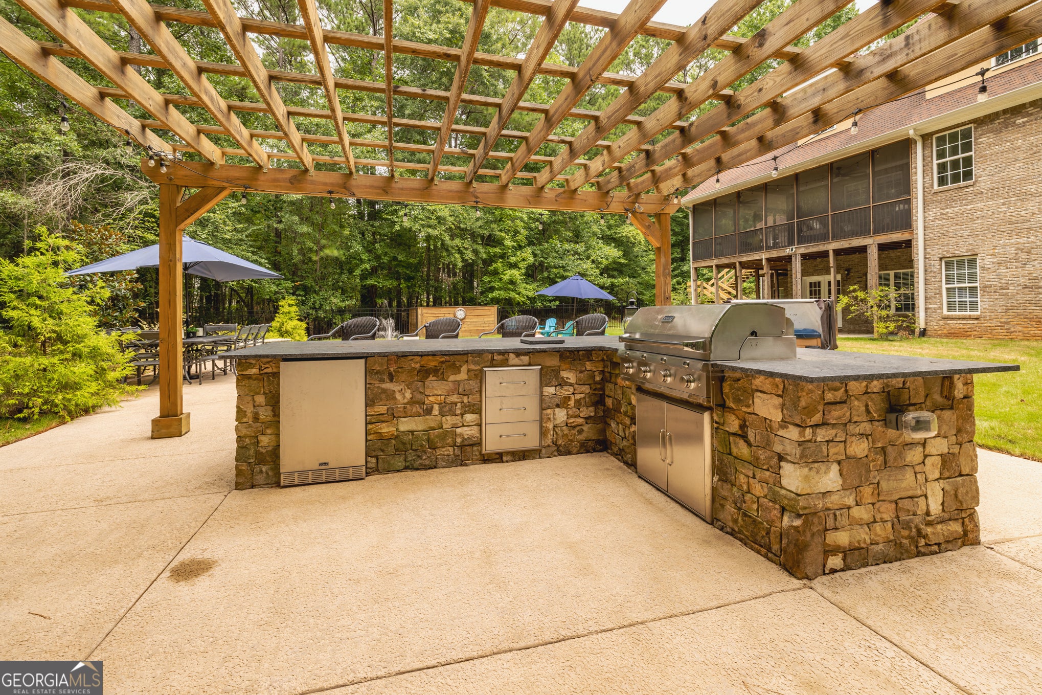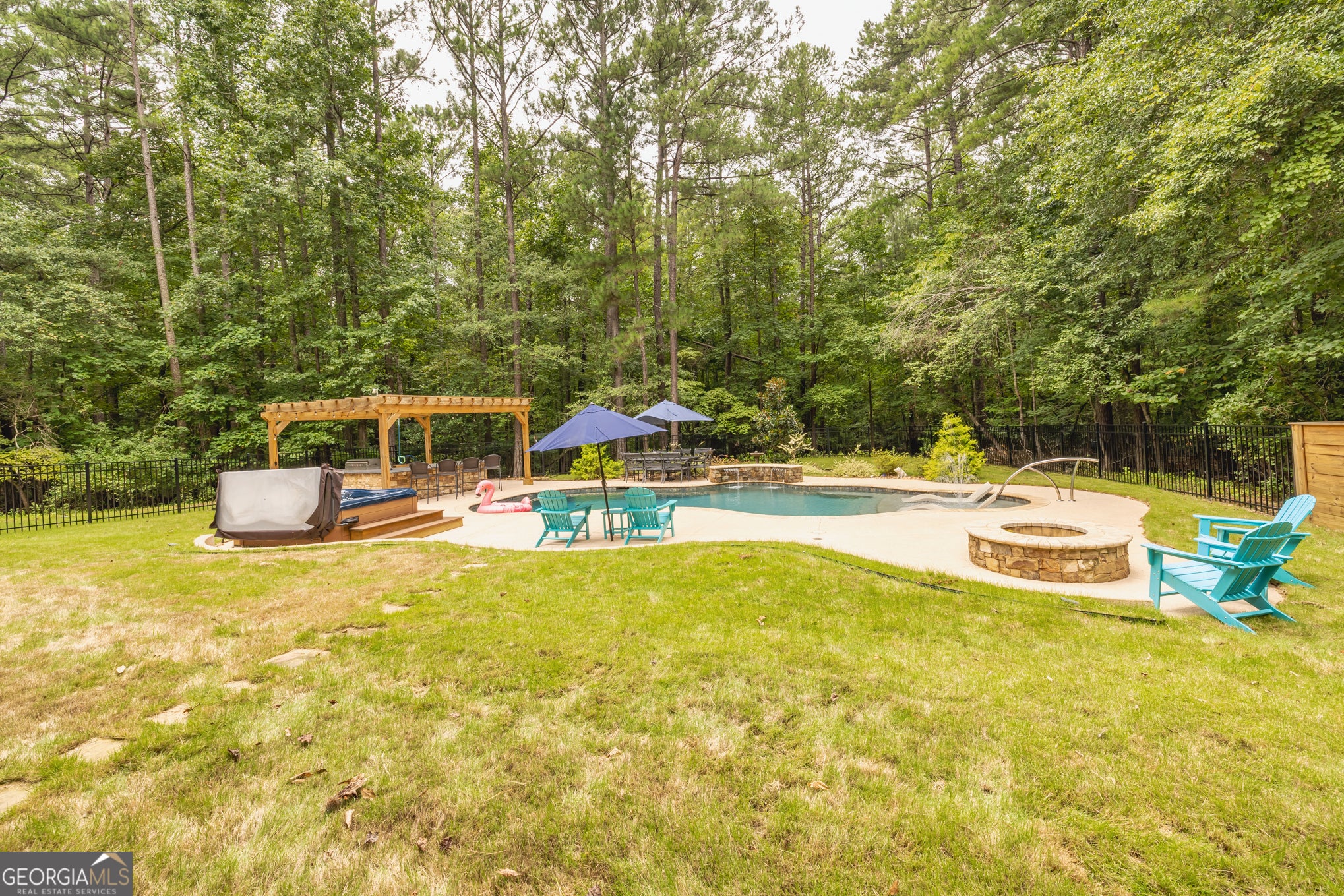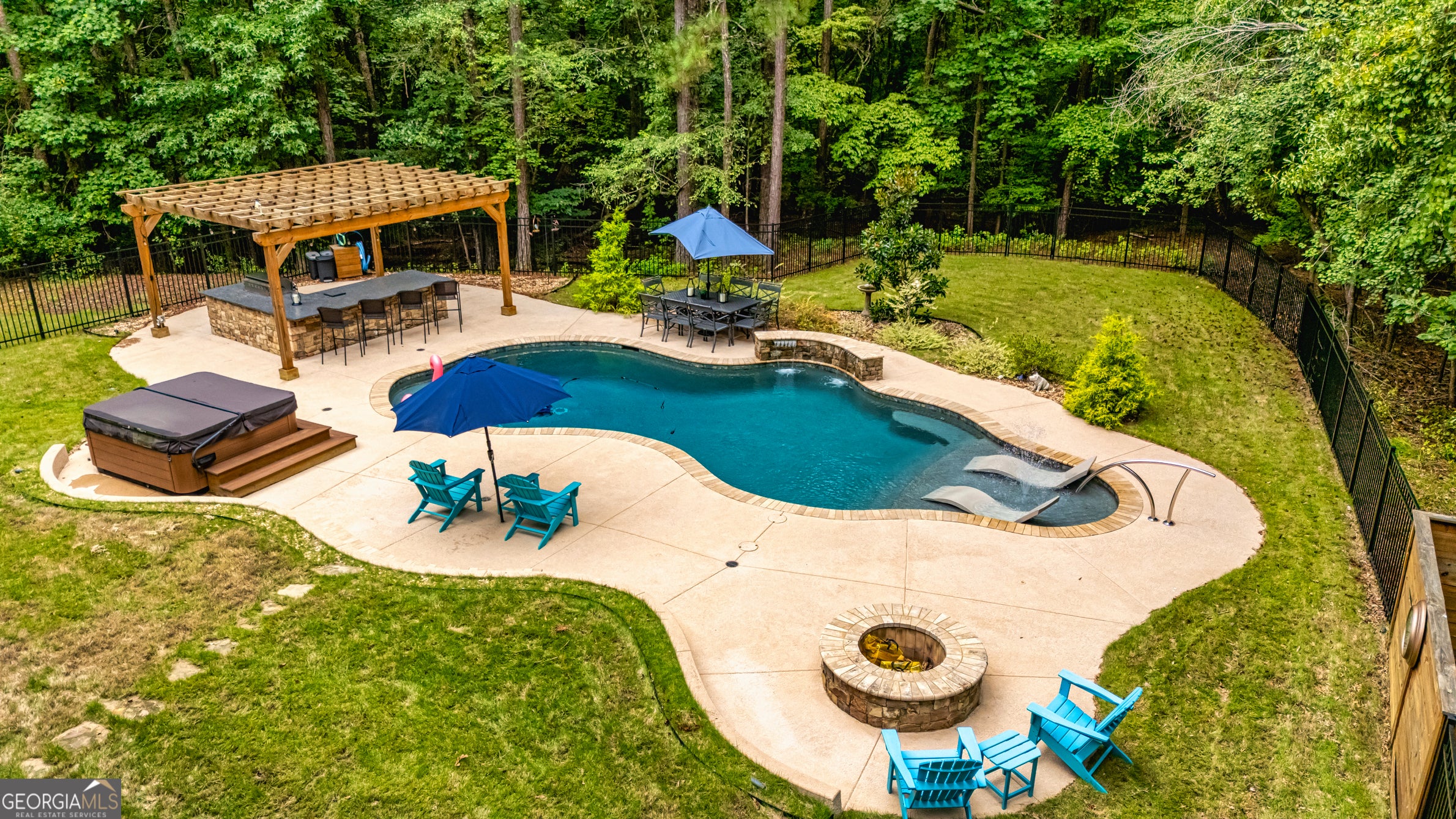 Your Private North Coweta Oasis - Custom Luxury Styled for Outdoor Entertaining Year Round. Welcome to a one-of-a-kind retreat in the sought-after Northgate High School district - a 4 bedroom, 4.5 bath home set on a private, wooded 5-acre tract. From the moment you turn onto the winding drive, you'll know this is something special. Designed from the ground up - architectural plans convey - this low maintenance, four-side brick home offers a lifestyle that's as functional as it is unforgettable. Your front door opens to a soaring Foyer bisecting the formal Living Room and Dining Room, and then flowing into a large Family Room centered on a fireplace. The Kitchen features custom oak cabinets with under-cabinet lighting and stone countertops. The Breakfast Room and Family Room offer access to the screen porch and a grilling deck near the Kitchen. The Primary Suite is on the main level, featuring a spa-style bath with dual vanities, a jetted tub, and a separate shower. Upstairs, you'll find three more Bedrooms plus a huge Bonus Room - perfect for work, play, or guests. Step outside and discover a backyard oasis designed by J&M Pools - a heated and cooled PebbleTech saltwater pool with waterfall, sun shelf with bubblers and loungers, and dazzling LED lighting. The KoolDeck concrete patio, fire pit, and Bullfrog hot tub make entertaining effortless, while the Outdoor Kitchen shaded by an arbor sets the scene for memorable gatherings. Enjoy a screen porch for relaxing mornings, a grilling deck for summer feasts, and the convenience of a new terrace-level Full Bath adjacent to the pool. Three garages on the kitchen level plus a boat garage/shop on the terrace level (with concrete drive access) ensure space for every hobby. Spray foam insulation and newer HVAC units offer energy efficiency. All this is just minutes from Interstate 85 and the 300-acre BT Brown Reservoir, offering fishing and kayaking among quiet natural beauty. With thoughtful design at every turn, this is the home you've been waiting for - a truly custom home where every day feels like a getaway. Schedule your tour and experience the lifestyle for yourself.