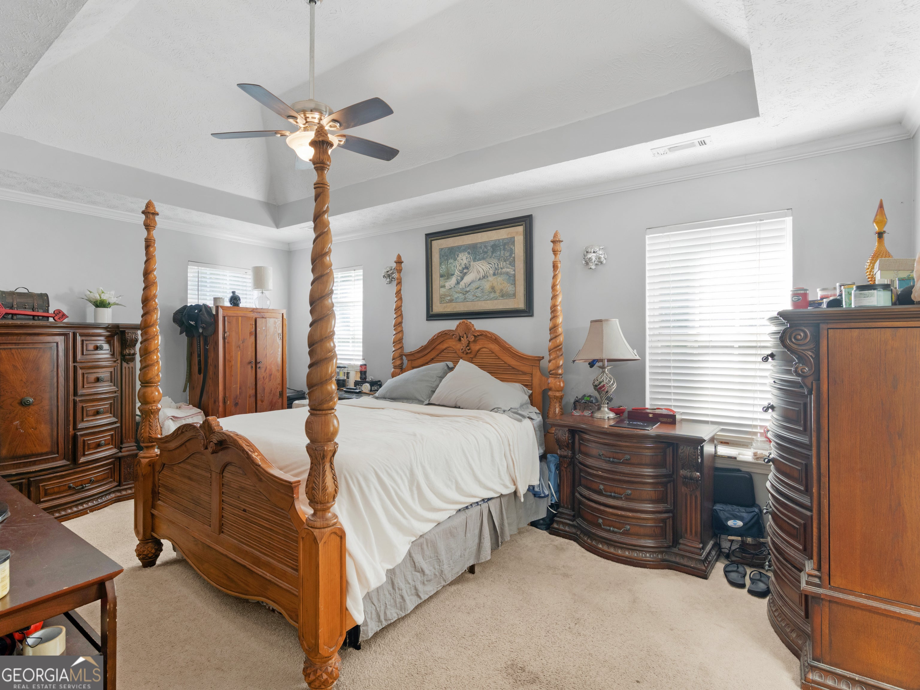 Tucked away on a spacious cul-de-sac lot, this charming 2-story home offers the perfect blend of comfort and modern living. With 4 bedrooms and 3 full baths, there's plenty of room for everyone to enjoy. Step inside the welcoming foyer, where you'll find a formal dining room, flex room, living room, and a full bath all on the main level. The kitchen features stainless steel appliances, granite countertops, a breakfast bar, and a cozy breakfast area-perfect for casual meals and entertaining. Upstairs, you'll discover four generously sized bedrooms and two full bathrooms. The primary suite is a peaceful retreat with tray ceilings, a large walk-in closet, dual vanities, a relaxing garden tub, and a separate shower. A centrally located laundry room adds convenience to the upper level. Outside, enjoy a large level lot with a 2-car garage and a storage shed for all your extra needs. Nestled in a well-established neighborhood with walking trails and offers unbeatable convenience-just minutes from I-75, shopping, dining, and top-rated schools. Whether you're hosting friends, spending time with family, or simply relaxing in your own private space, this home truly has it all. If you've been searching for the perfect place with room to grow and make your own-look no further!
