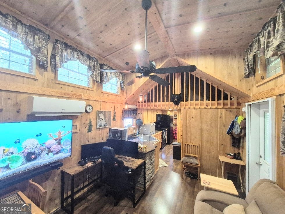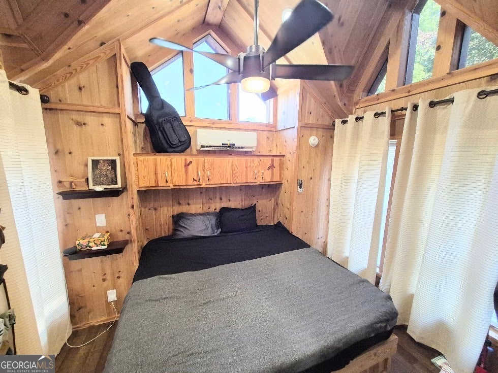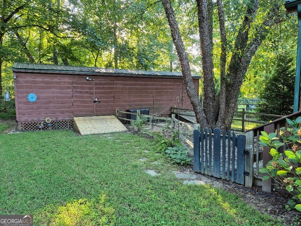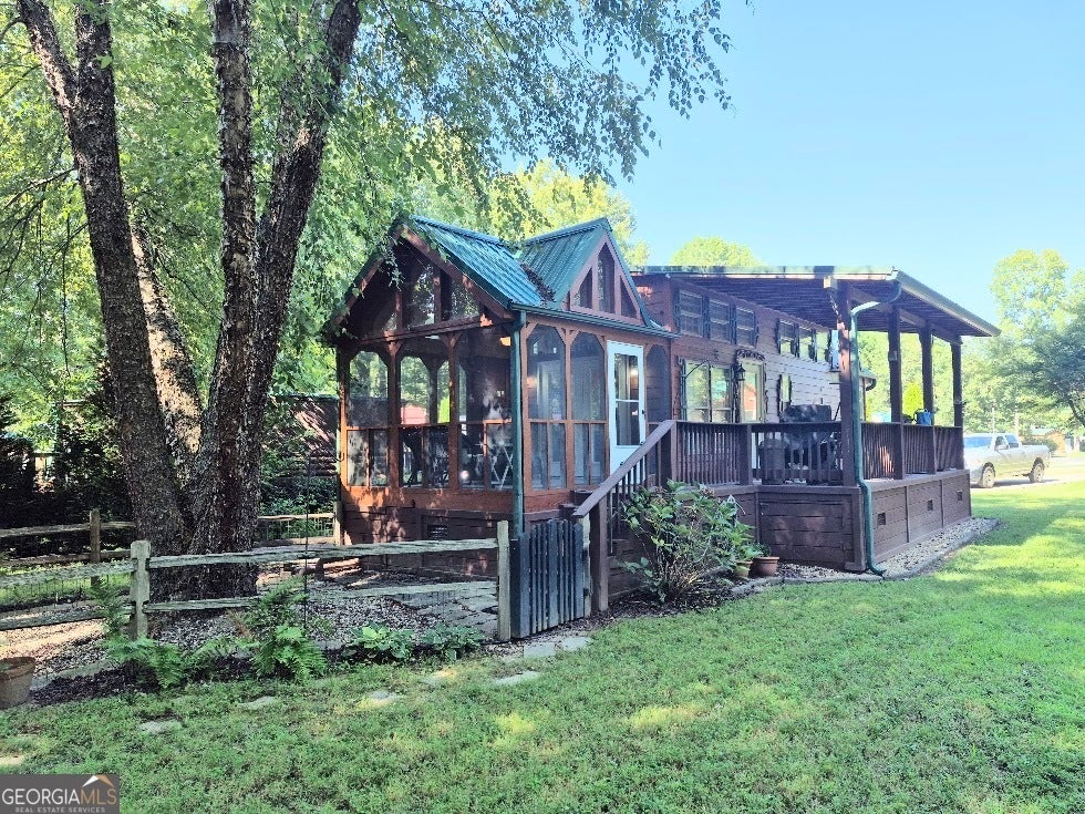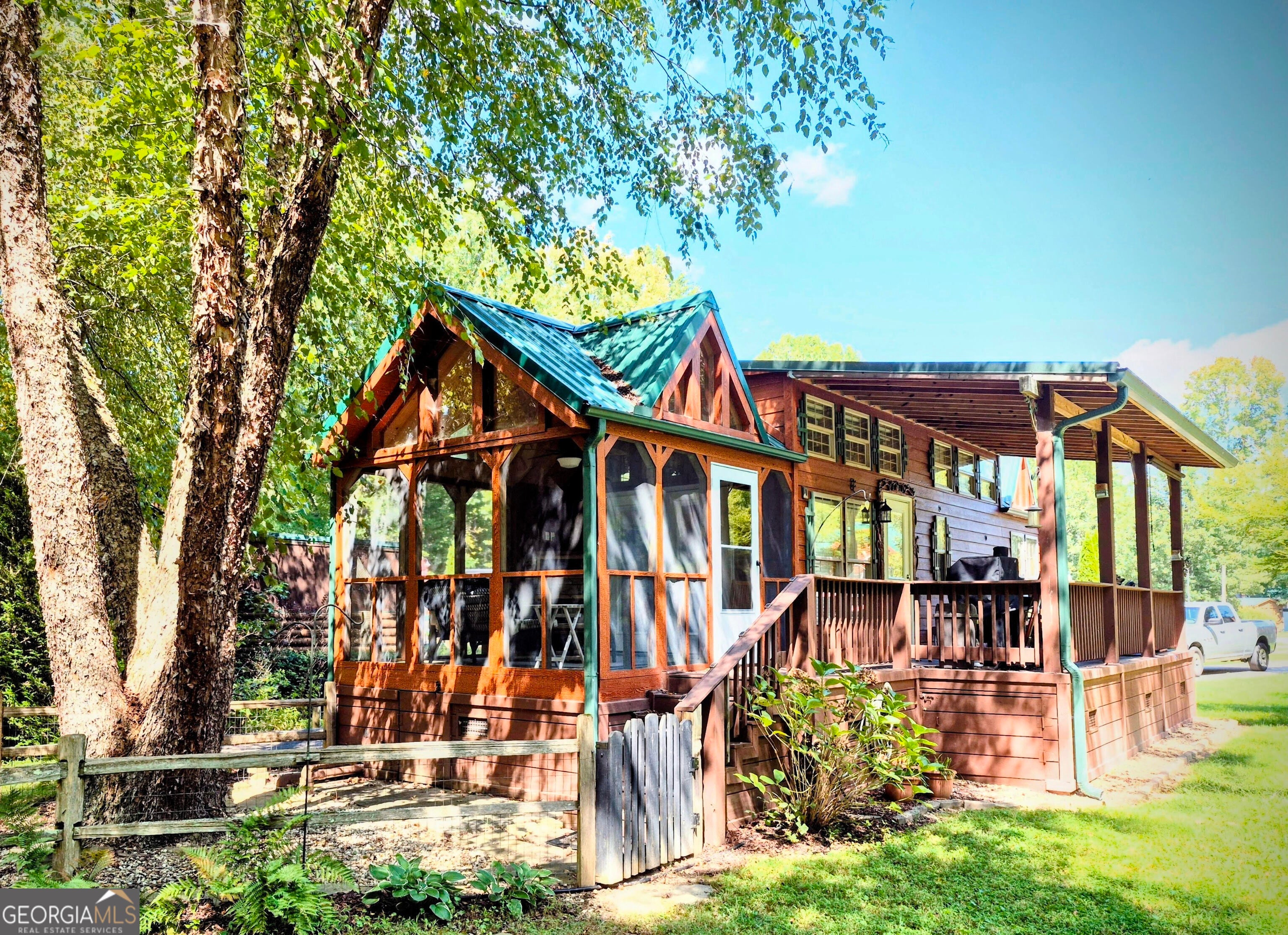 2016 Park Model Cabin with a 10x40 storage/workshop. Great screened porch with a fireplace. Bedroom has a king size bed and a closet with a washer and dryer and lots of storage. The loft area has two twin beds. There is a fenced area in the back. This lot is located in the back of the subdivision on a cul-de-sac with creek frontage. Gated community with swimming pool, work out building, community fire ring, laundromat and clubhouse. High speed fiber internet is available for $23/month.