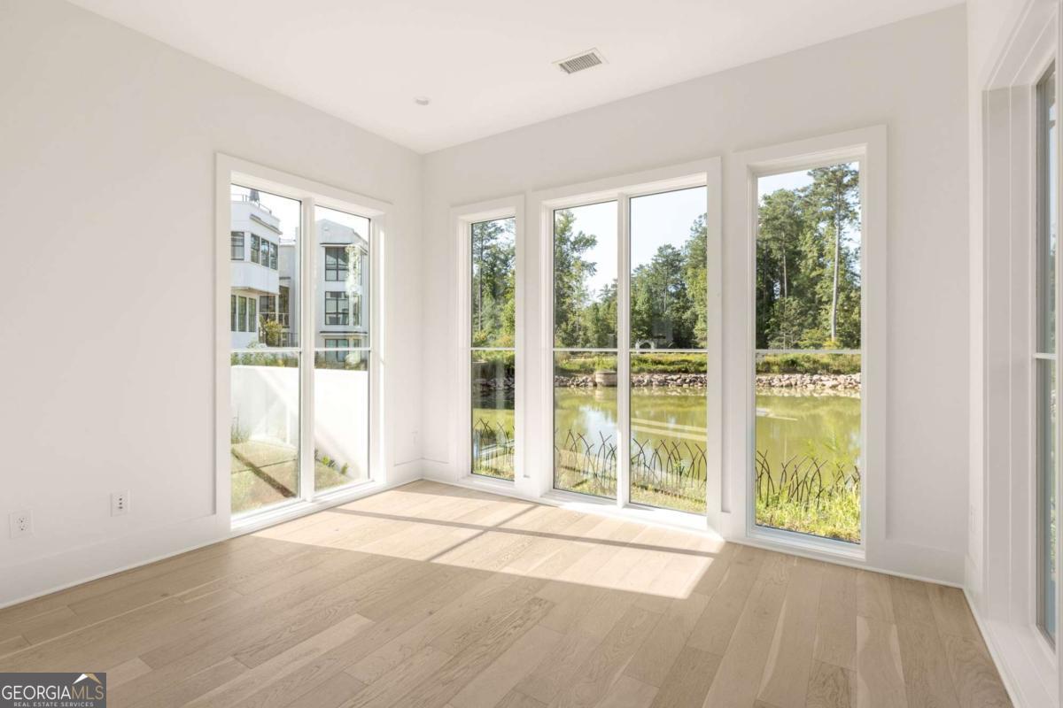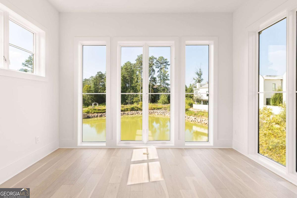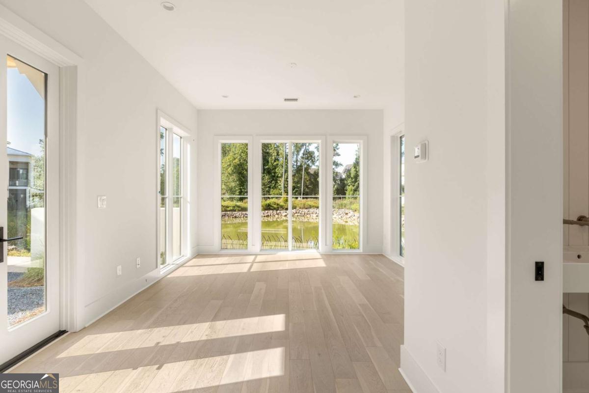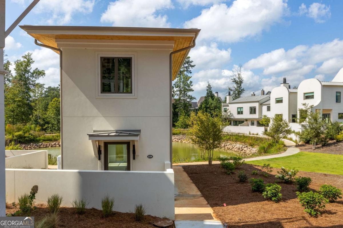 This adorable jewel box cottage on Mado Pond offers thoughtful design and peaceful waterfront living. The open floor plan blends living and dining spaces, highlighted by floor-to-ceiling windows that frame year-round pond views and Rachel Garceau's striking Mado Pond art installation. A spacious courtyard extends off the living room, ideal for al fresco entertaining. Upstairs, the primary suite includes a full bathroom and generous walk-in closet. Perfectly located next to the Mado Amphitheater, you can enjoy seasonal events like quiet evening music in the summertime and intimate community gatherings just right outside your front door. All of this within a short distance of Serenbe's wellness amenities and 20+ miles of protected forest nature trails.