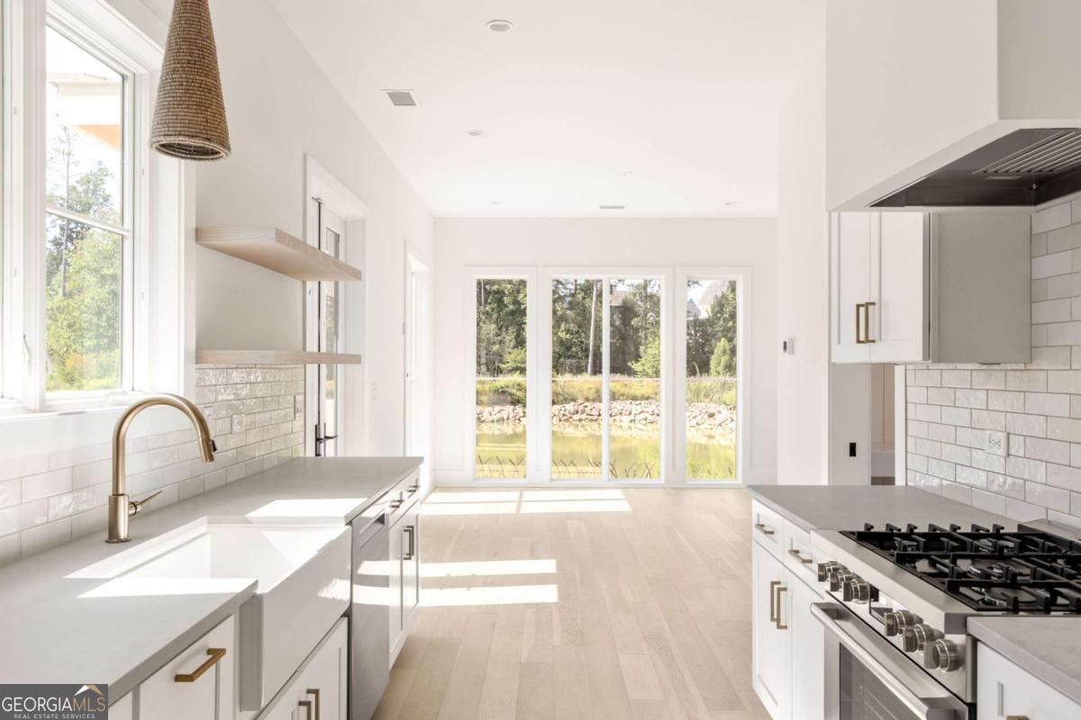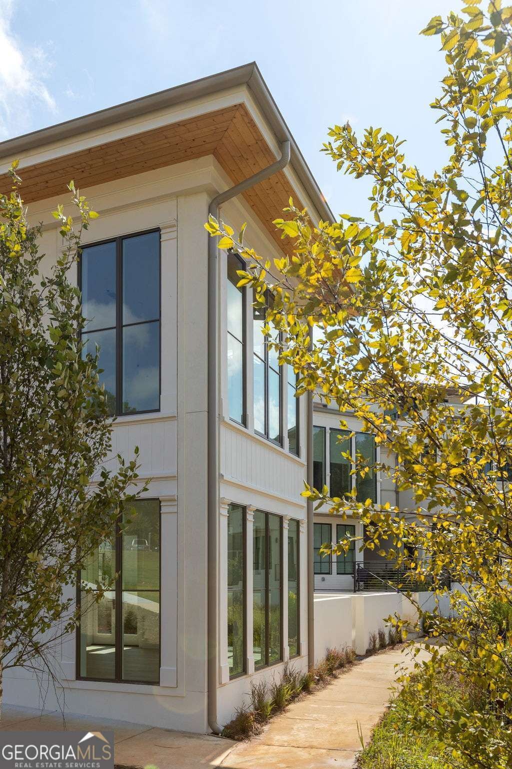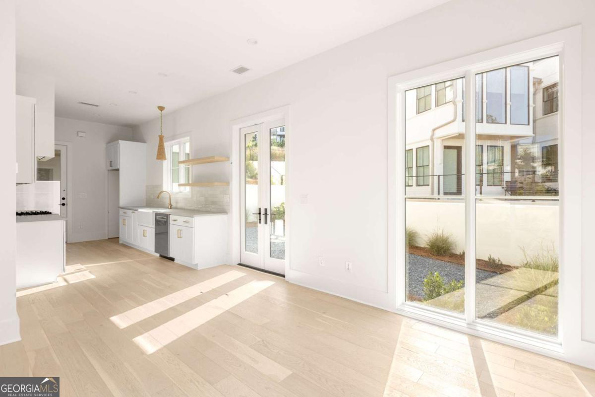 This adorable jewel box cottage on Mado Pond offers thoughtful design and peaceful waterfront living. The open floor plan blends living and dining spaces, highlighted by floor-to-ceiling windows that frame year-round pond views and Rachel Garceau's striking Mado Pond art installation. A spacious courtyard extends off the living room, ideal for al fresco entertaining. Upstairs, the primary suite includes a full bathroom and generous walk-in closet. Perfectly located next to the Mado Amphitheater, you can enjoy seasonal events like quiet evening music in the summertime and intimate community gatherings just right outside your front door. All of this within a short distance of Serenbe's wellness amenities and 20+ miles of protected forest nature trails.