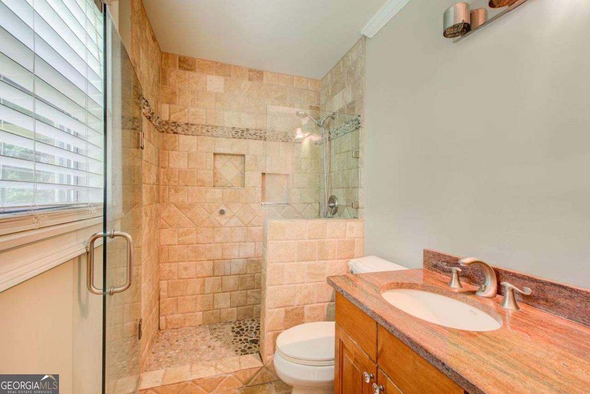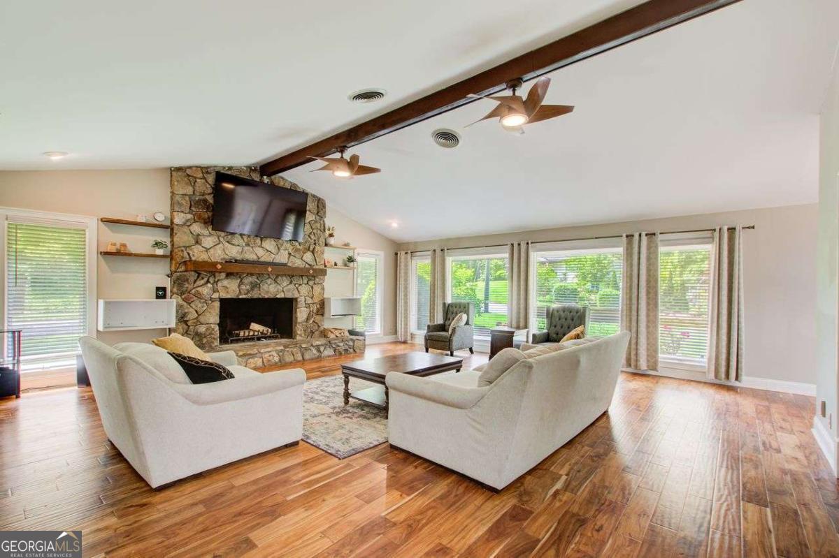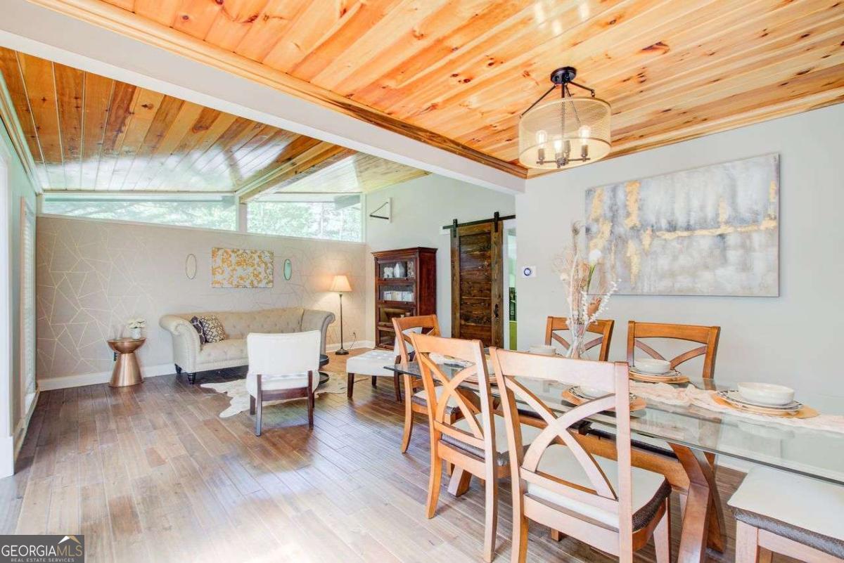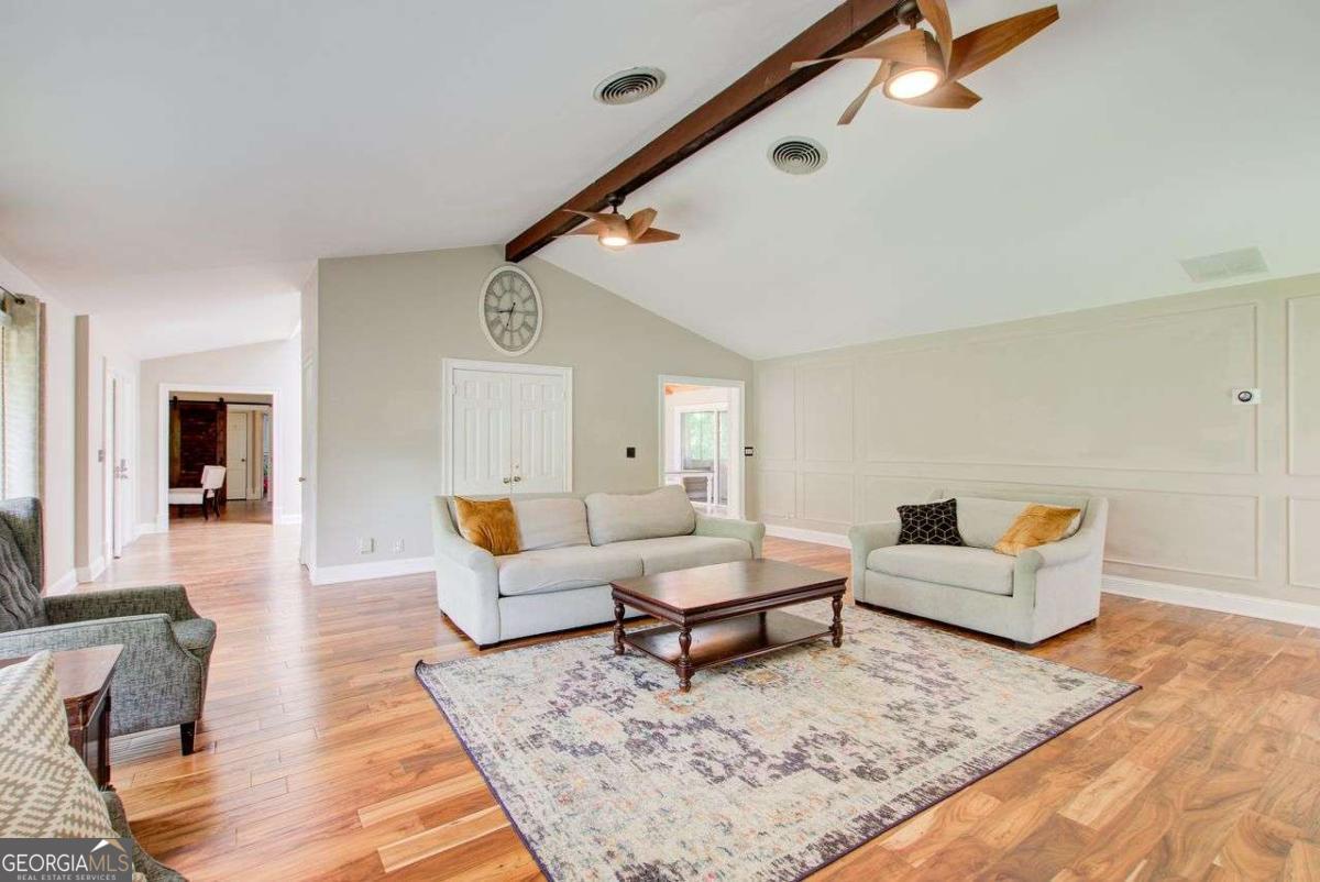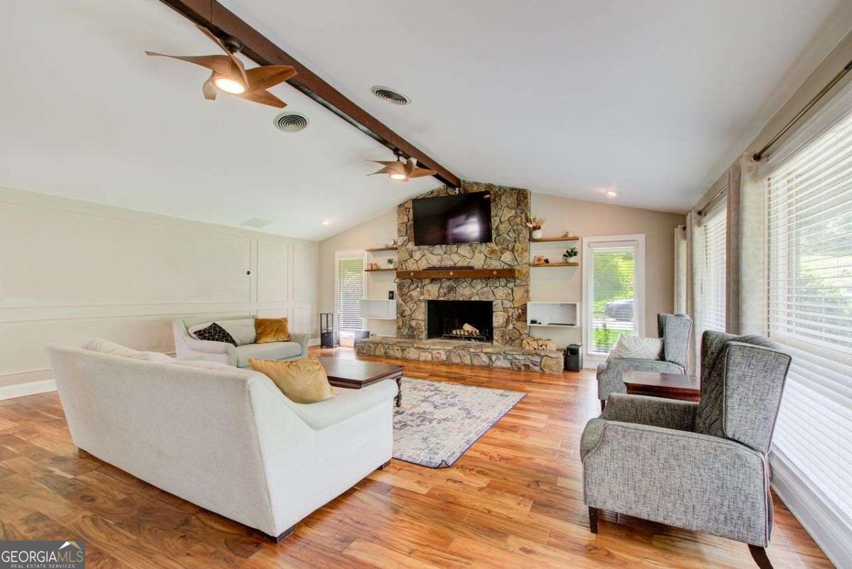 A Must See! Located in the Highly-Sought area of Smyrna, and just minutes away form the new Braves Stadium, this beautiful completely remodeled ranch home has an immaculate blend of modern luxury and timeless charm. Designed with meticulous attention to detail, features such as the exposed beam ceilings upon entry, paired with tongue and groove cedar ceilings throughout the dining room and kitchen gives this home a cozy, yet unique touch. In the family room, you will be greeted by an abundance of natural light streaming through expansive windows, illuminating the spacious interior. The remodeled eat- in kitchen boast new cabinets with granite countertops, travertine floors and a skylight over the dining area. The large primary bedroom has coffered ceilings and its own spa-like bathroom with a huge separate shower and jacuzzi soaker tub. Finished basement could be used as a rental apartment or in law suite. It has a kitchen, living room, bedroom and bathroom. This is a must see house, full of custom trim and charm. Wont last long!