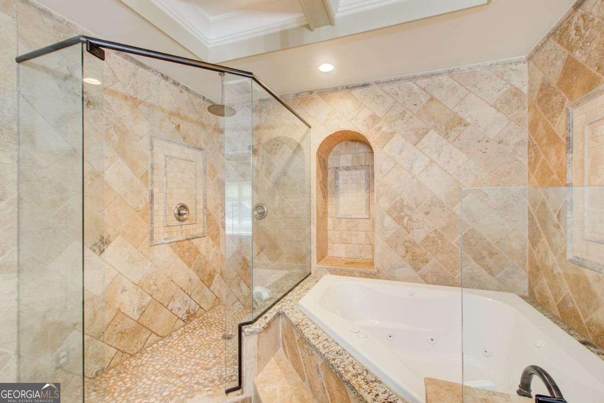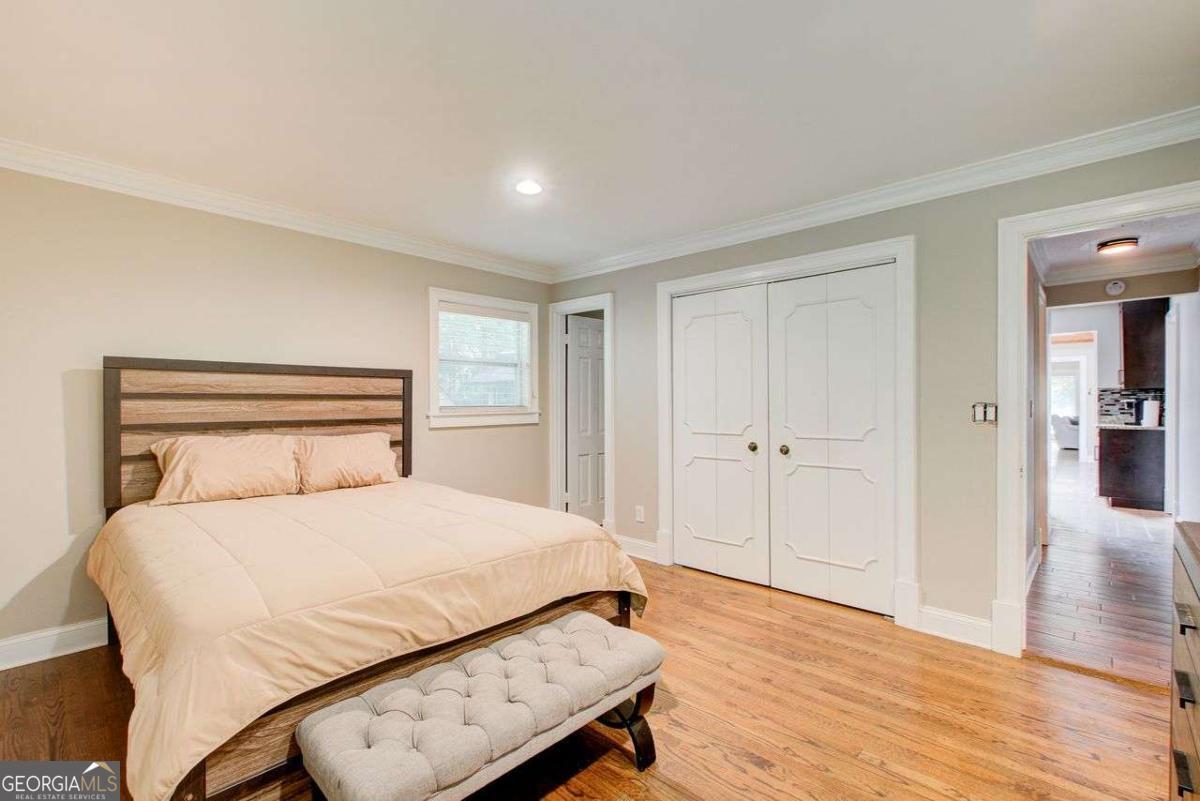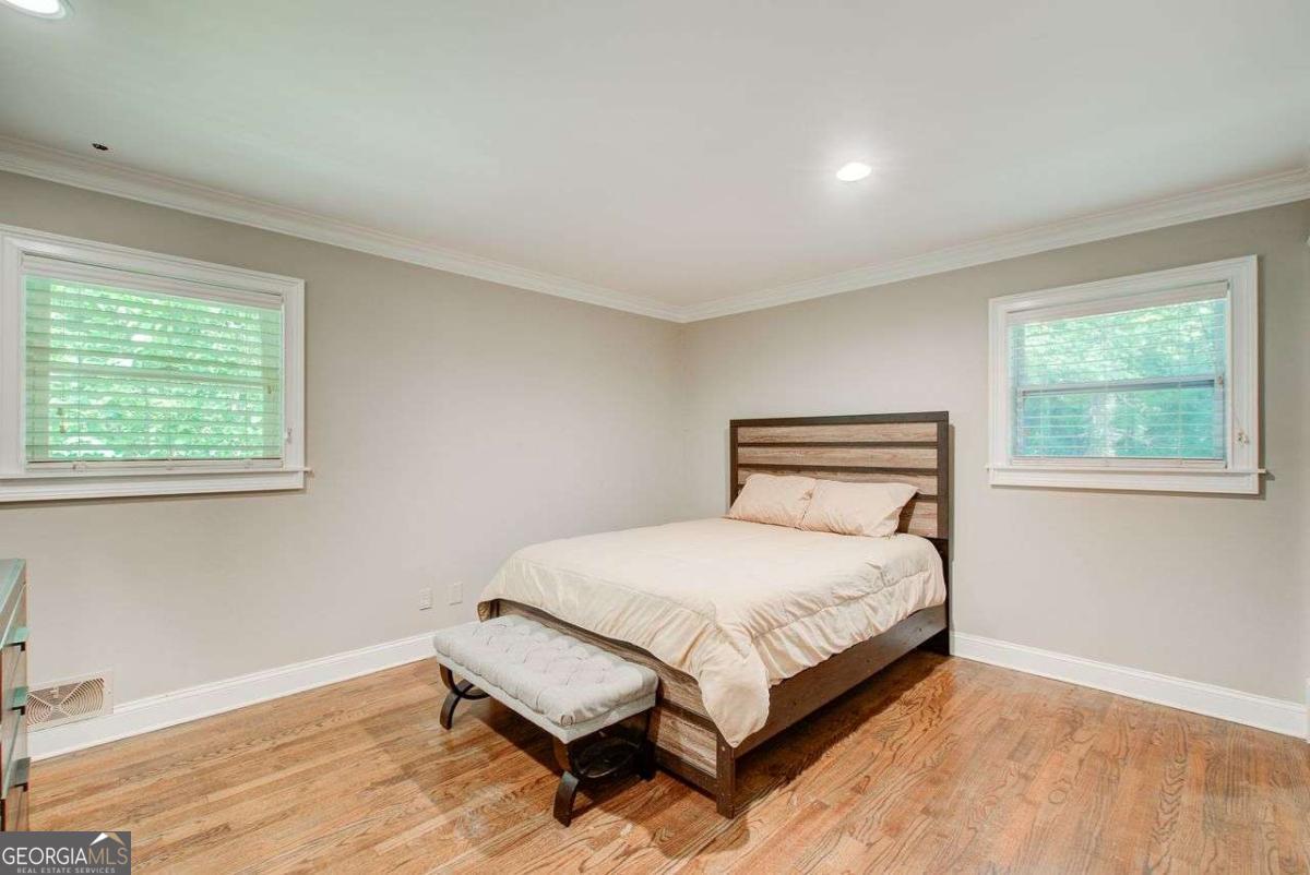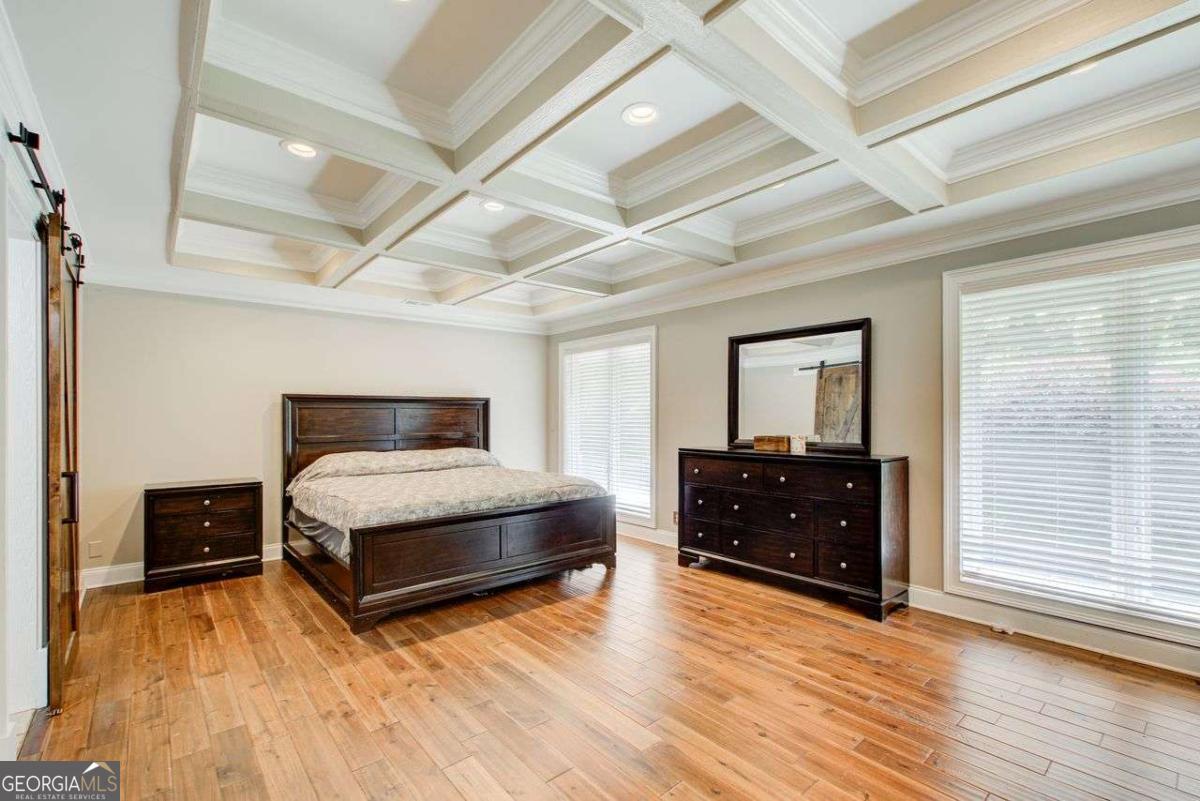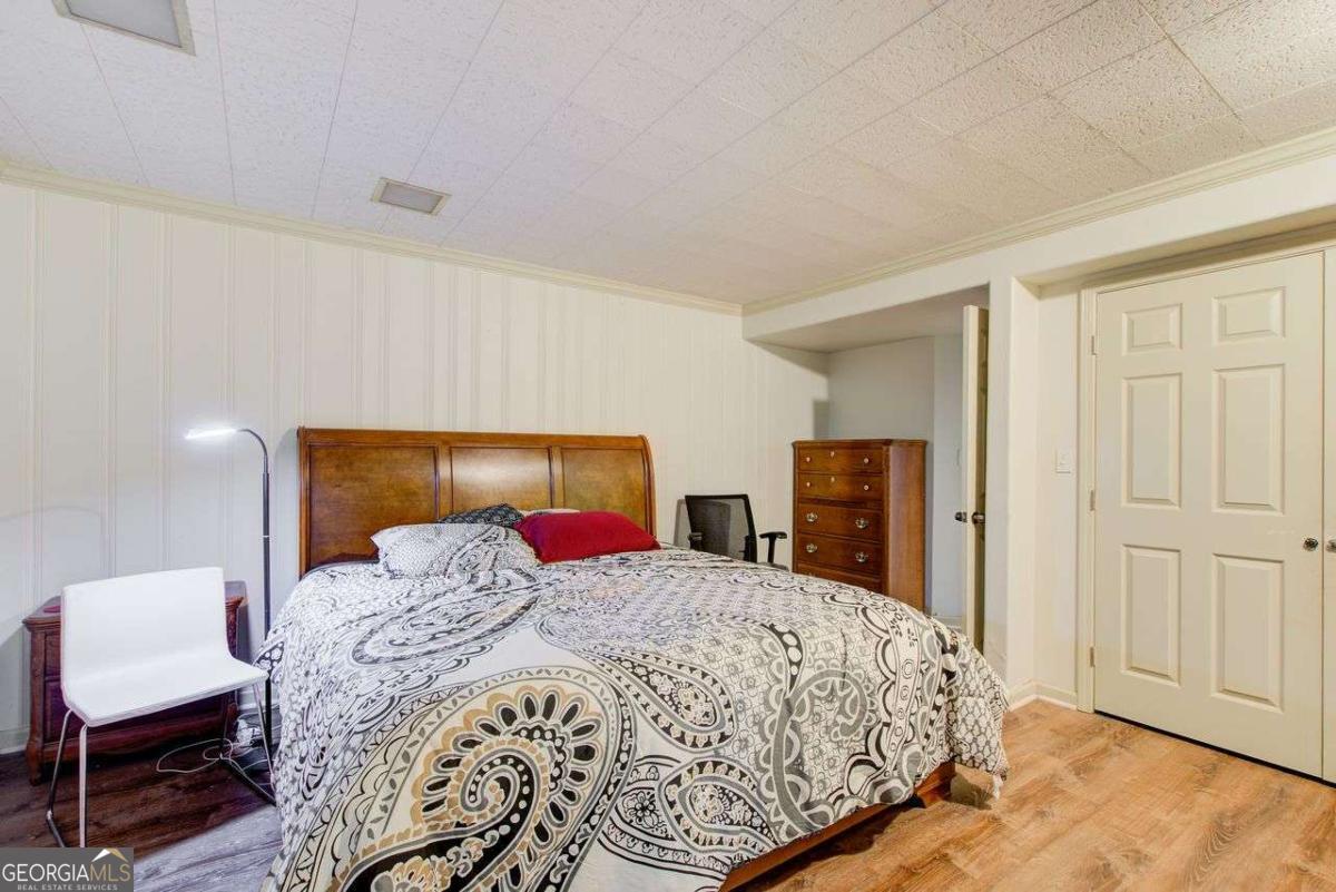 A Must See! Located in the Highly-Sought area of Smyrna, and just minutes away form the new Braves Stadium, this beautiful completely remodeled ranch home has an immaculate blend of modern luxury and timeless charm. Designed with meticulous attention to detail, features such as the exposed beam ceilings upon entry, paired with tongue and groove cedar ceilings throughout the dining room and kitchen gives this home a cozy, yet unique touch. In the family room, you will be greeted by an abundance of natural light streaming through expansive windows, illuminating the spacious interior. The remodeled eat- in kitchen boast new cabinets with granite countertops, travertine floors and a skylight over the dining area. The large primary bedroom has coffered ceilings and its own spa-like bathroom with a huge separate shower and jacuzzi soaker tub. Finished basement could be used as a rental apartment or in law suite. It has a kitchen, living room, bedroom and bathroom. This is a must see house, full of custom trim and charm. Wont last long!