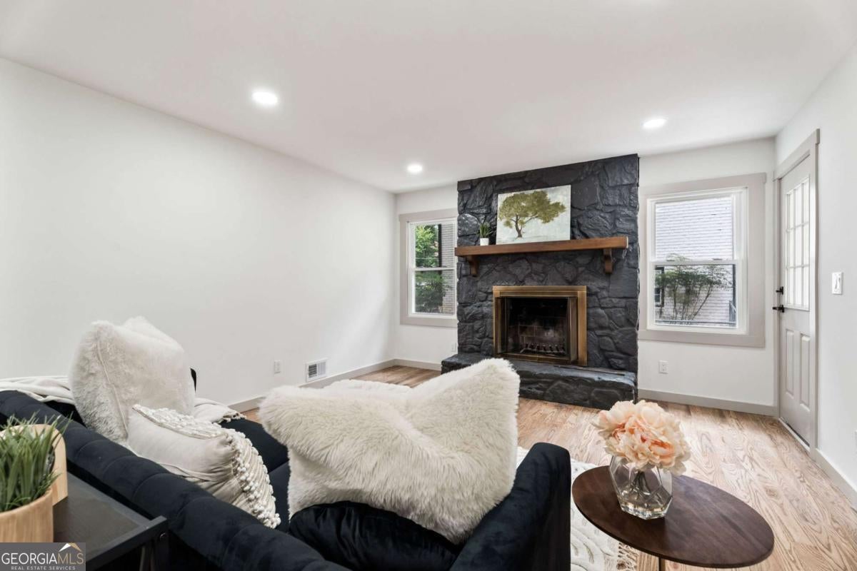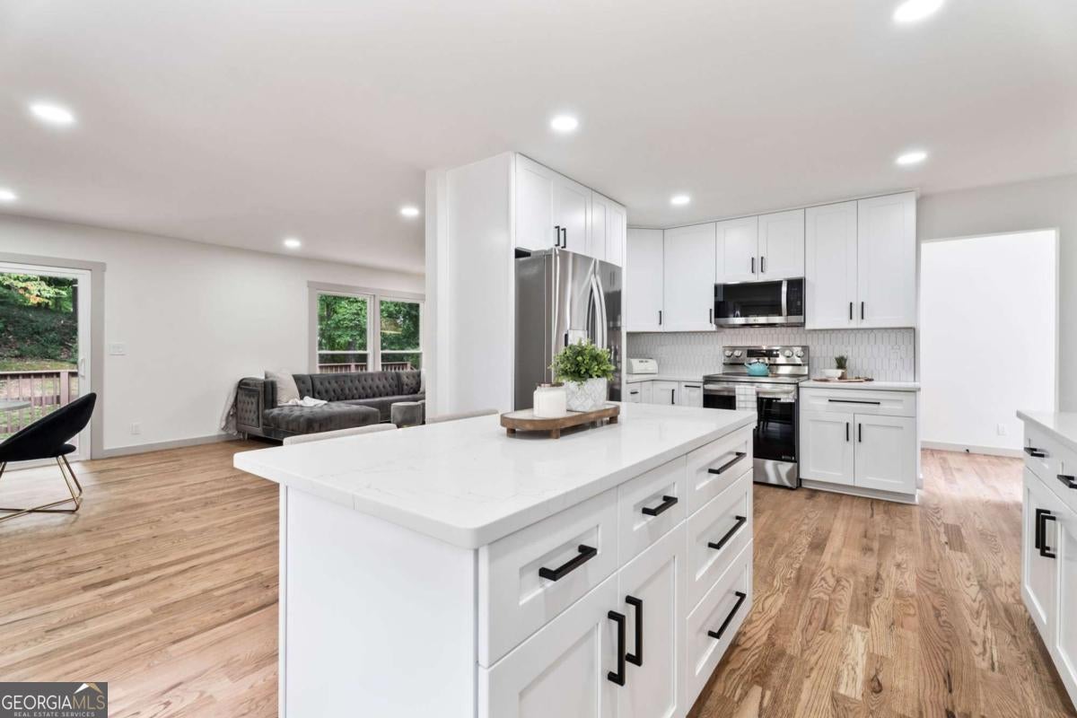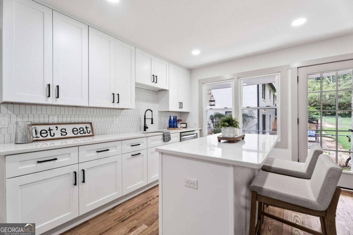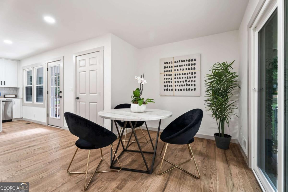 Price Improvement!--Rare chance for true one-level living near top schools and Dunwoody Village! This beautifully reimagined 1970 ranch feels brand new with updates from the roof to the driveway and everything in between. Enter through elegant glass and iron double doors into a bright, open floor plan with 5" white oak floors and natural light streaming in from every angle. The all-new kitchen features abundant cabinetry, quartz countertops, stainless steel appliances, a walk-in pantry, and a charming side patio perfect for morning coffee. The spacious living room opens to a deck overlooking a lush, private 0.45 acre yard. A cozy family room with a gas fireplace offers the perfect retreat. The main level includes three bedrooms with hardwood floors, two fully renovated baths, and a generous laundry room with cabinets and sink. The terrace level is ideal for entertaining or multi-generational living, complete with a bedroom, brand-new bath, kitchenette, media room, workout/flex space, and plenty of storage. Located just 1 mile from Dunwoody Village shopping and dining, and within 1 mile of highly rated Vanderlyn Elementary and Dunwoody High. Move right in, every renovation has already been done for you!