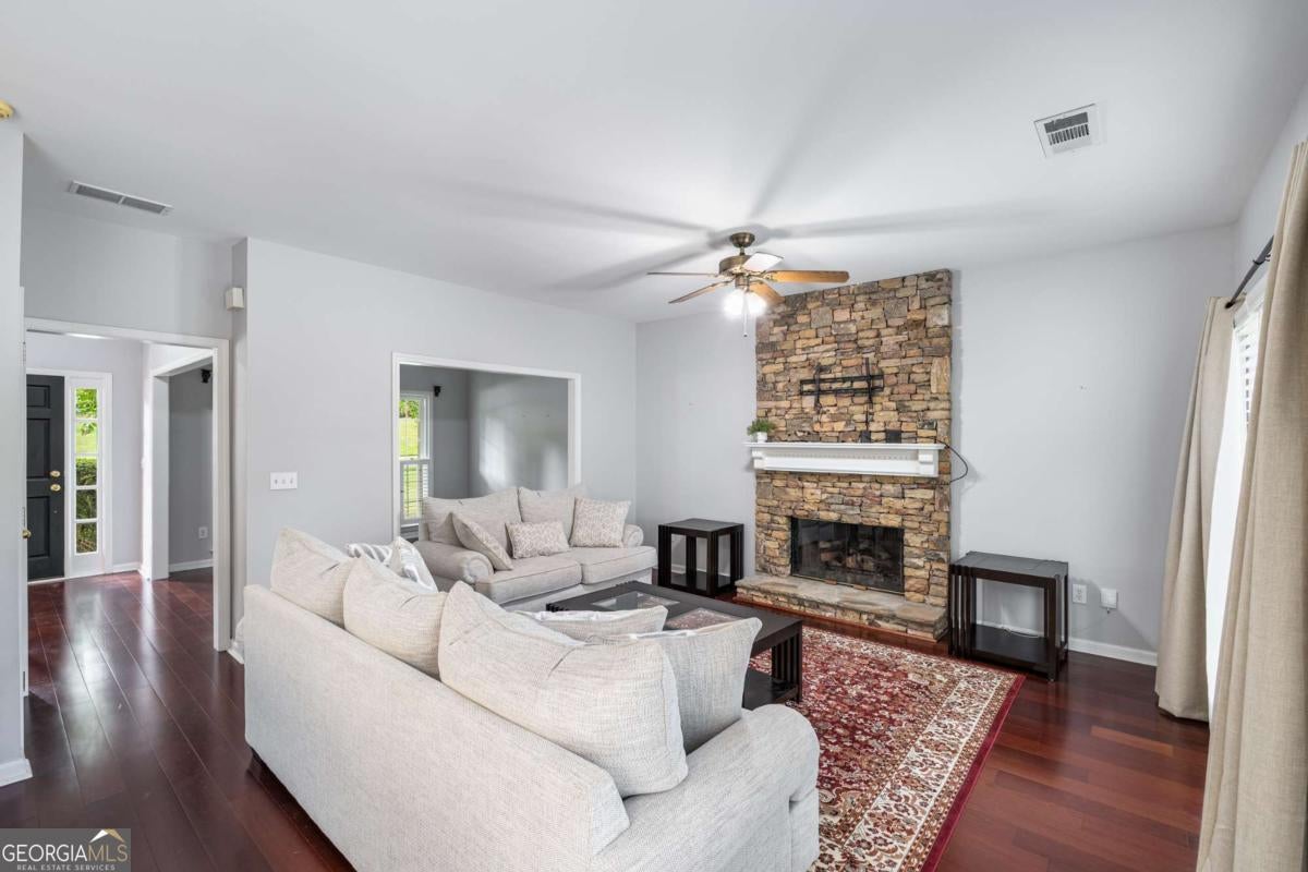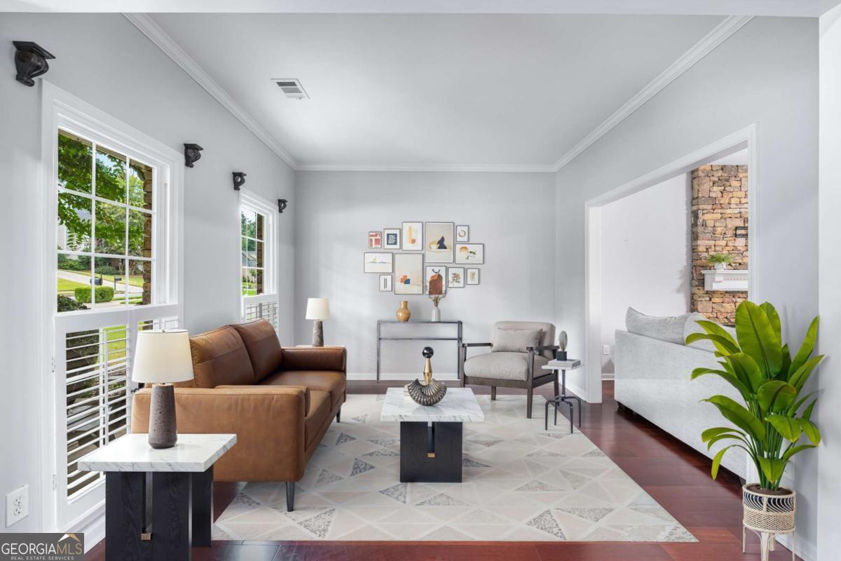 This 4-bedroom, 2.5-bath home boasts timeless style with modern convenience, perfectly positioned in one of Alpharetta's most desirable communities. From the moment you enter, you're greeted by a gracious formal dining room and formal living room, perfect for hosting memorable gatherings or creating a quiet retreat. The heart of the home is the open-concept family room and kitchen, anchored by a stunning stacked-stone fireplace and framed by a wall of windows that flood the space with natural light. The kitchen is designed to inspire your culinary masterpieces and cooking conversations, featuring stainless steel appliances, dual-oven gas range, generous prep and storage space, and a refrigerator with a unique flex door that adapts to your needs. The bar seating is perfect for casual bites, while the sunny bay-window breakfast nook invites you to linger over coffee with serene backyard views. Upstairs, the owner's suite is a private sanctuary with a tray ceiling, spacious sitting area, and a spa-like en suite bath complete with dual vanities, a soaking tub, and a glass-enclosed shower. Three additional bedrooms provide flexibility for family, guests, or work-from-home needs. Step outside to enjoy a private patio, perfect for outdoor dining, quiet evenings under the stars, or weekend barbecues. A backyard shed adds practical storage for gardening or outdoor equipment. The community offers all the things you've been looking for including a pool, tennis courts, and a playground- endless opportunities for recreation and connection. Families will appreciate being in the highly sought-after Chattahoochee High School district, with Webb Bridge Park, local shops, dining, and everyday conveniences only minutes away. Some photos have been virtually staged.