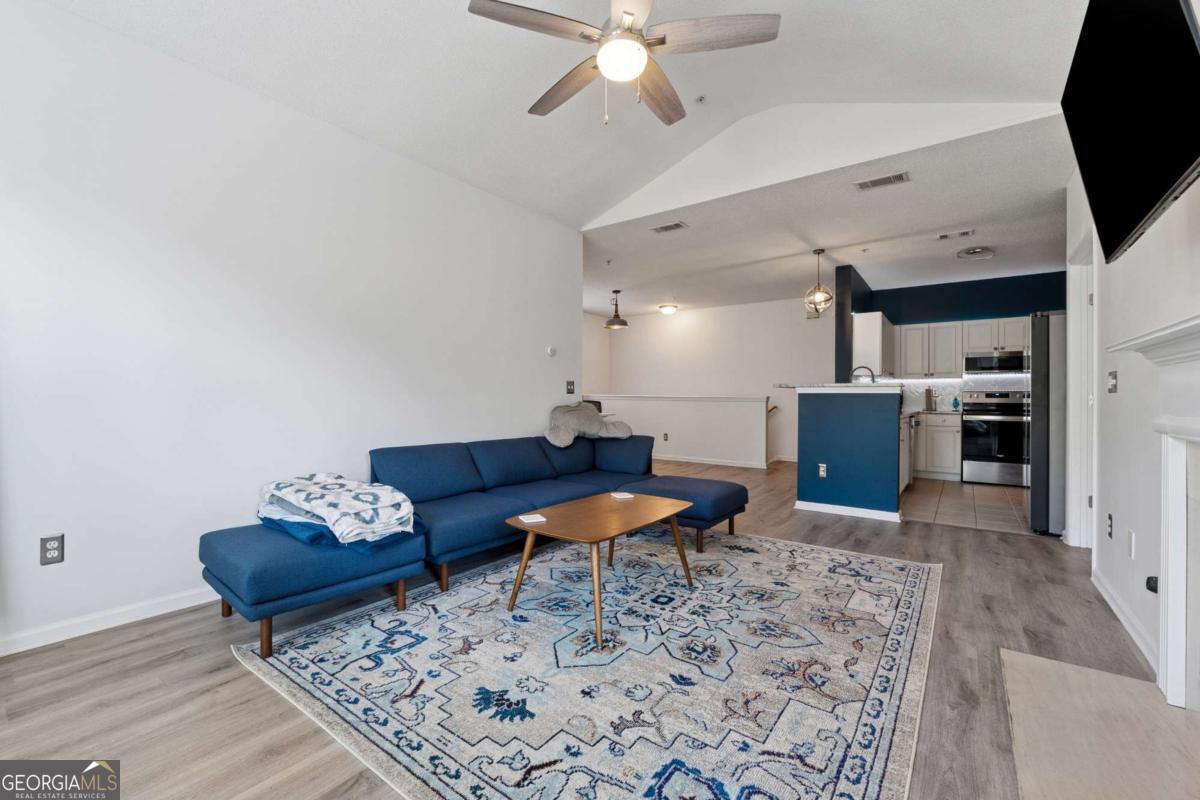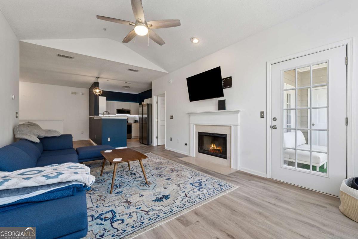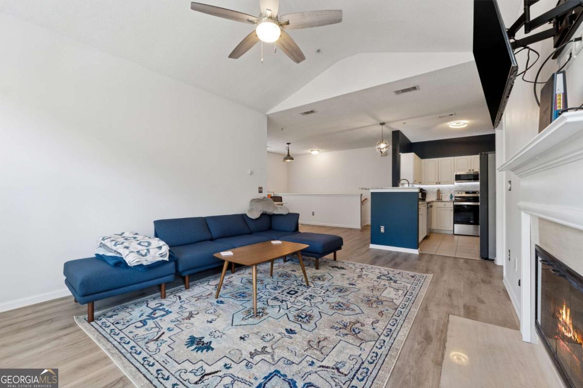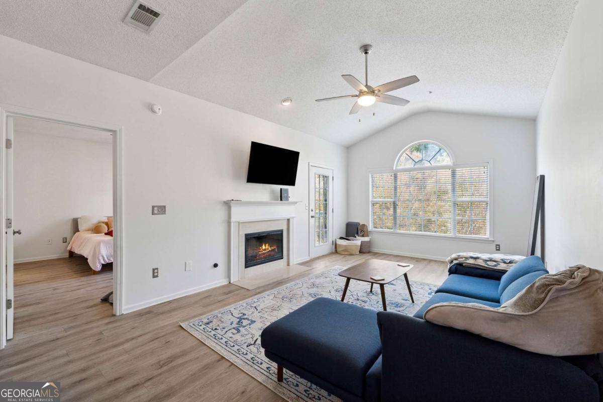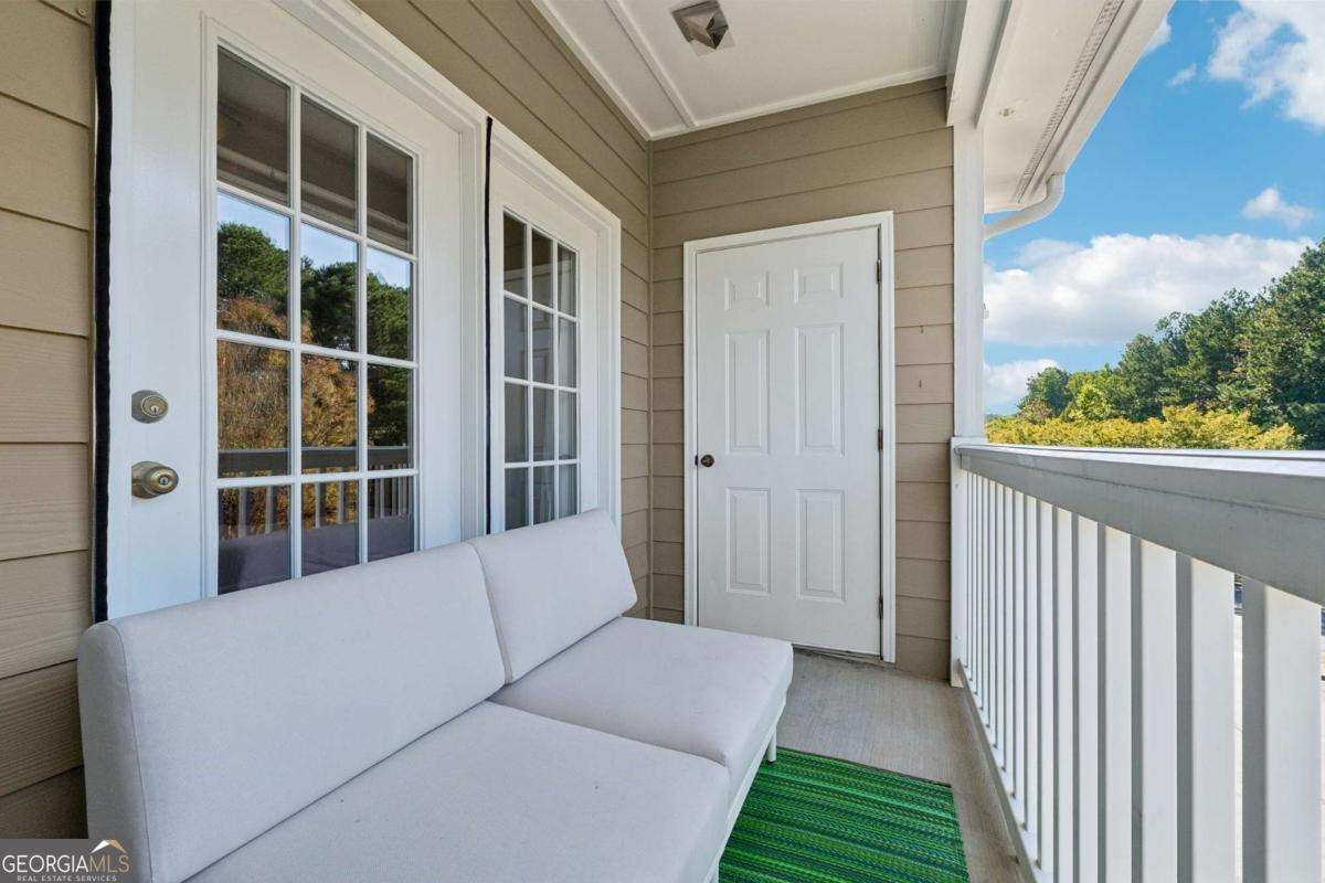 Welcome to your DREAM home nestled in the serene, gated Woodlands At Webb Bridge community. This beautifully updated condo sits in an unbeatable location, just steps from DOWNTOWN Alpharetta and AVALON. Enjoy upscale living at an affordable price in one of North Fulton's most sought-after neighborhoods! Thoughtful split-bedroom floor plan ensures privacy, with a PRIMARY suite featuring custom walk-in closets and romantic French doors opening to a private balcony. Newly installed hardwood-like floors, quartzite countertops, stylish backsplash, and stainless steel appliances create a sophisticated and inviting atmosphere. A NEWER HVAC unit and roof add peace of mind. The fireside family room flows seamlessly into an open-concept dining area and a sleek white kitchen with a breakfast bar, perfect for entertaining guests or COZY nights in. Savor morning coffee on the covered front porch or unwind on the PRIVATE balcony with tranquil wooded views. Additional storage off the patio keeps things organized. Enjoy GATED security, a clubhouse, sparkling pool, and pet-friendly walking paths, including a charming trail to Avalon. Perfect for those who love both city vibrancy and outdoor escapes. Includes a 1-car GARAGE, driveway, and ample unassigned parking spaces nearby for guests or roommates. Located just minutes from Avalon's upscale shopping, dining, and entertainment, and a short stroll to Downtown Alpharetta's vibrant farmer's market, concerts, and Alpha Loop trails, this condo offers the best of both worlds. Explore the nearby Greenway Trail for biking or hiking, or enjoy the quiet charm of this gated community with serene, wooded surroundings. With EASY access to GA-400, you're perfectly positioned for work or play. This meticulously maintained condo is move-in ready, offering affordable luxury with modern upgrades and low-maintenance living. Ideal for professionals, small families, or roommates, it's a rare opportunity to own in a prime Alpharetta location. Don't miss your chance to experience the perfect balance of urban excitement and suburban tranquility!