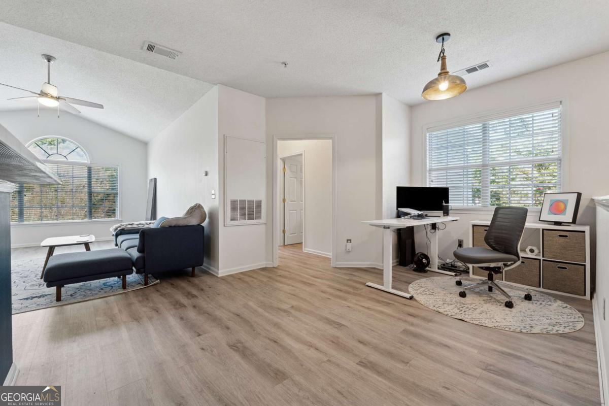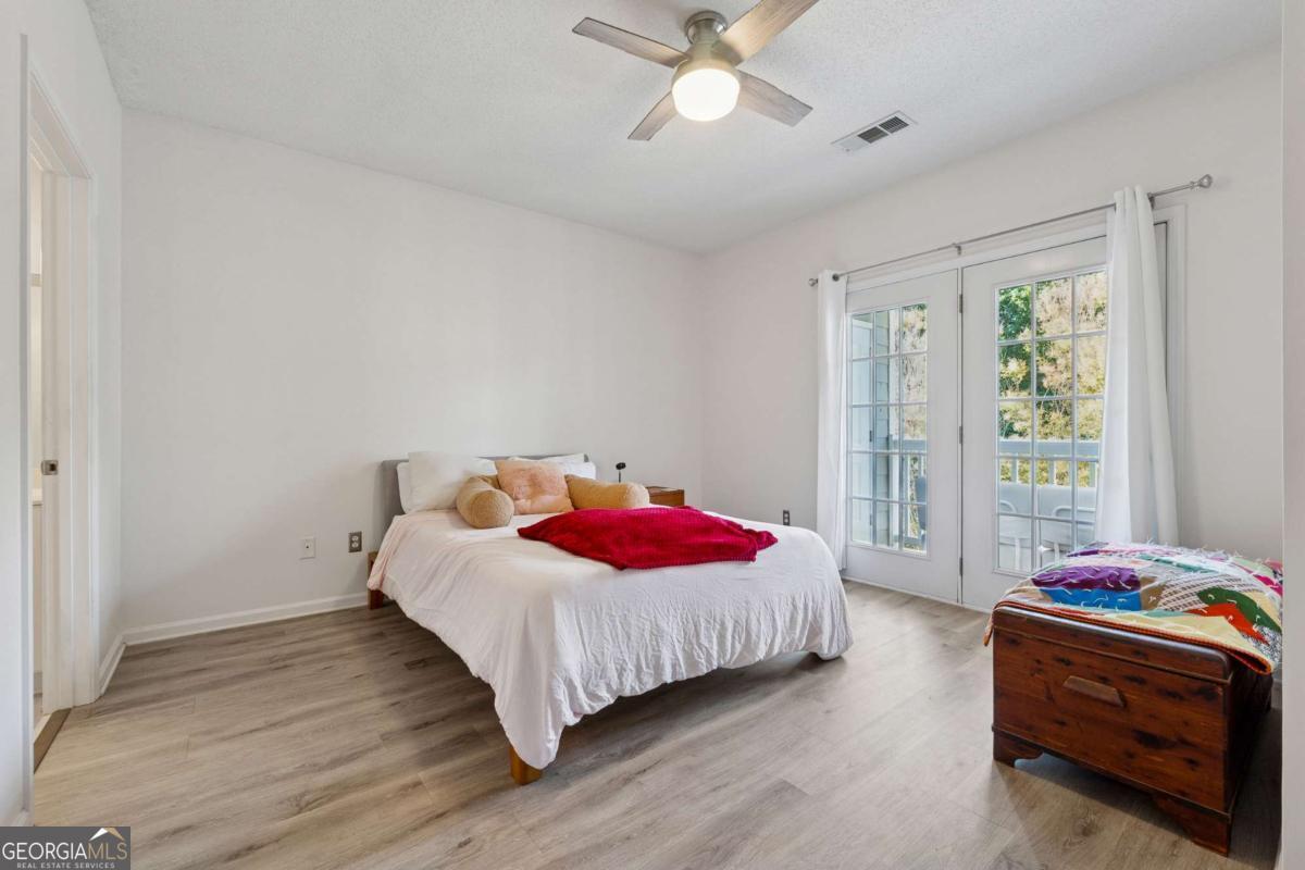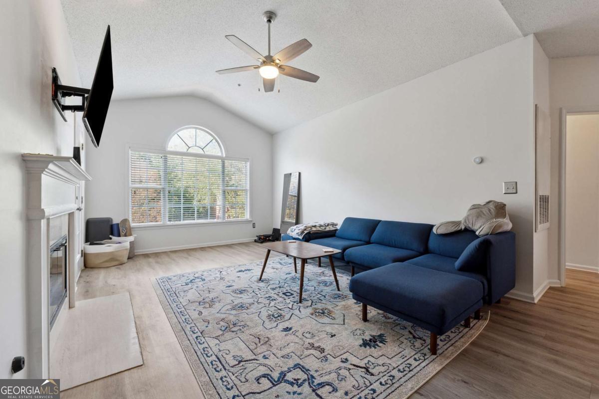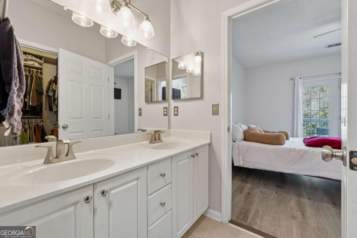 Welcome to your DREAM home nestled in the serene, gated Woodlands At Webb Bridge community. This beautifully updated condo sits in an unbeatable location, just steps from DOWNTOWN Alpharetta and AVALON. Enjoy upscale living at an affordable price in one of North Fulton's most sought-after neighborhoods! Thoughtful split-bedroom floor plan ensures privacy, with a PRIMARY suite featuring custom walk-in closets and romantic French doors opening to a private balcony. Newly installed hardwood-like floors, quartzite countertops, stylish backsplash, and stainless steel appliances create a sophisticated and inviting atmosphere. A NEWER HVAC unit and roof add peace of mind. The fireside family room flows seamlessly into an open-concept dining area and a sleek white kitchen with a breakfast bar, perfect for entertaining guests or COZY nights in. Savor morning coffee on the covered front porch or unwind on the PRIVATE balcony with tranquil wooded views. Additional storage off the patio keeps things organized. Enjoy GATED security, a clubhouse, sparkling pool, and pet-friendly walking paths, including a charming trail to Avalon. Perfect for those who love both city vibrancy and outdoor escapes. Includes a 1-car GARAGE, driveway, and ample unassigned parking spaces nearby for guests or roommates. Located just minutes from Avalon's upscale shopping, dining, and entertainment, and a short stroll to Downtown Alpharetta's vibrant farmer's market, concerts, and Alpha Loop trails, this condo offers the best of both worlds. Explore the nearby Greenway Trail for biking or hiking, or enjoy the quiet charm of this gated community with serene, wooded surroundings. With EASY access to GA-400, you're perfectly positioned for work or play. This meticulously maintained condo is move-in ready, offering affordable luxury with modern upgrades and low-maintenance living. Ideal for professionals, small families, or roommates, it's a rare opportunity to own in a prime Alpharetta location. Don't miss your chance to experience the perfect balance of urban excitement and suburban tranquility!