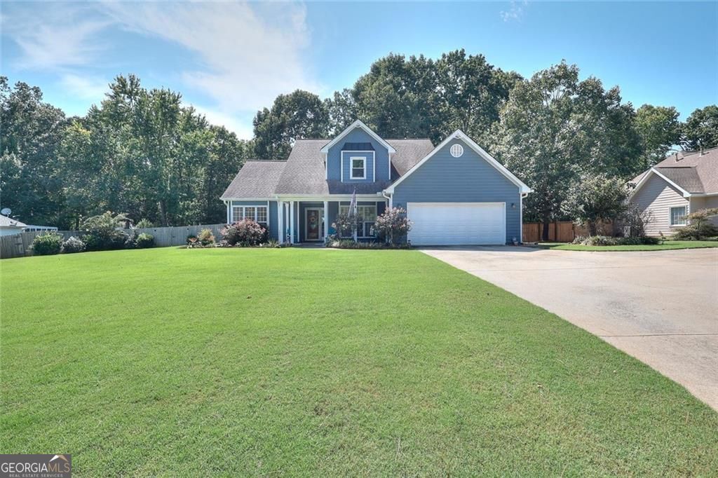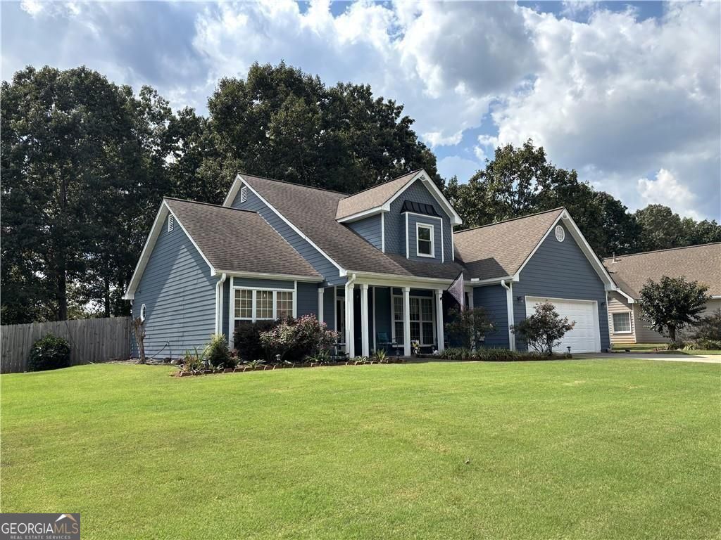 Discover your new Home with a peaceful setting on over a 1/2 Acre fenced lot with an inviting covered front porch! Plenty of possibilities exist in this all electric property that has many updates including many new windows, new flooring upstairs and in the sunroom. Two story foyer and Family room exuding abundant natural light, a double sided fireplace and gorgeous flooring connects to the Eat in Granite Kitchen with more than enough cabinet space. Kitchen has SS appliances and quick access to sunroom and to your own separate Dining room to gather together with family and friends. Your great sized Owner's suite on the main has vaulted ceiling, soaking tub, separate shower, and dual vanity. A half bath for guests and laundry room complete the main level. Upstairs are your 2 spacious secondary bedrooms and hall bath. Whole attic storage provides options for expanding. You'll enjoy one of the best back yards ever with landscaping, nature, a fire pit, storage shed, and sunsets to enjoy for years to come!