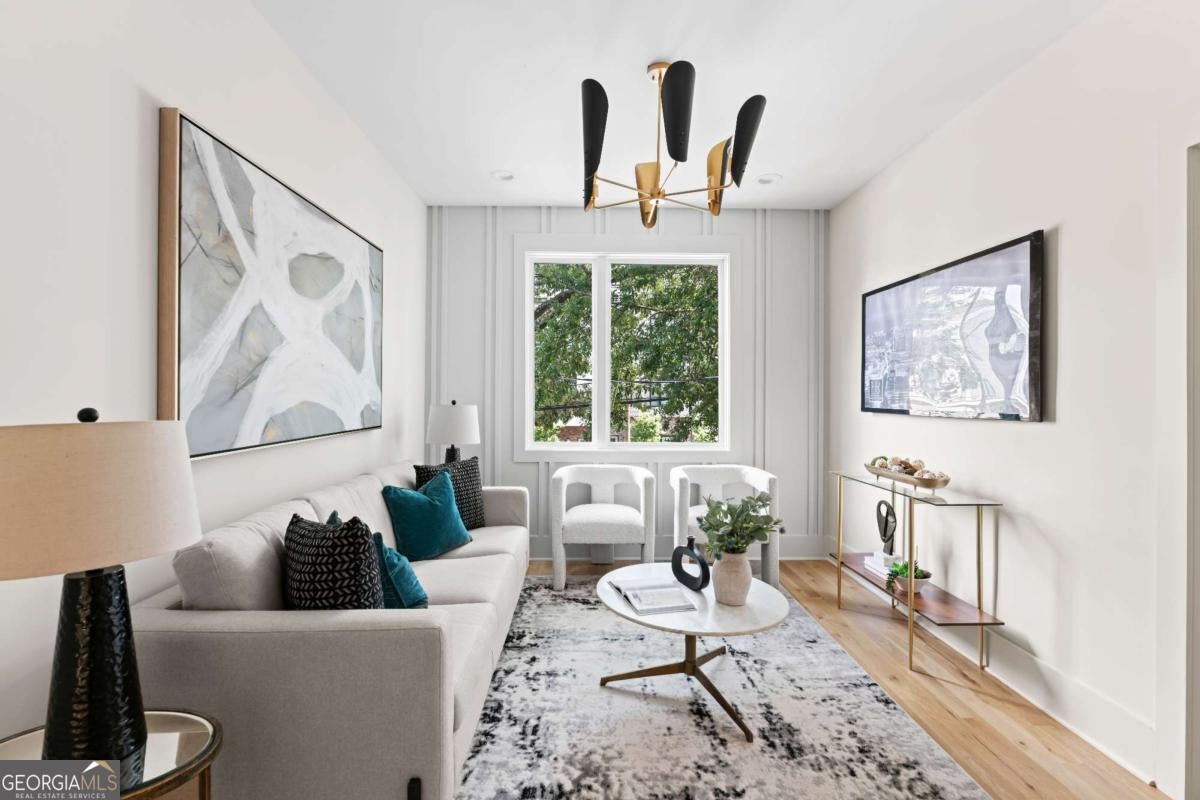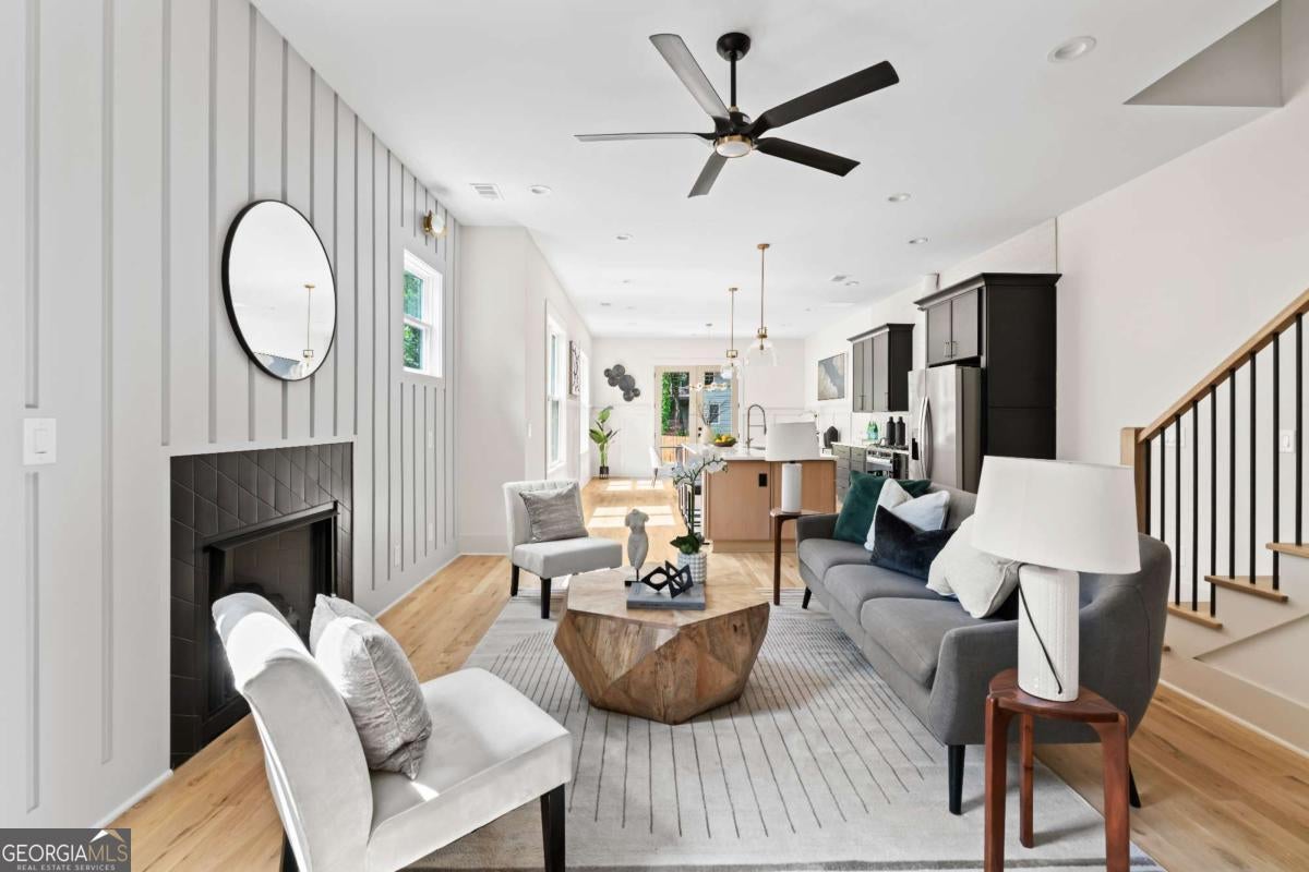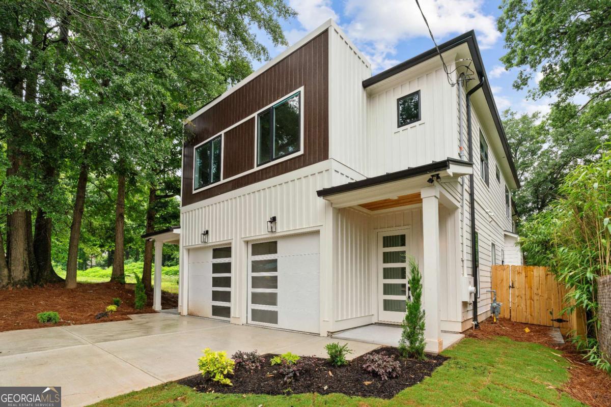 Elegant new construction with a private fenced yard, at a hard-to-find price point. Enter the wide front foyer to soaring 10-foot ceilings and stunning finishes in this well-designed townhouse. The open floorplan boasts accent walls, custom lighting and plumbing fixtures, and natural hardwood floors. Don't miss the upgraded "thin" shaker cabinets and oversized quartz island in this impressive kitchen. Separate, but open, dining area flows seamlessly to the back patio and the ample backyard! The open living room is anchored by a cozy fireplace with quartz surround. Main level also features a stylish half bath, mudroom with built-ins, and attached garage, with 240-volt plug-in for electric vehicles. Upstairs you will be wowed by the bonus loft living area, three bedrooms and two more bathrooms. The primary suite will not disappoint - accent walls, sunny bath with dual vanity, dual shower heads and upgraded finishes, and a large private porch with treetop views so peaceful you might forget you're minutes from the Beltline, Madison Yards, Edgewood Retail District, Ponce City Market, and much more. Intown living at its finest!